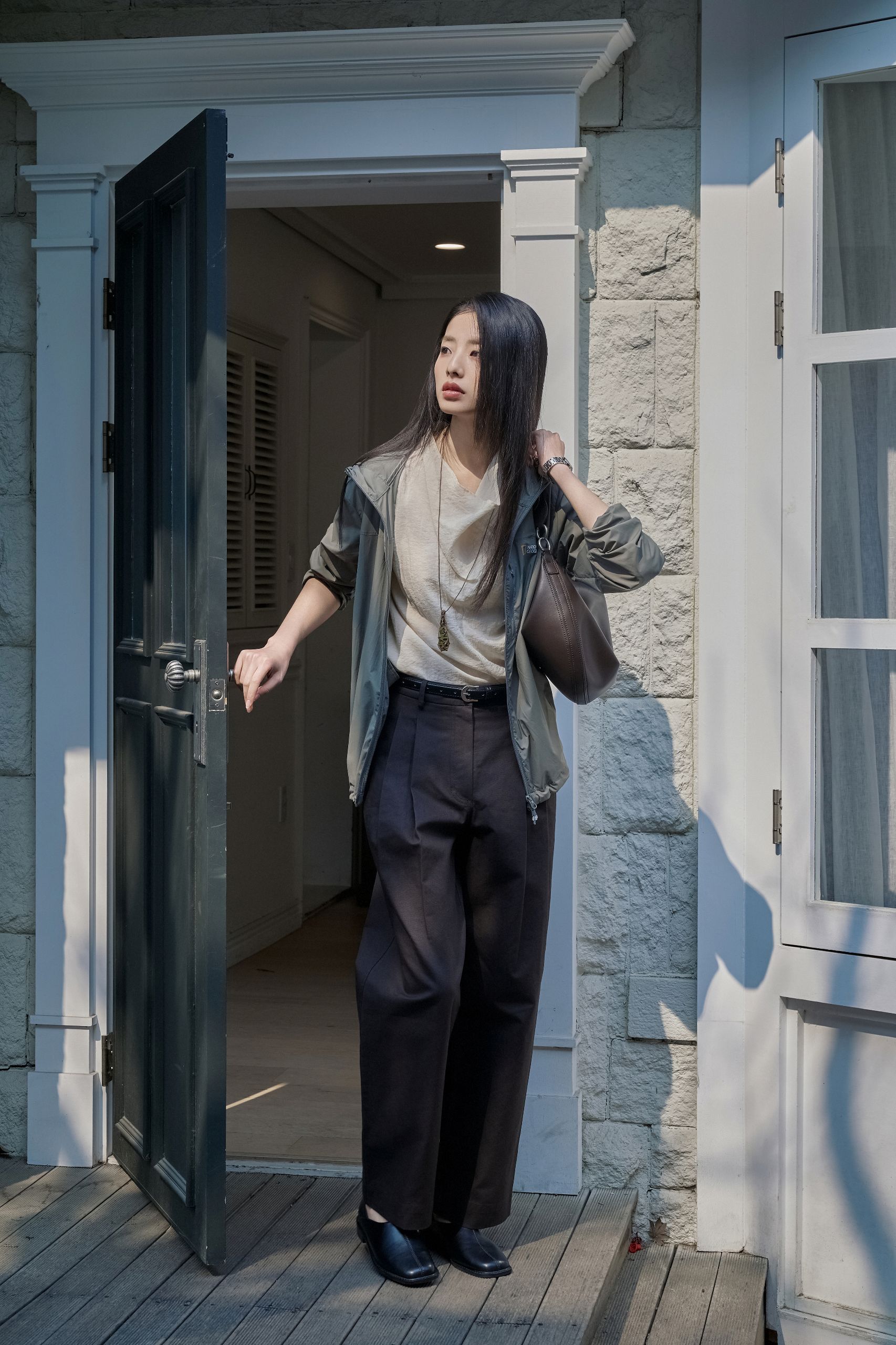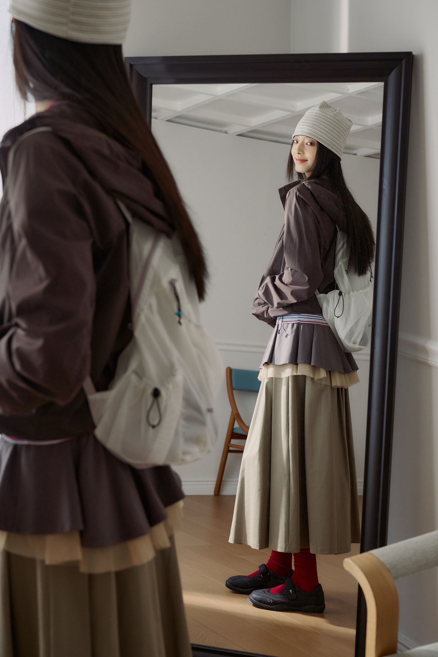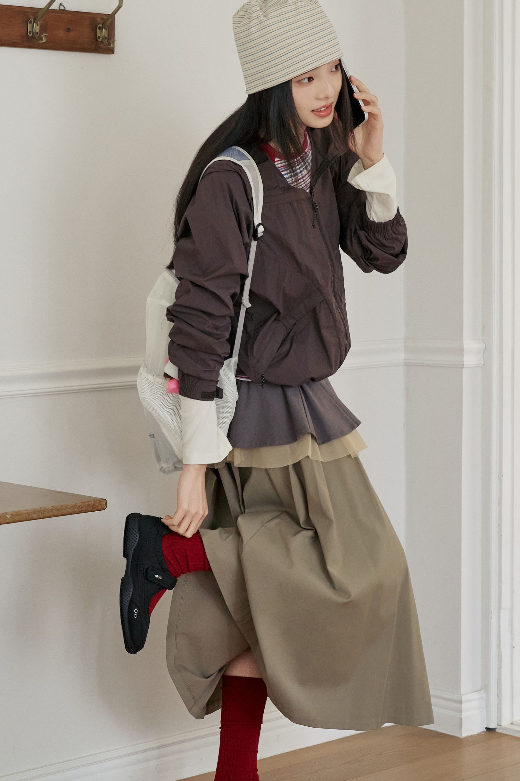 갑자기 나오라는 친구의 전화. 너무 꾸민 것처럼 보이긴 싫지만, 그렇다고 대충 입고 나설 수도 없죠. 캐주얼한 티셔츠와 맥시 스커트를 선택했다면 비슷한 톤의 바람막이를 가볍게 걸쳐보세요. 같은 색감 안에서 명도만 달리해도 과하지 않으면서 자연스러운 레이어드 룩이 완성돼요. 이때 밑단 스트링은 살짝 조여 실루엣에 변화를 주는 것이 포인트. 오늘따라 핸드폰 카메라를 자주 켜게 될지도 모르겠어요.