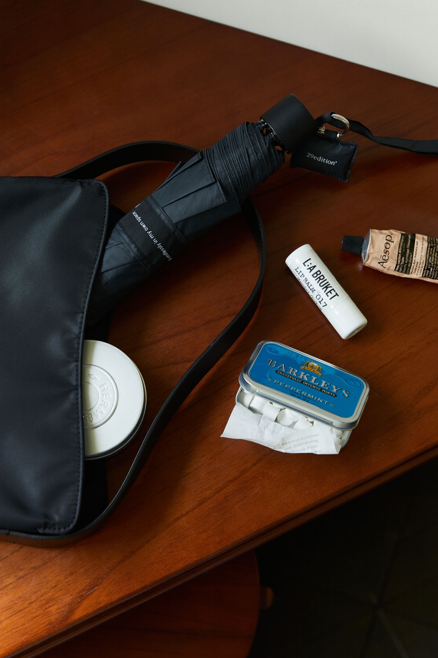 비가 그치는 순간 장우산은 크고 기다란 짐이 됩니다. 파우치를 만들게 되면 두 손이 자유로울 수 있도록 멜 수 있는 기능을 꼭 넣어야 한다고 생각했어요. 29' 팀과 여러 레퍼런스들로 의견을 주고받으면서 크로스백 형태가 가장 적합하다고 결론을 지었던 거죠.