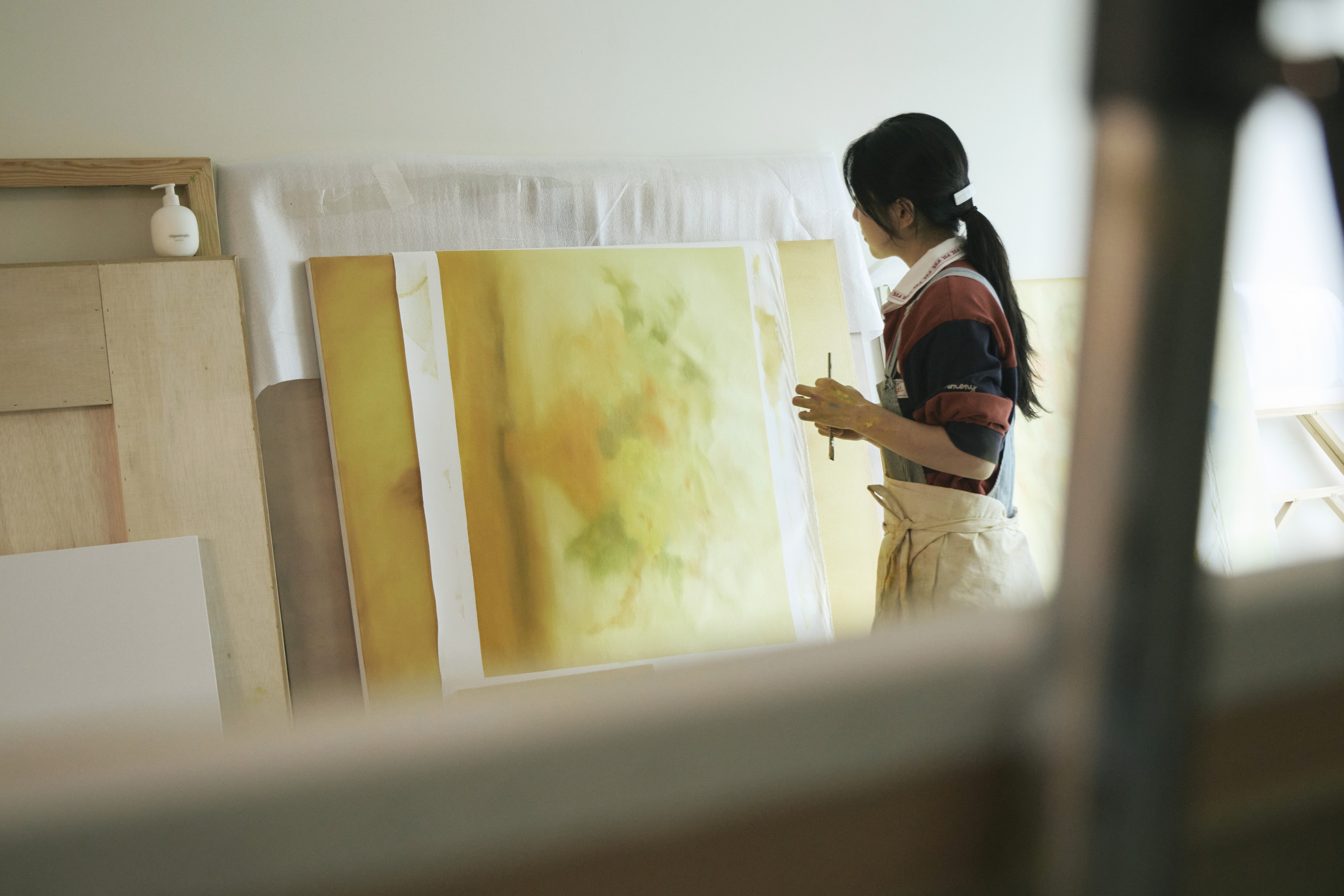사람들은 꽃이 시들면 너무 쉽게 쓰레기통에 버리곤 하잖아요. 저는 그 행위가 폭력적이라고 느꼈어요. 그 후로 “꽃에 대한 애도를 시작하자”라는 마음으로 그림을 그리기 시작했죠. 꽃이 시들더라도 꽃과 함께하던 순간의 공기를 느낄 수 있다는 마음에서요. 그 공기를 표현하다 보니 지금의 추상적인 형태로 완성되었어요.