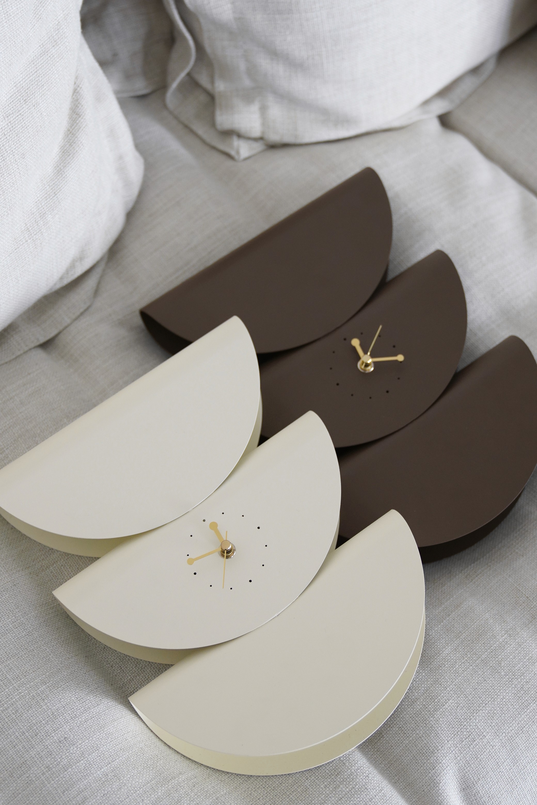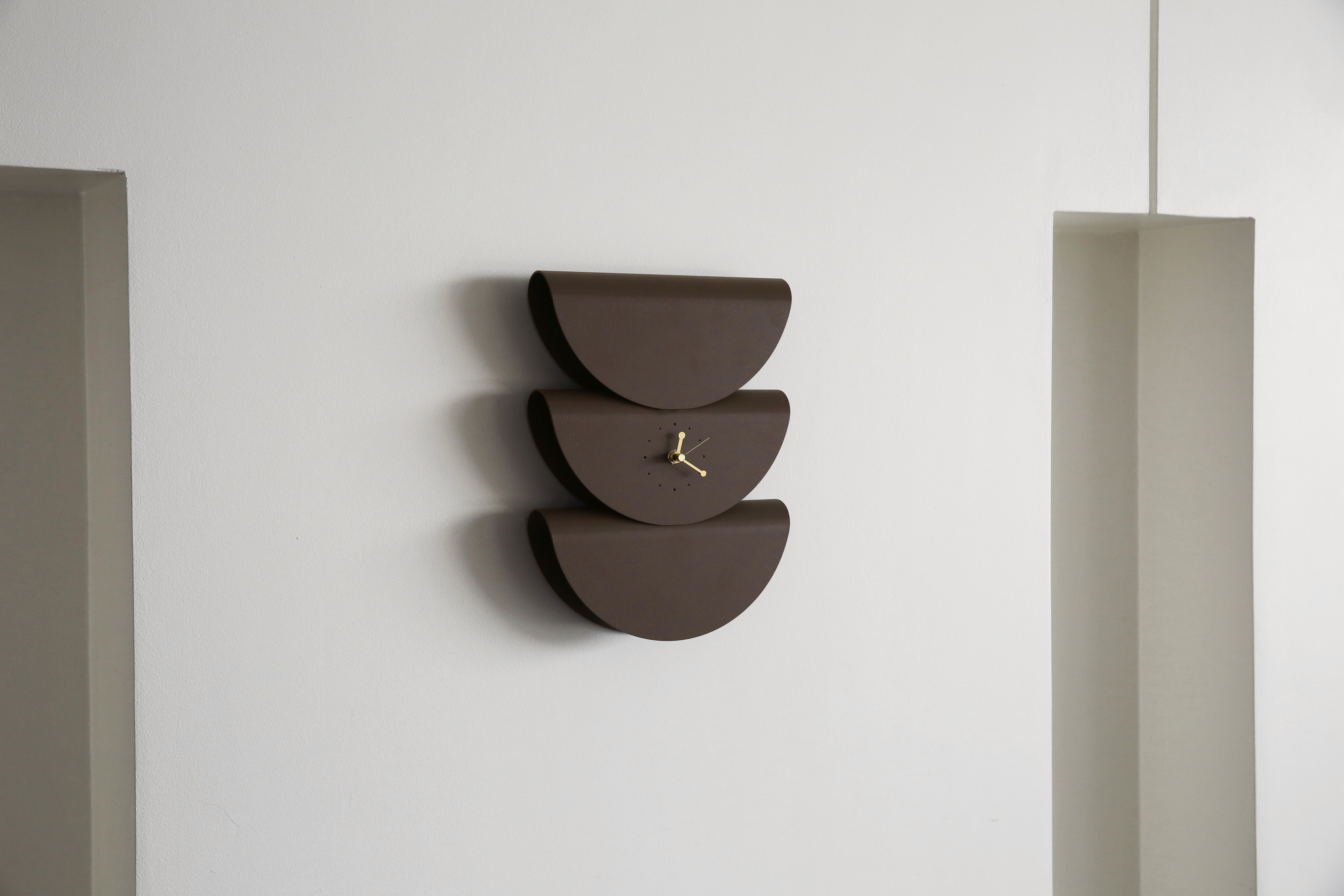 "시간은 이미 핸드폰으로 확인하는데, 벽시계는 왜 필요한 걸까?"라는 질문이 출발점이었어요. 벽을 장식하는 '브로치'같은 존재감이라면 설명이 되겠다는 생각에 타코 3개를 겹친 듯한 조형으로 만들게 되었죠. 그 관점에서 시간을 알려주는 기능은 최소한으로만 넣고 벽면의 오브제와 같은 역할이 부각되도록 디자인했습니다. 벽시계에 대한 편견을 깬 좋은 사례라고 생각해요.