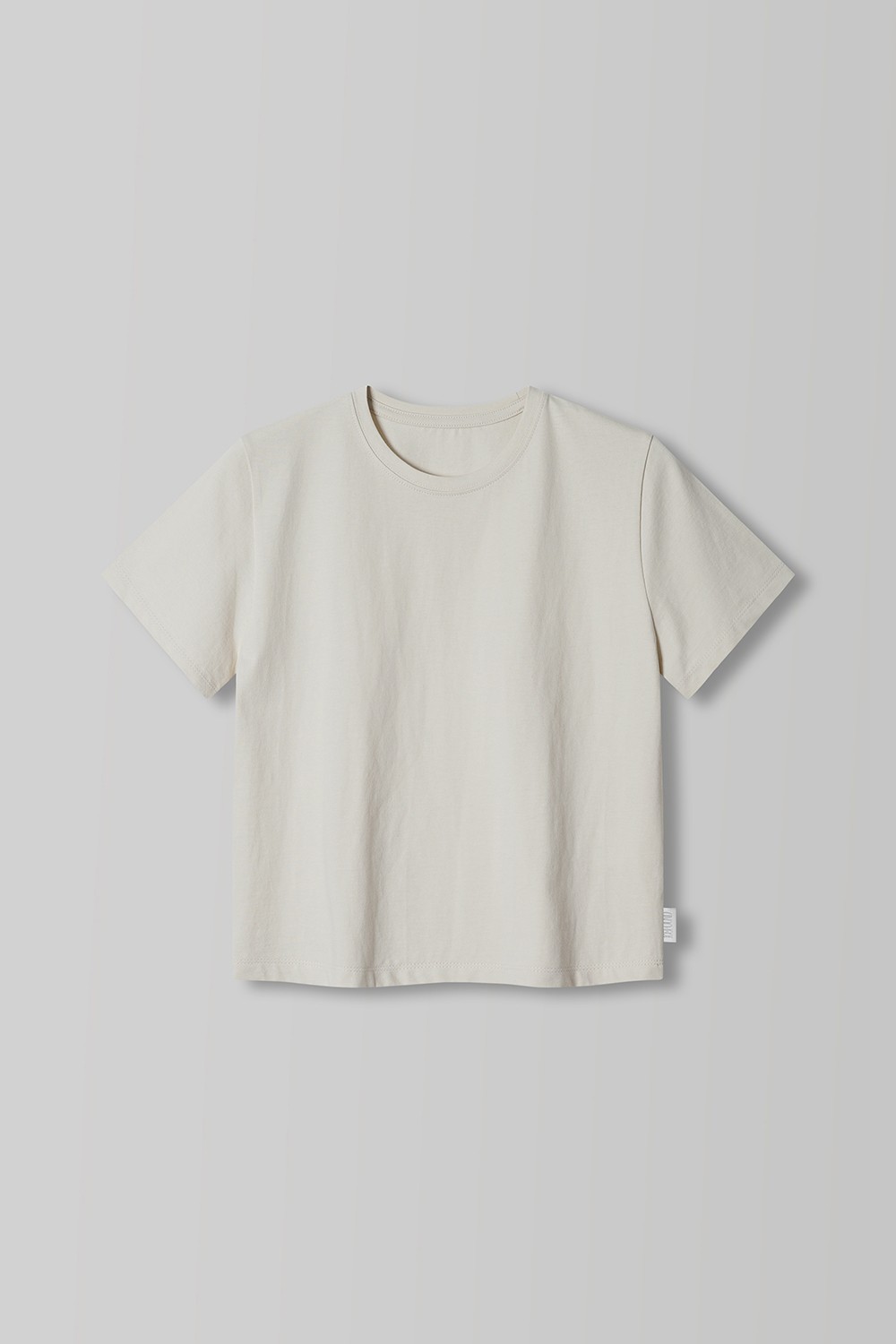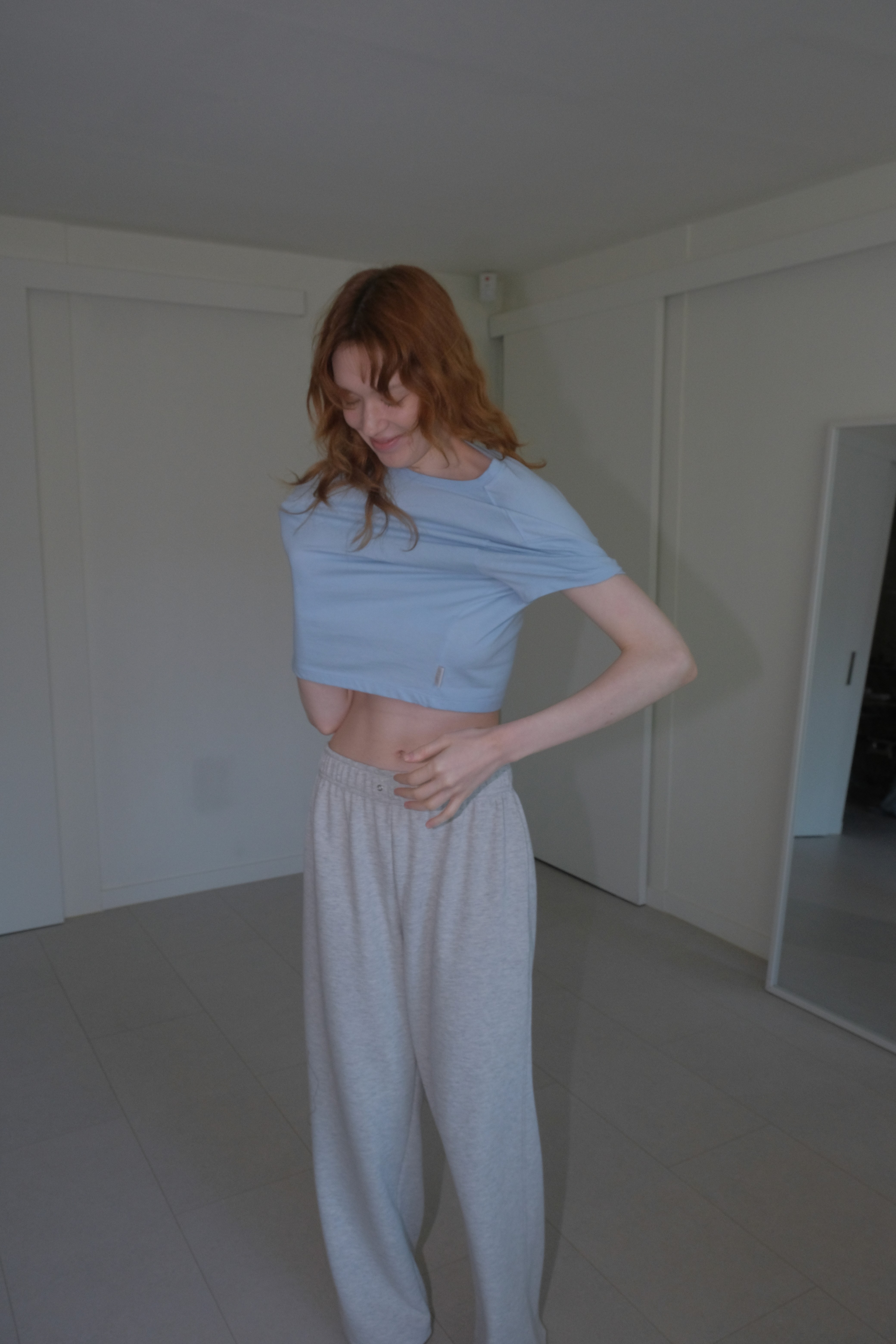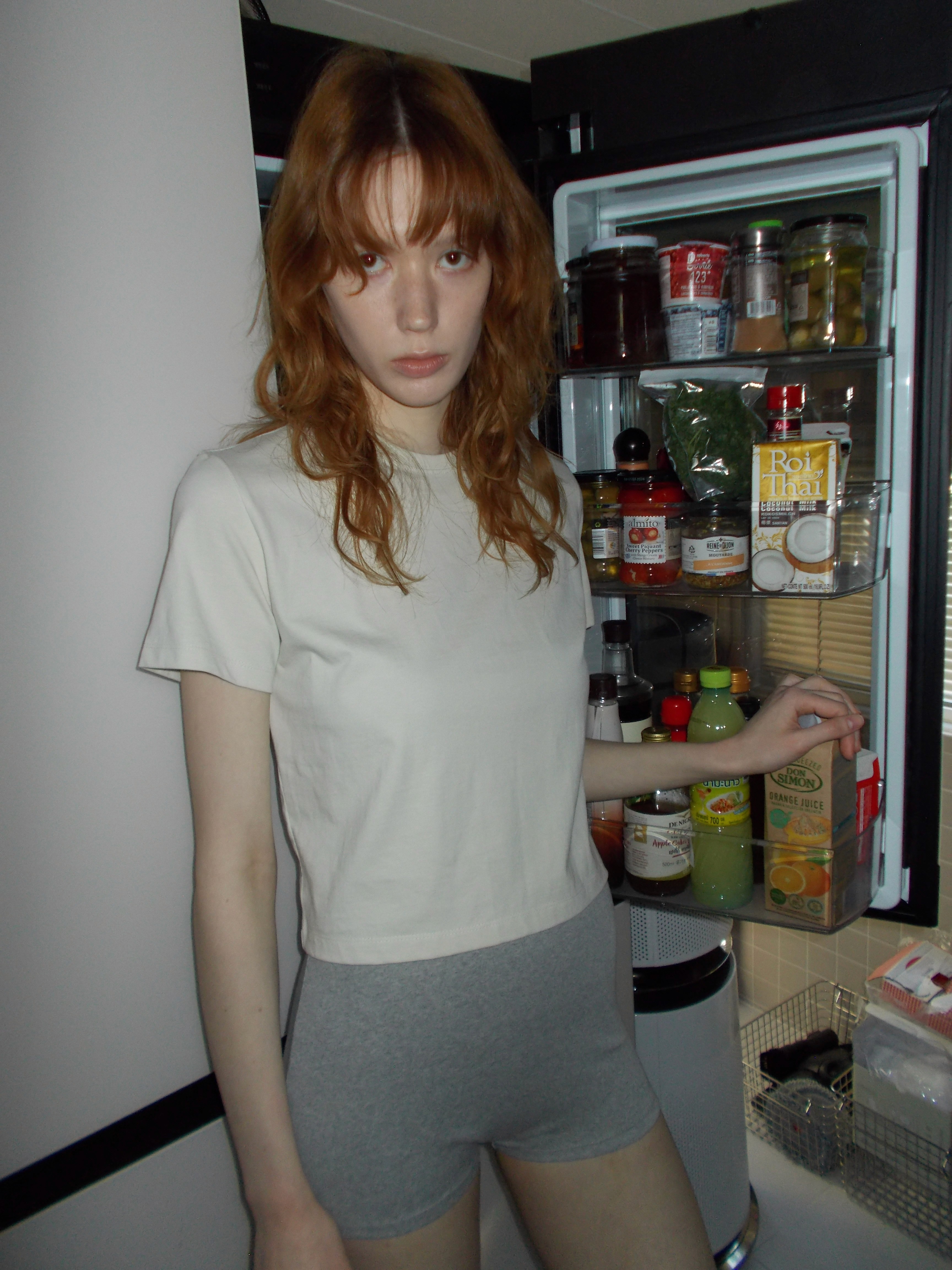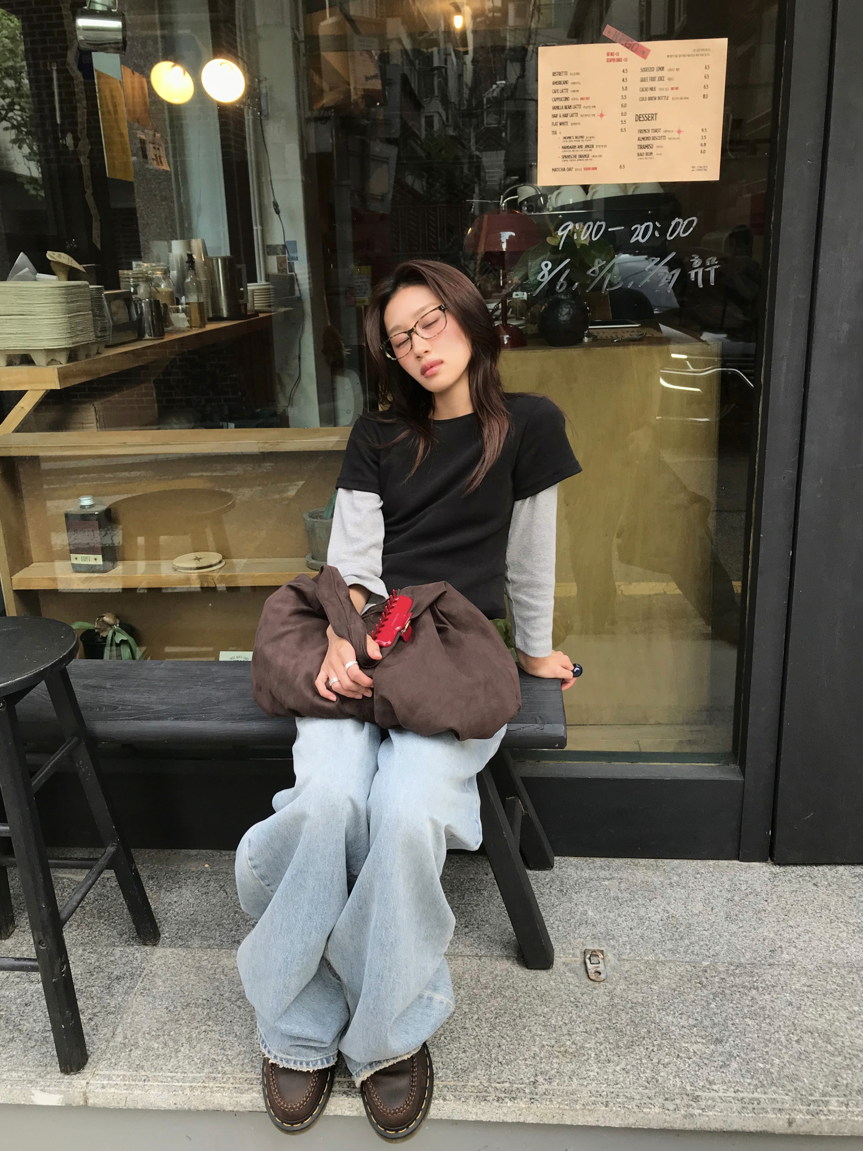 단정한 티셔츠처럼 보이지만, 레이어드했을 때 다른 옷의 균형을 해치지 않도록 넥 라인과 어깨 각도, 기장까지 세밀하게 조정했어요. 특히 크롭 길이는 짧아 보이는 지점과 안정적으로 보이는 경계를 여러 차례 수정하며 완성됐다고 해요. 눈에 띄기보다는 전체 실루엣을 조용히 정리하는 역할에 가까운 티셔츠입니다.