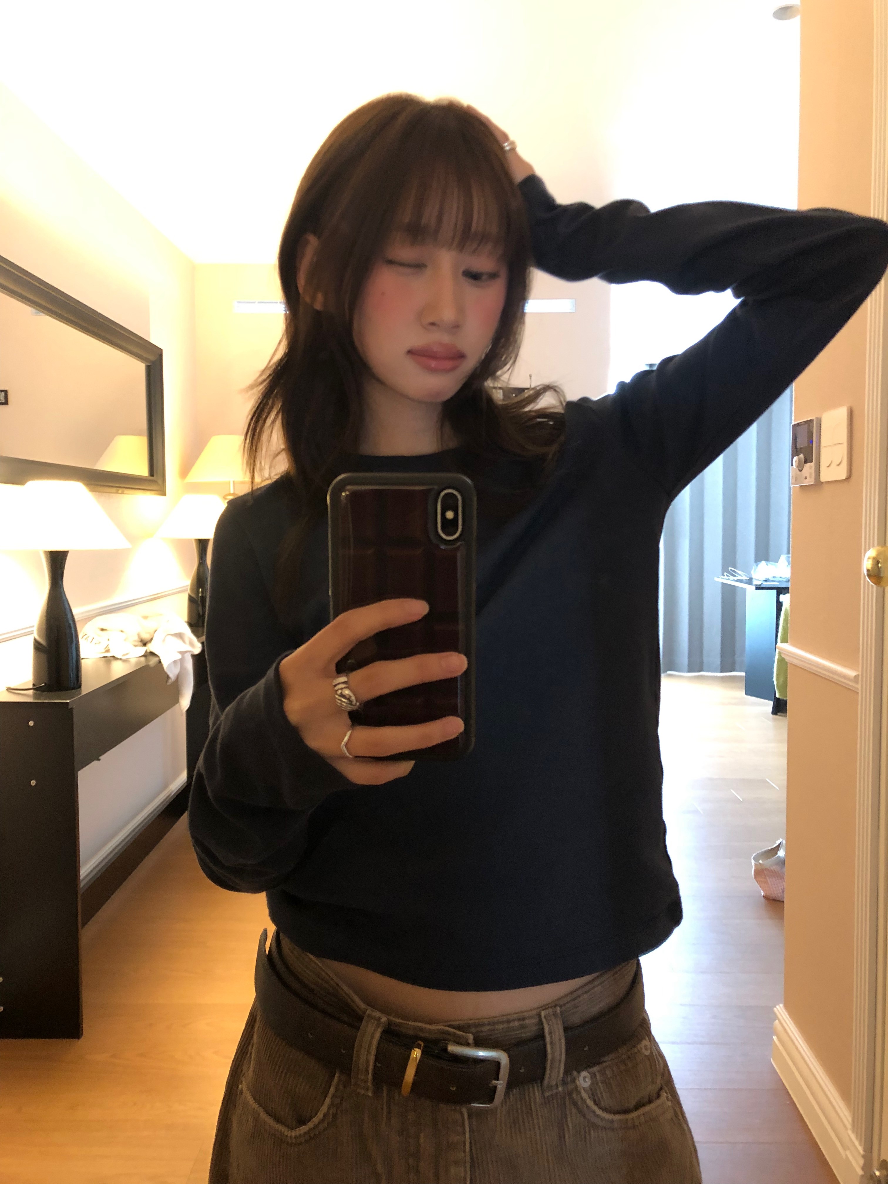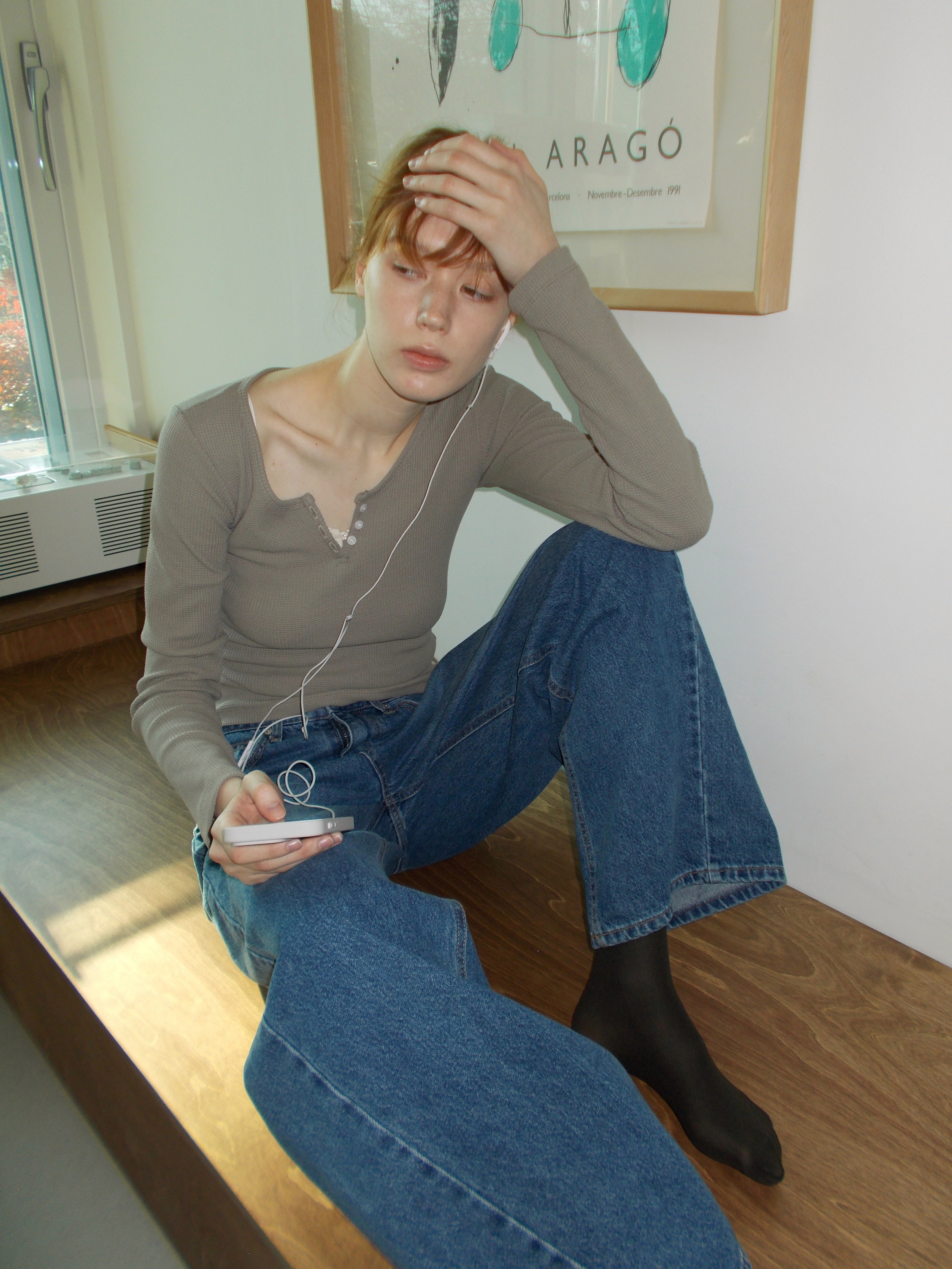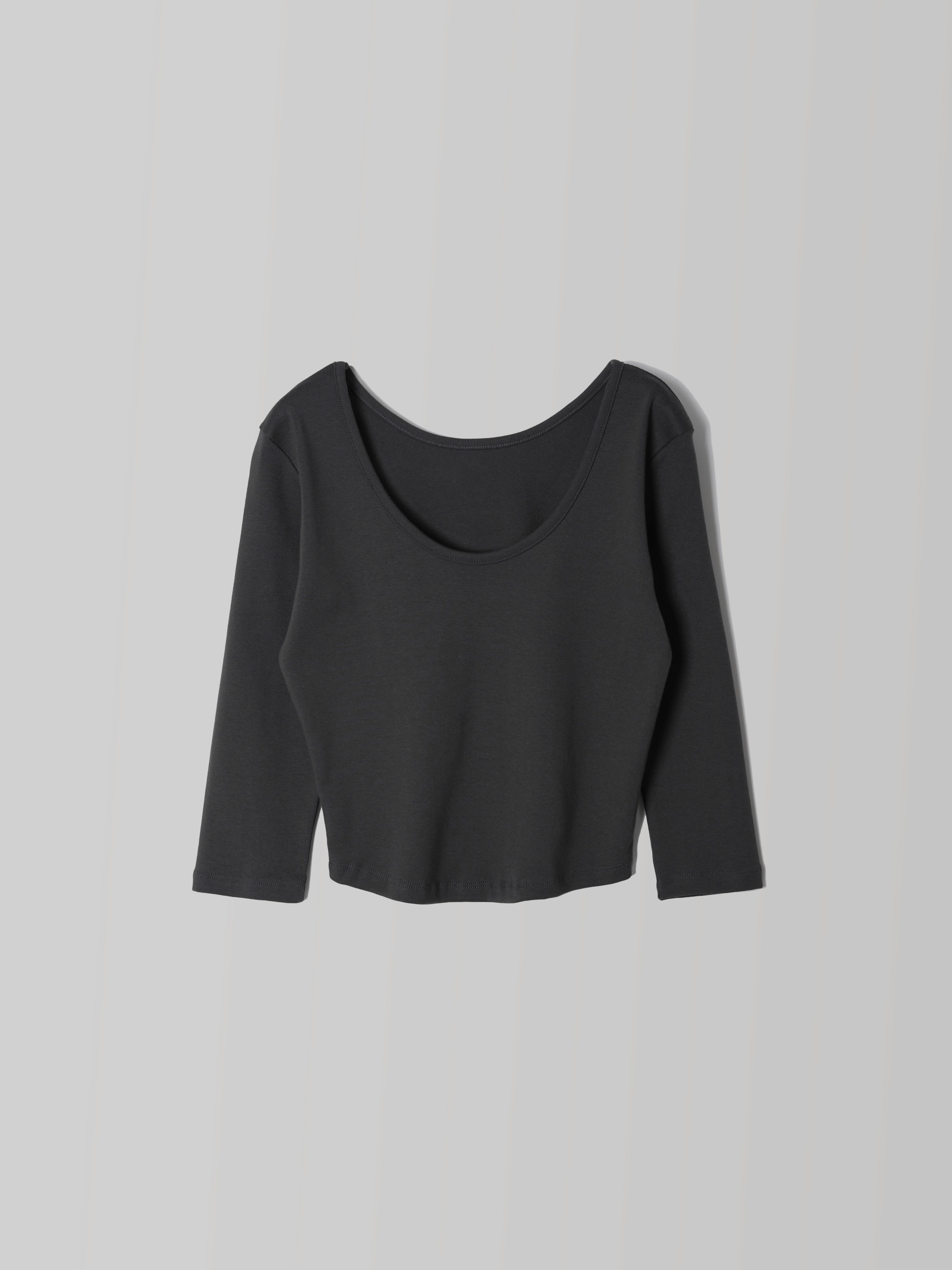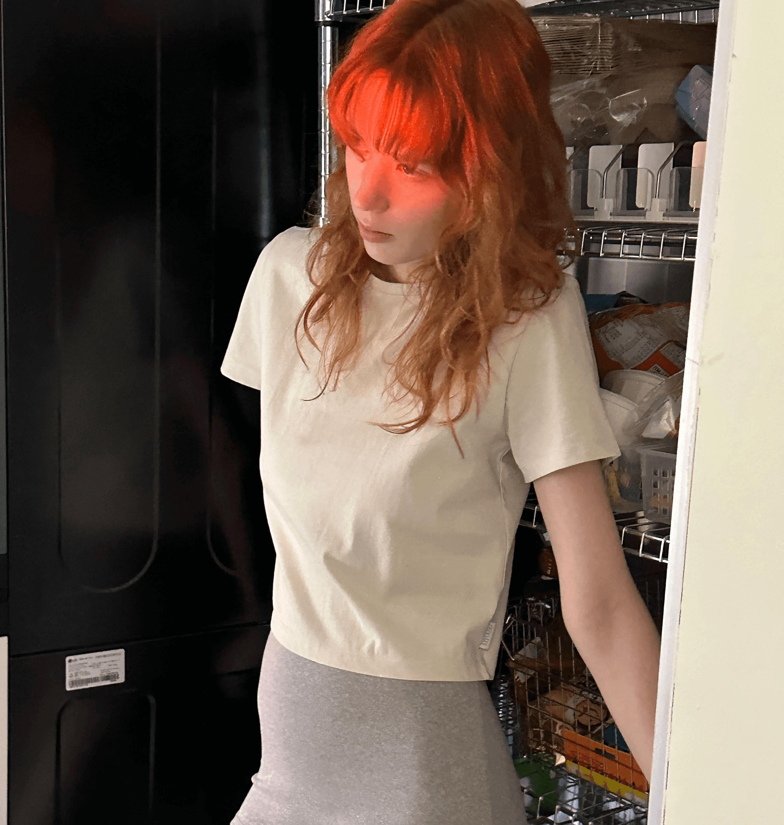 단정한 티셔츠처럼 보이지만, 레이어드했을 때 다른 옷의 균형을 해치지 않도록 넥 라인과 어깨 각도, 기장까지 세밀하게 조정했어요. 특히 크롭 길이는 짧아 보이는 지점과 안정적으로 보이는 경계를 여러 차례 수정하며 완성됐다고 해요. 눈에 띄기보다는 전체 실루엣을 조용히 정리하는 역할에 가까운 티셔츠입니다.