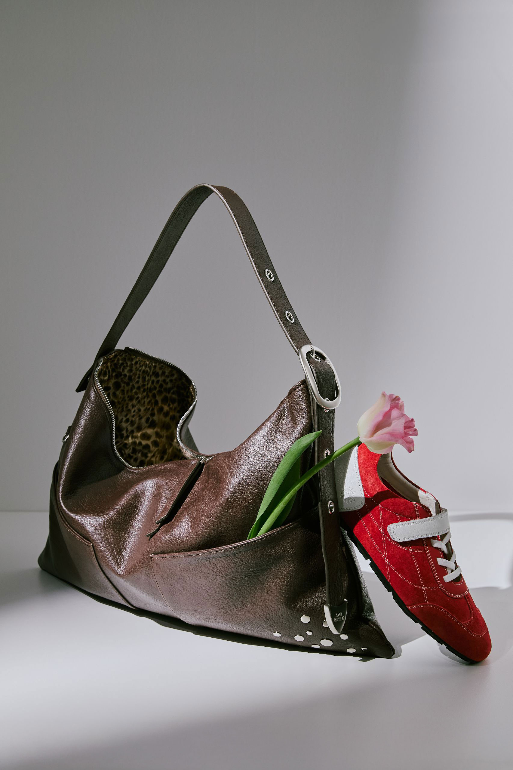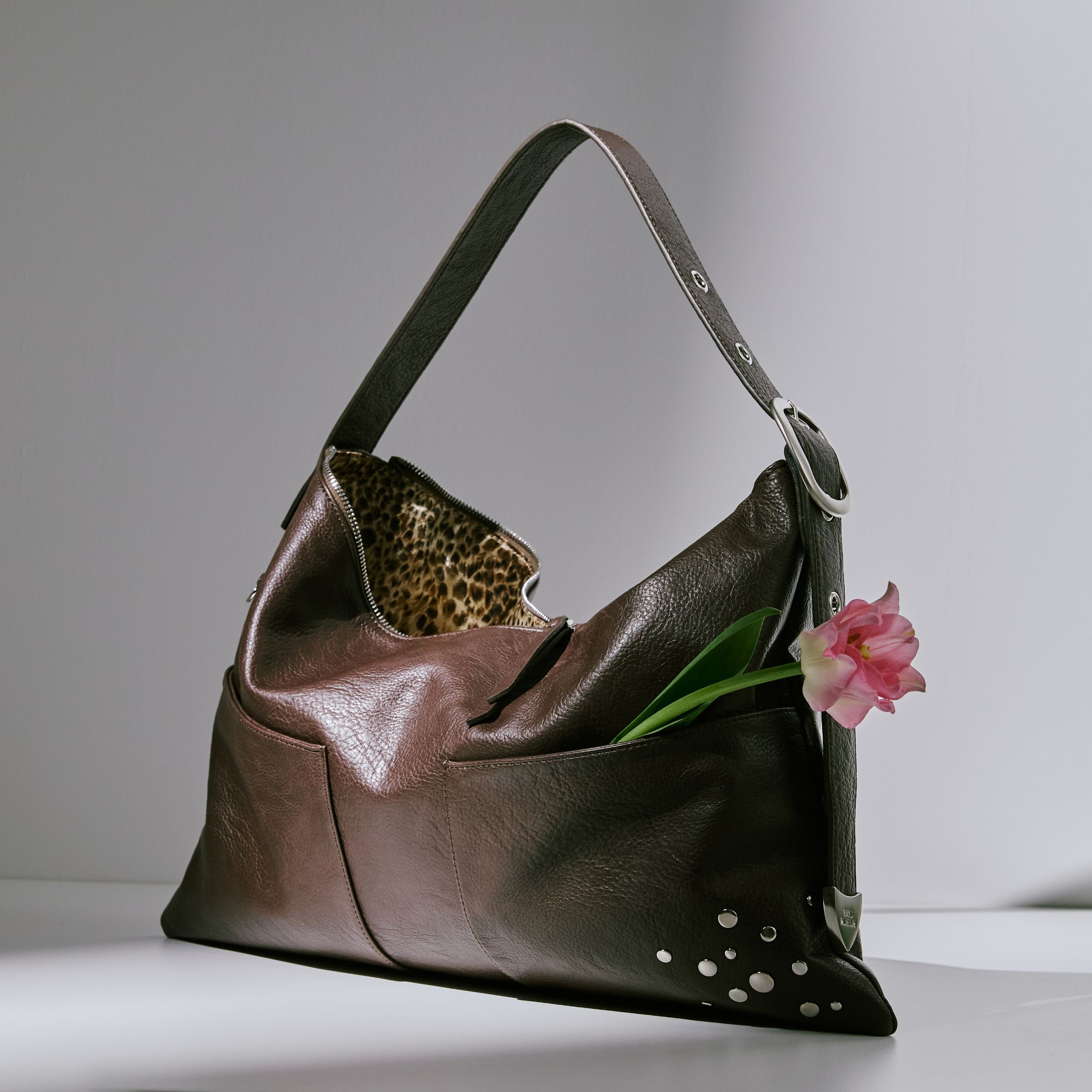 레오파드 배색 안감의 반전 매력을 가진 호보백. 볼드한 버클과 스터드 장식이 웨스턴 무드를 살렸어요.