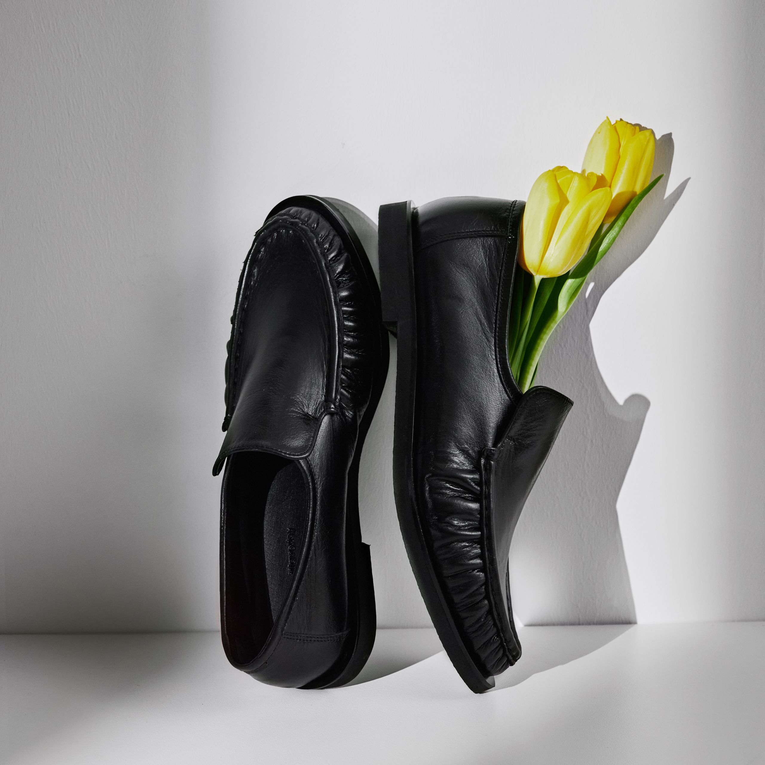 한 땀 한 땀 견고히 꿰매어 완성한 로퍼. 부드러운 소가죽과 발등 고무 밴딩으로 편안함까지 제공해요.