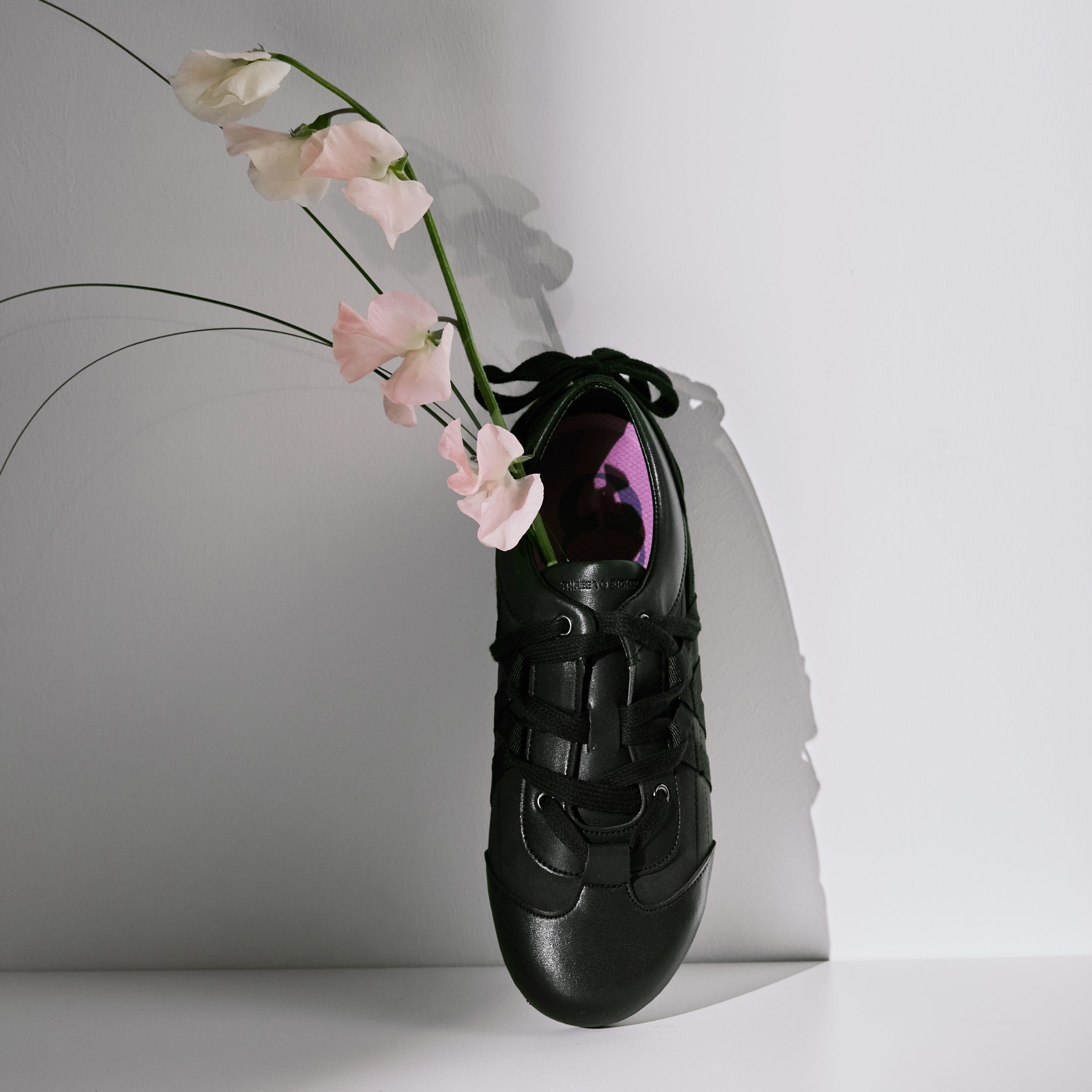 로퍼처럼 활용하기 좋은 미니멀 스니커즈. 차분한 컬러 속 구조적인 레이스업 디테일이 포인트예요.