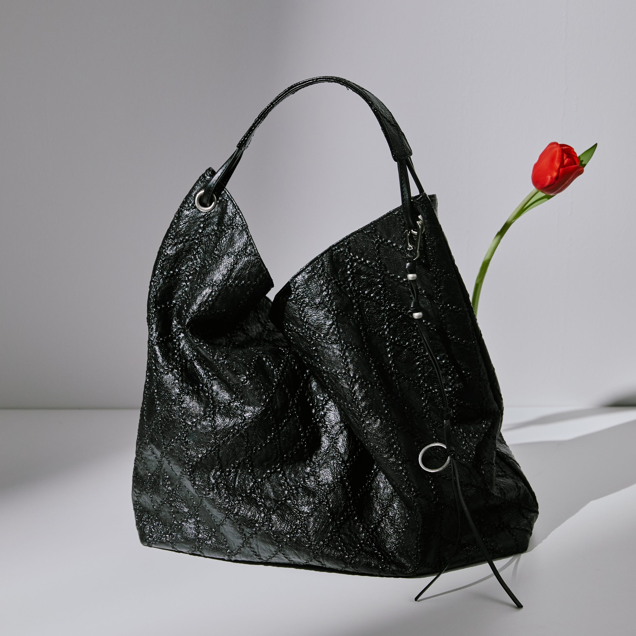 퀼팅 기법으로 시크한 무드를 더한 숄더백. 유니크한 매듭 키링은 덤이에요.