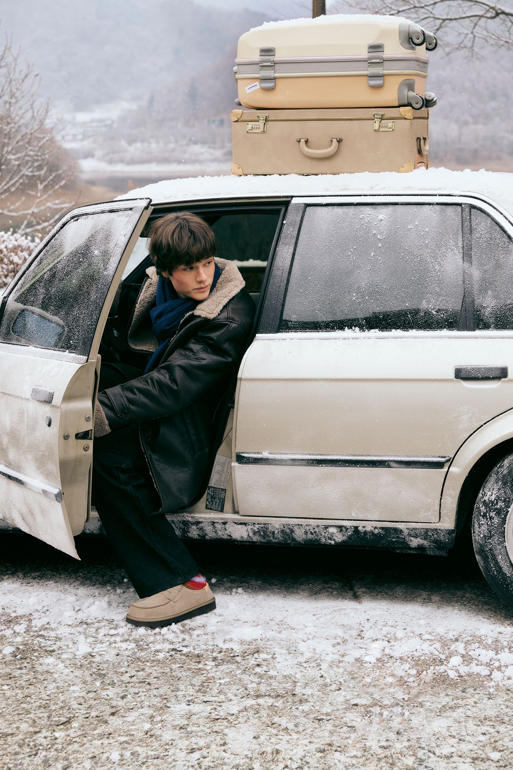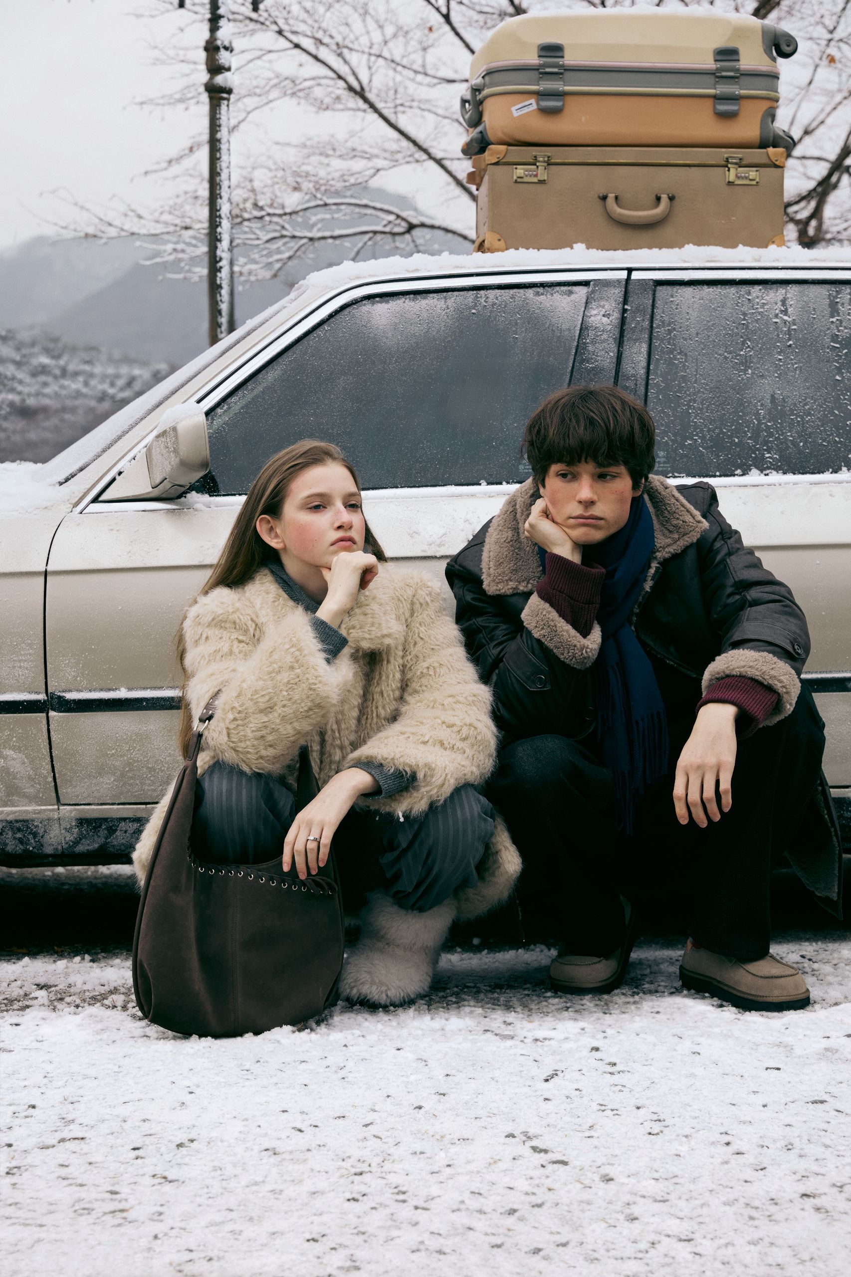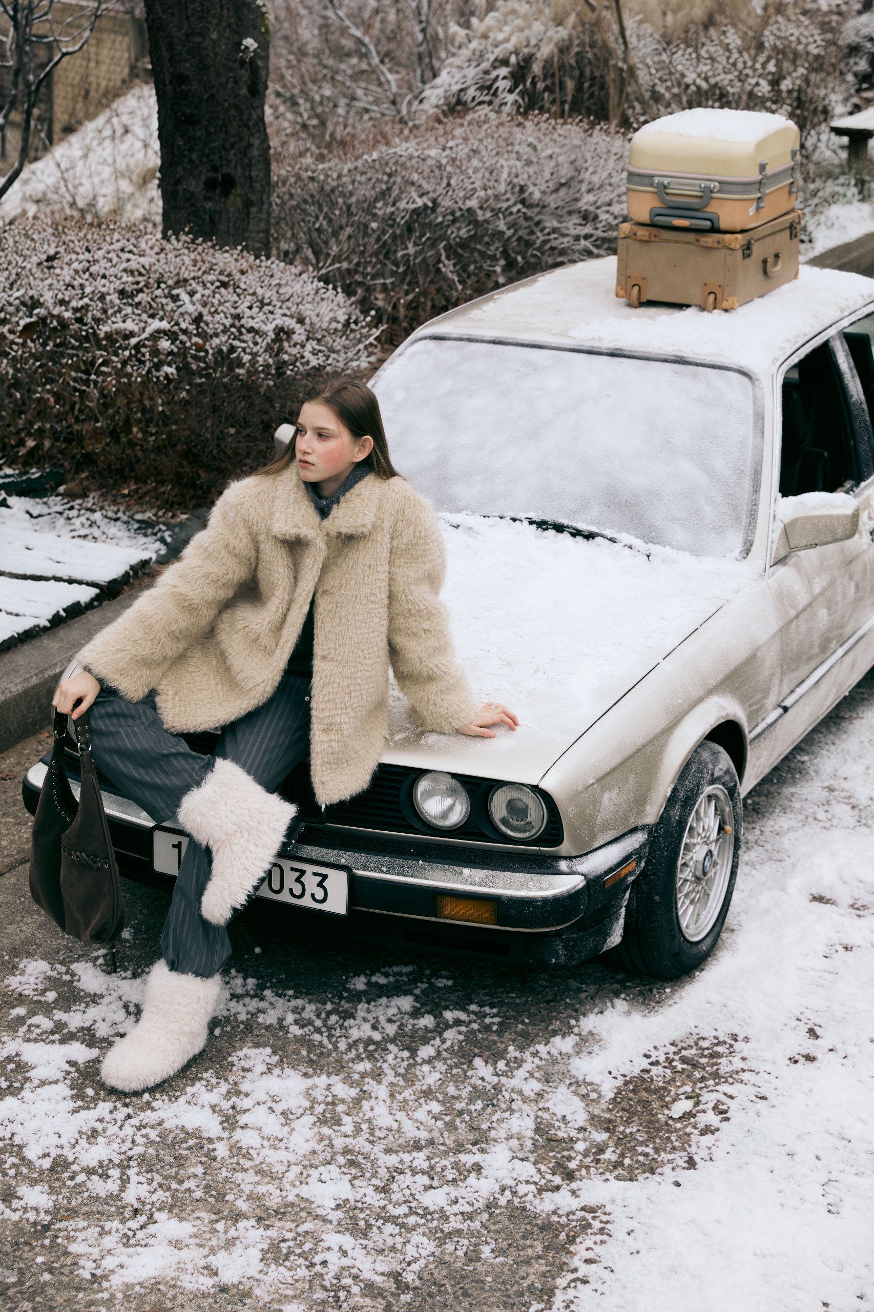 여행은 예상대로만 흘러가지 않지. 하지만 몽글몽글한 퍼 재킷과 따뜻한 머플러로 무장했으니 차에서 내려 무작정 걷는 것도 좋을 거야.