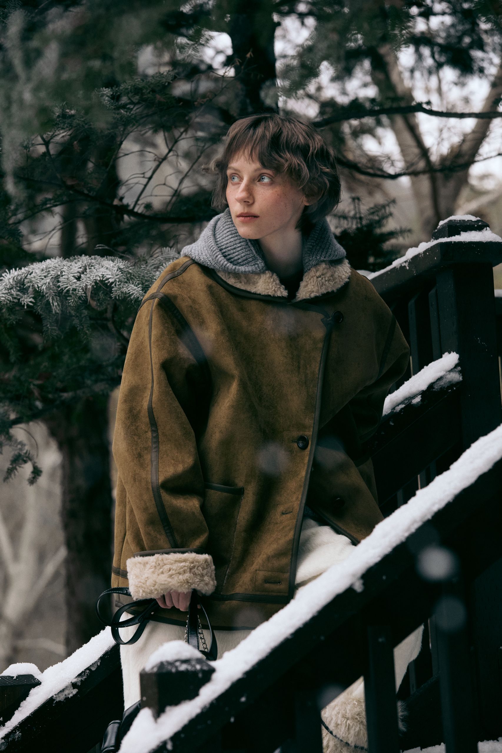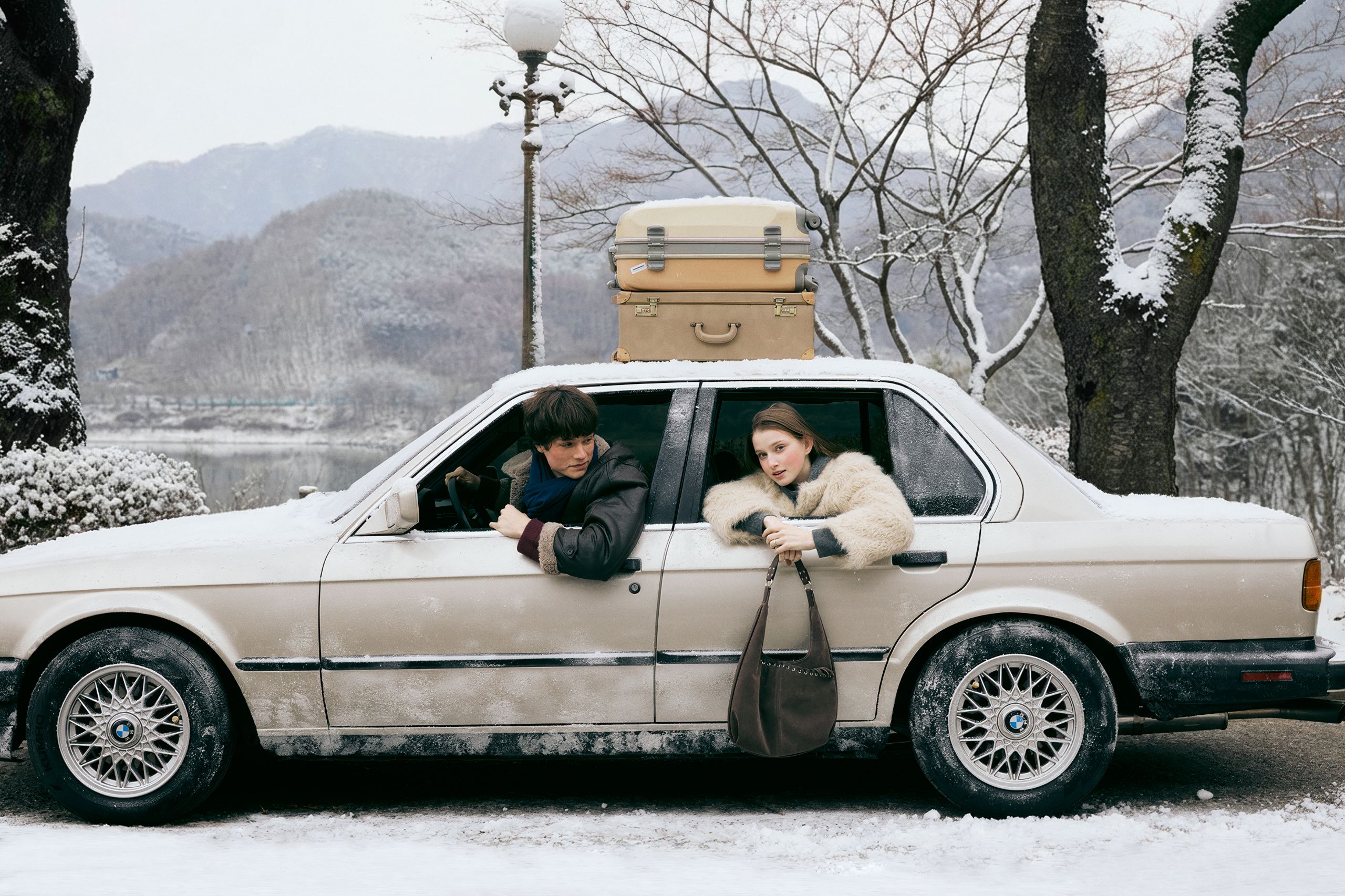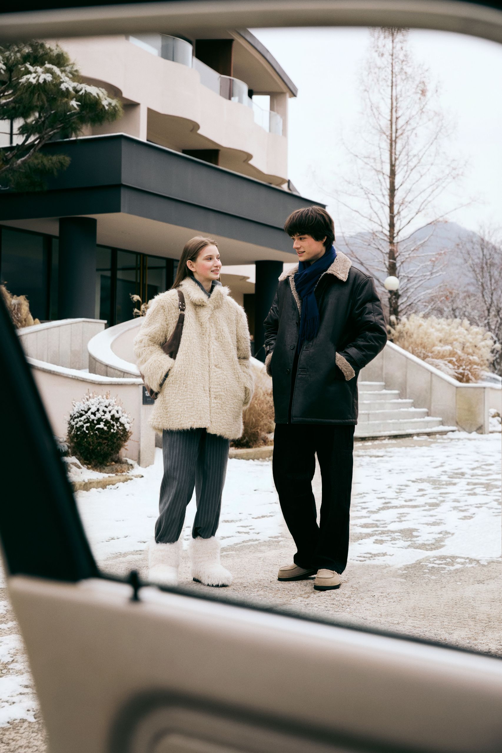 여행은 예상대로만 흘러가지 않지. 하지만 몽글몽글한 퍼 재킷과 따뜻한 머플러로 무장했으니 차에서 내려 무작정 걷는 것도 좋을 거야.