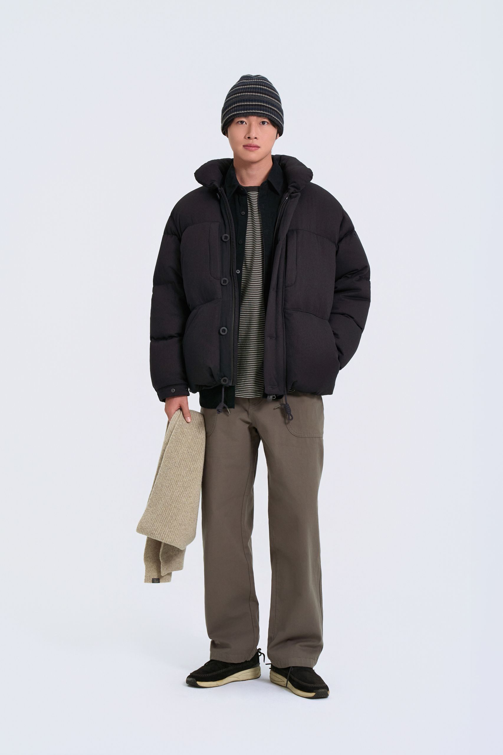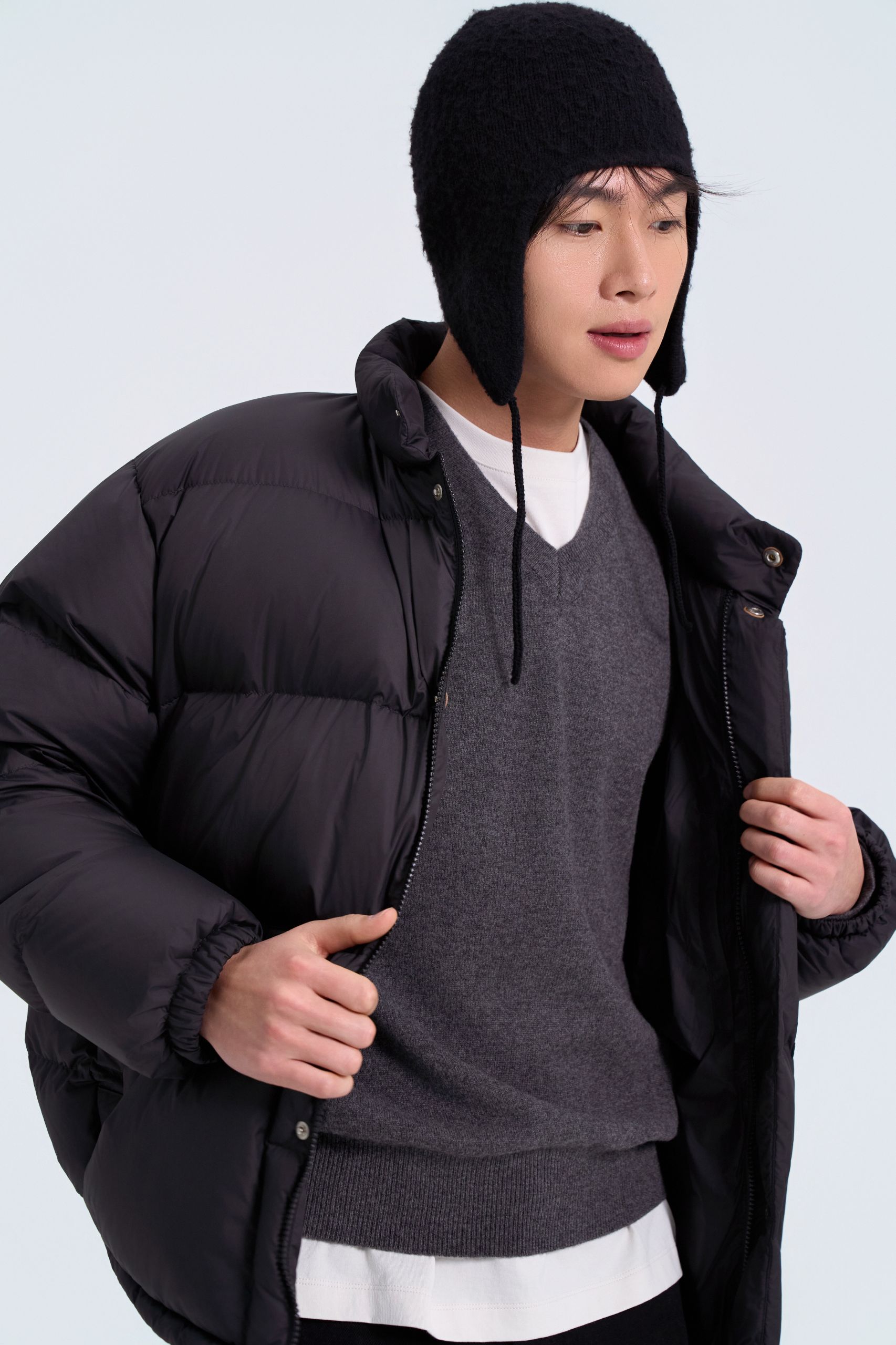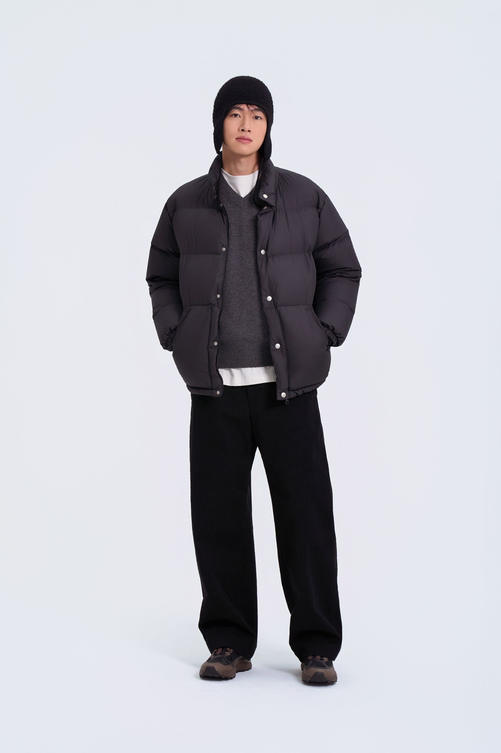 다운재킷과 함께 브이넥 니트 안에 라운드 티셔츠를 레이어드해 친근함을 강조했어요. 이어플랩 비니와 테이퍼드 실루엣 팬츠로 활동적인 감성을 더해요.