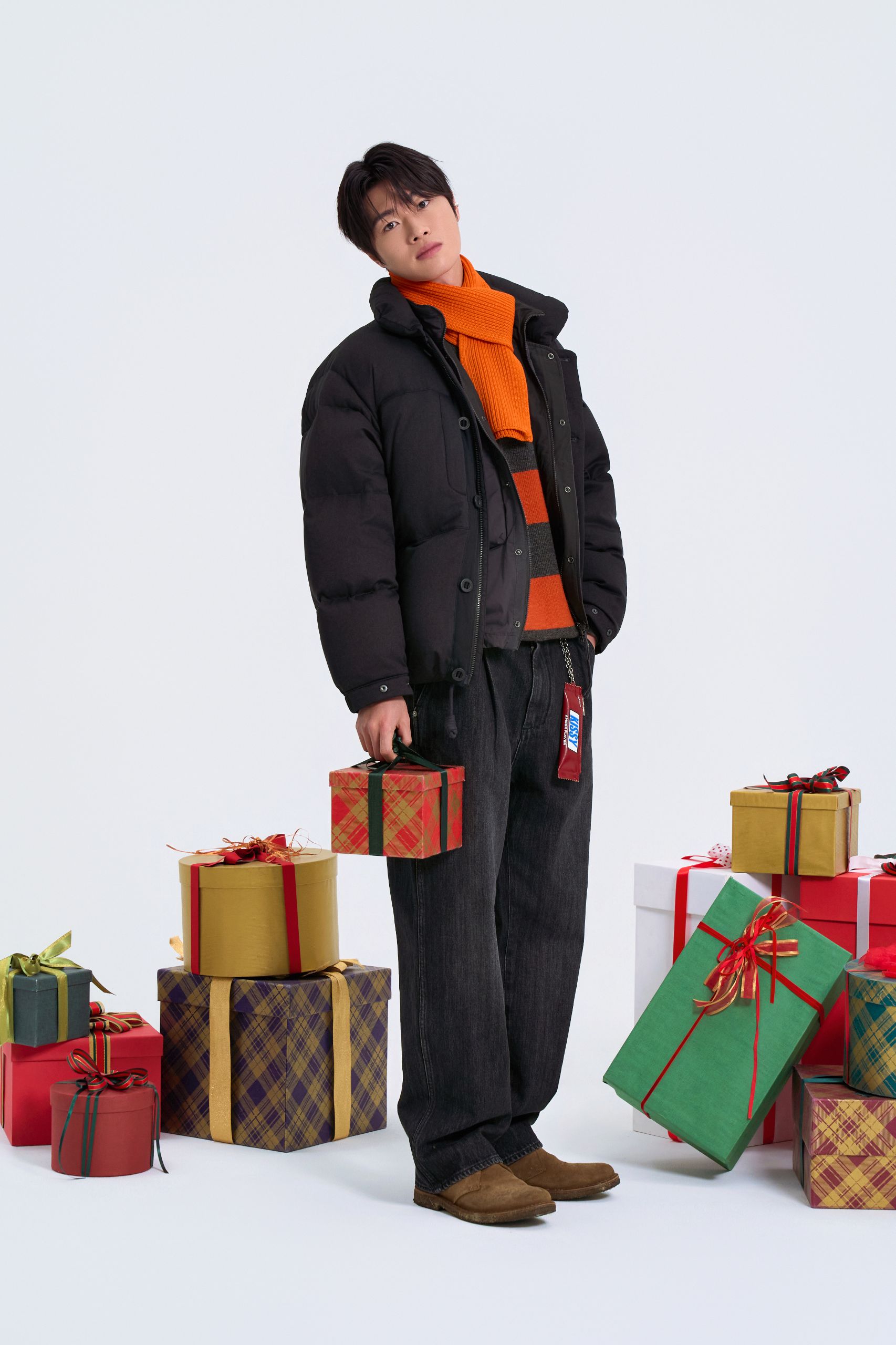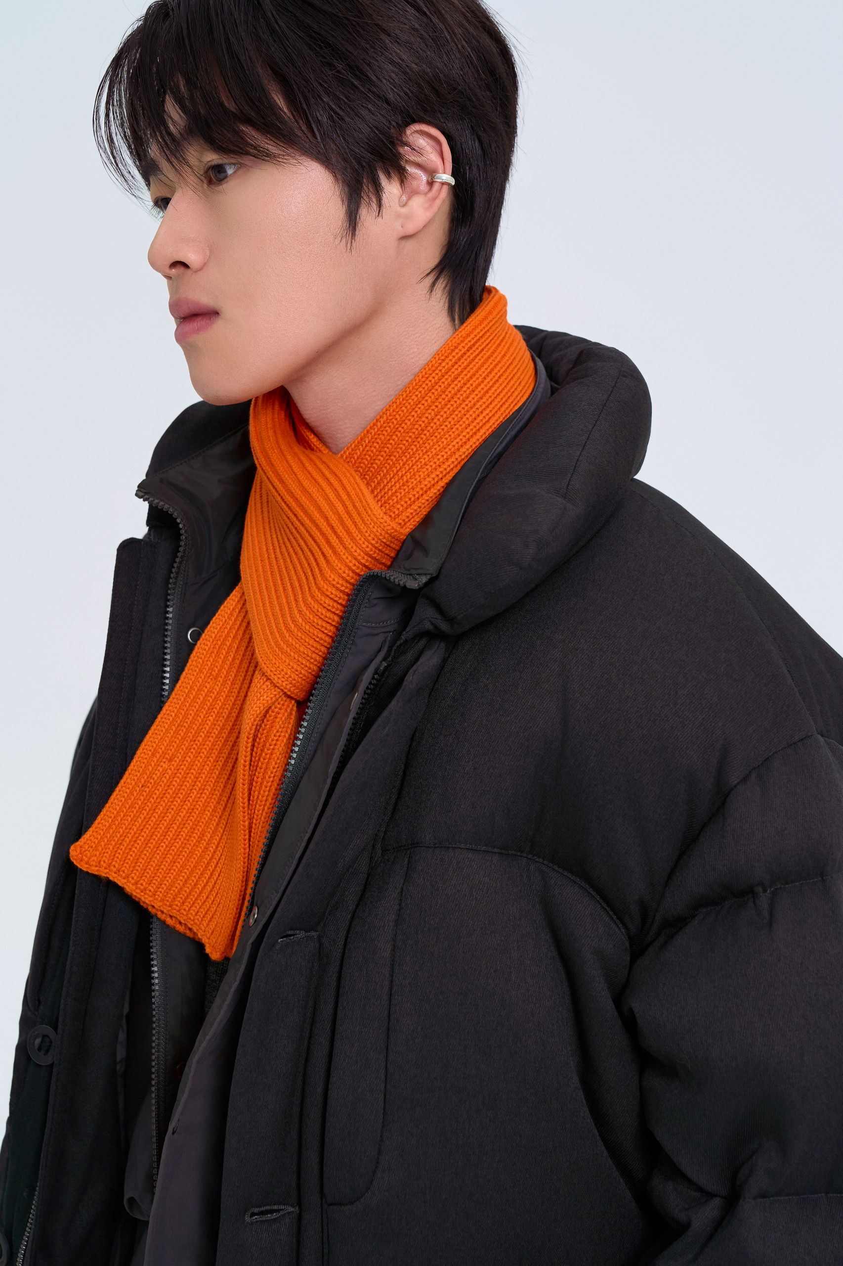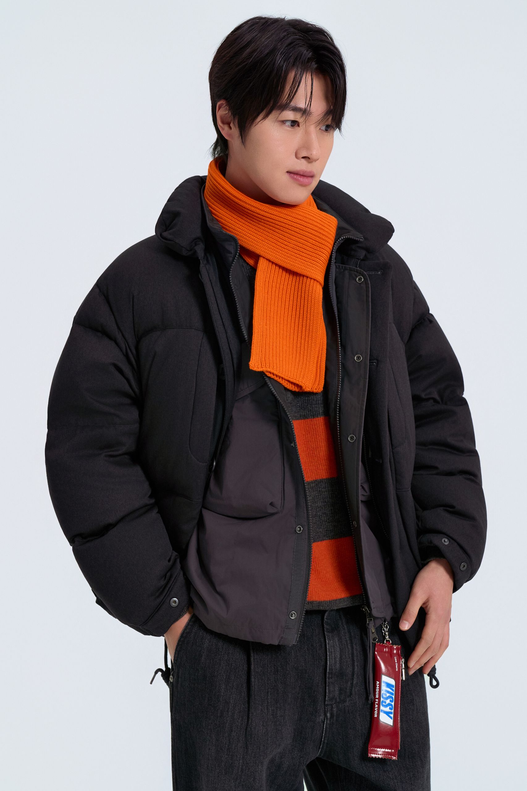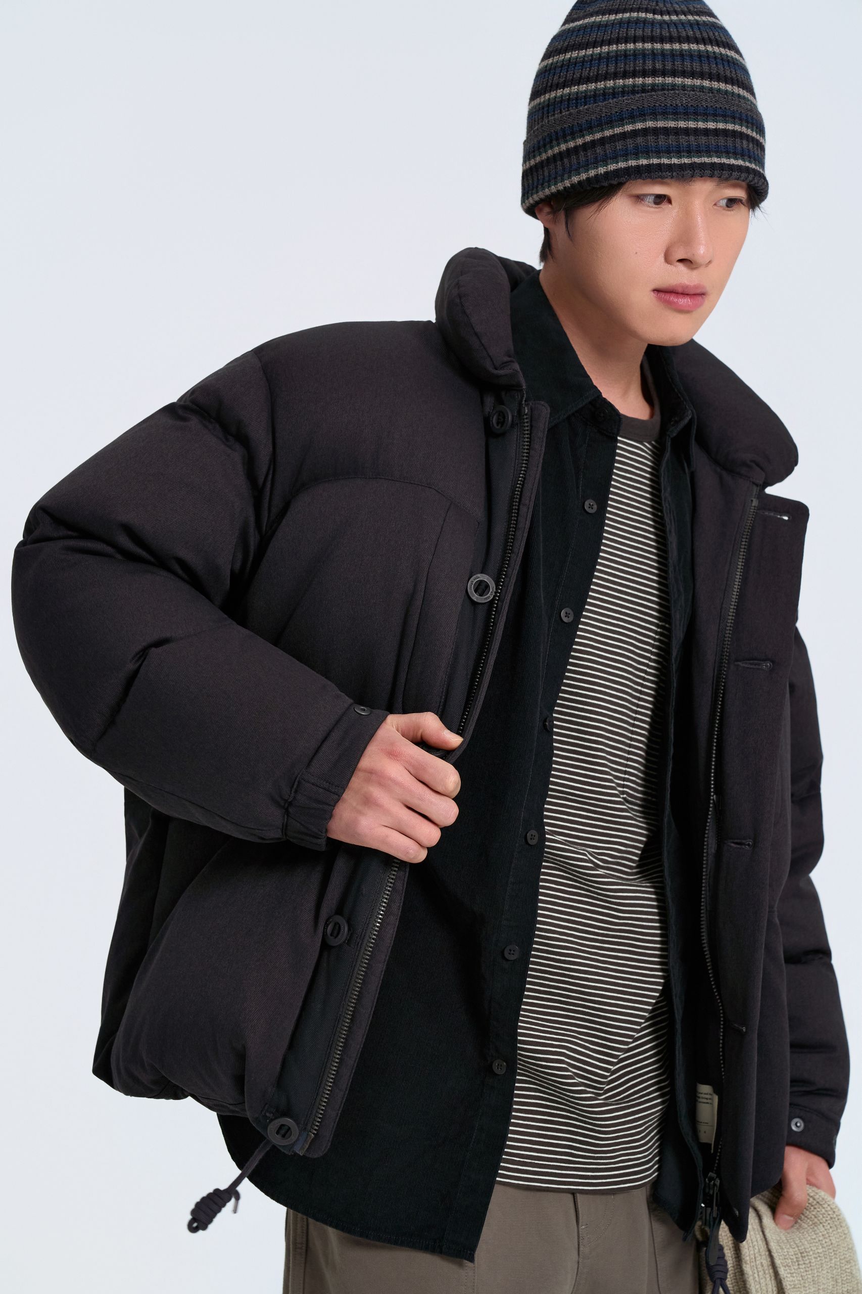 다운재킷과 함께 브이넥 니트 안에 라운드 티셔츠를 레이어드해 친근함을 강조했어요. 이어플랩 비니와 테이퍼드 실루엣 팬츠로 활동적인 감성을 더해요.