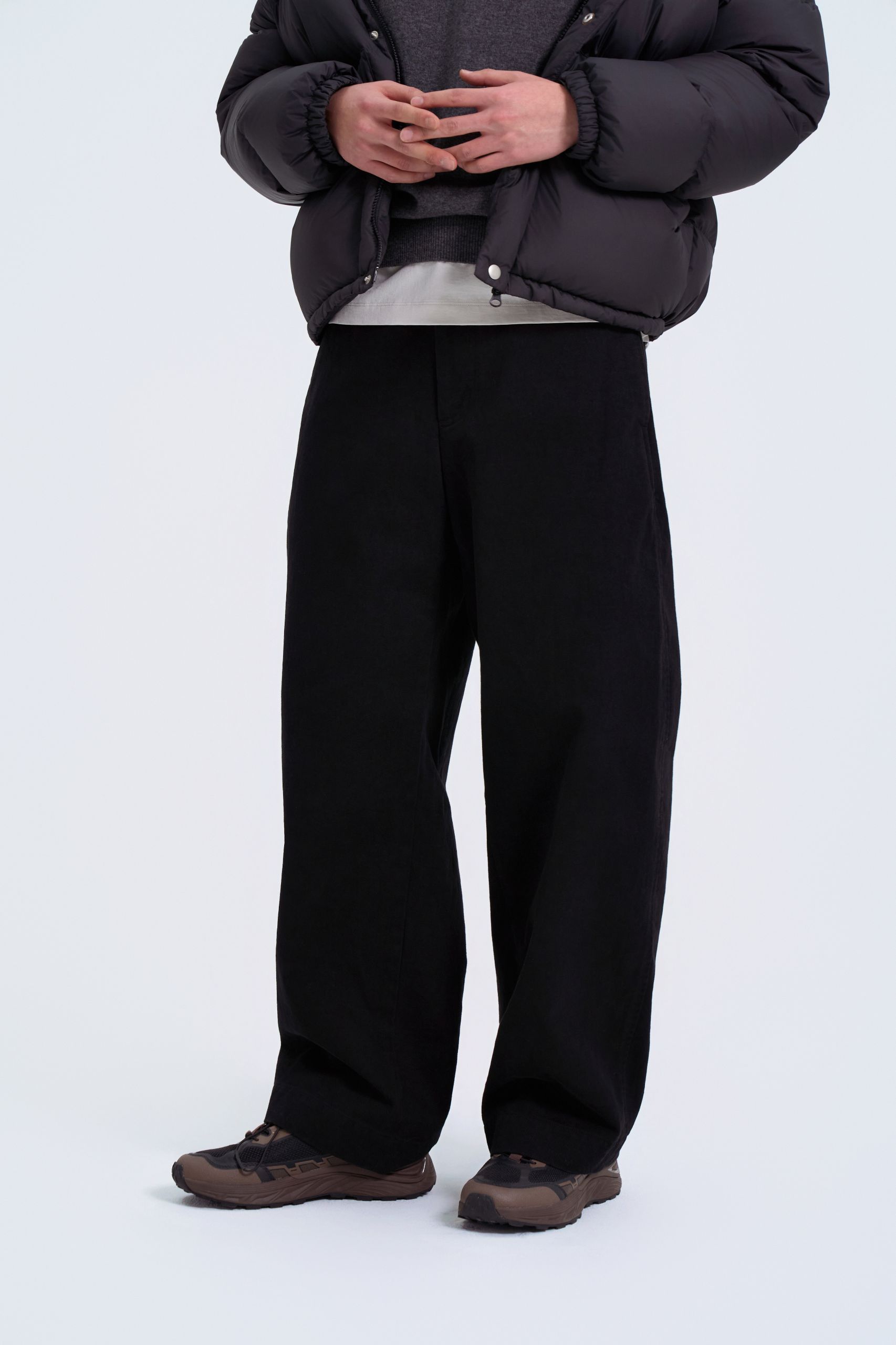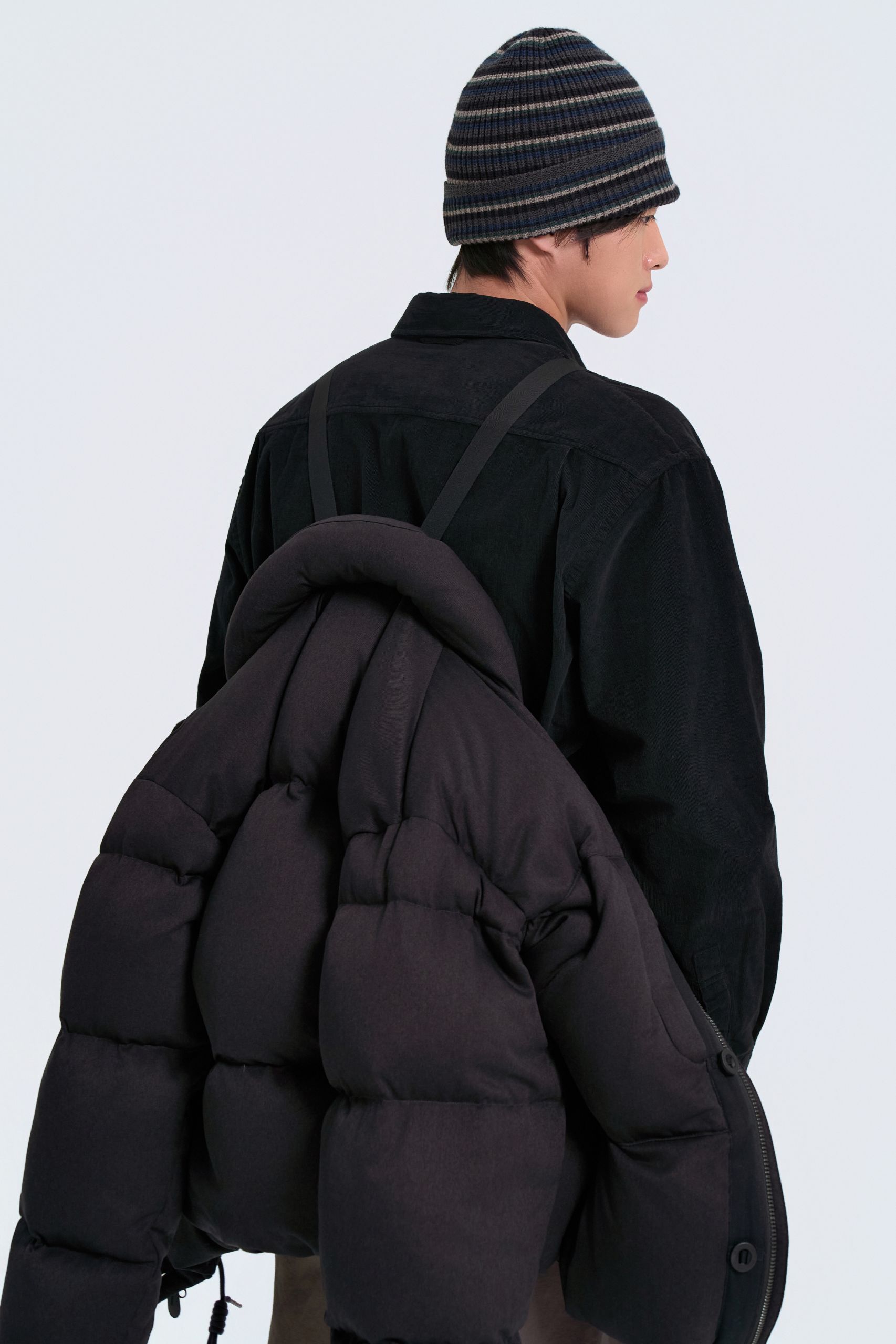 일상에서도 활용하기 좋은 스타일링이에요. 보송한 소재의 파카와 코듀로이 셔츠가 서로 다른 질감으로 어우러져 은은한 포인트를 더해요.