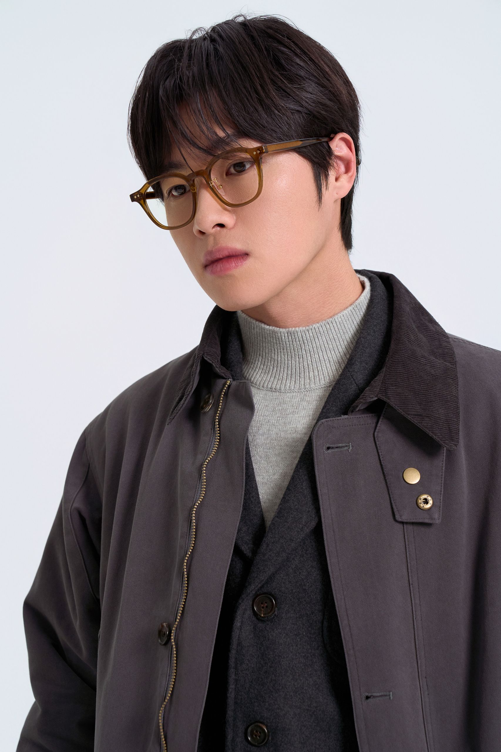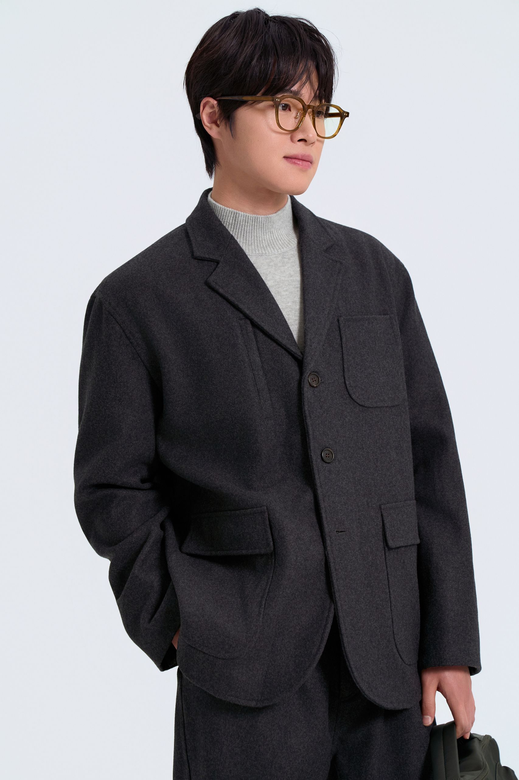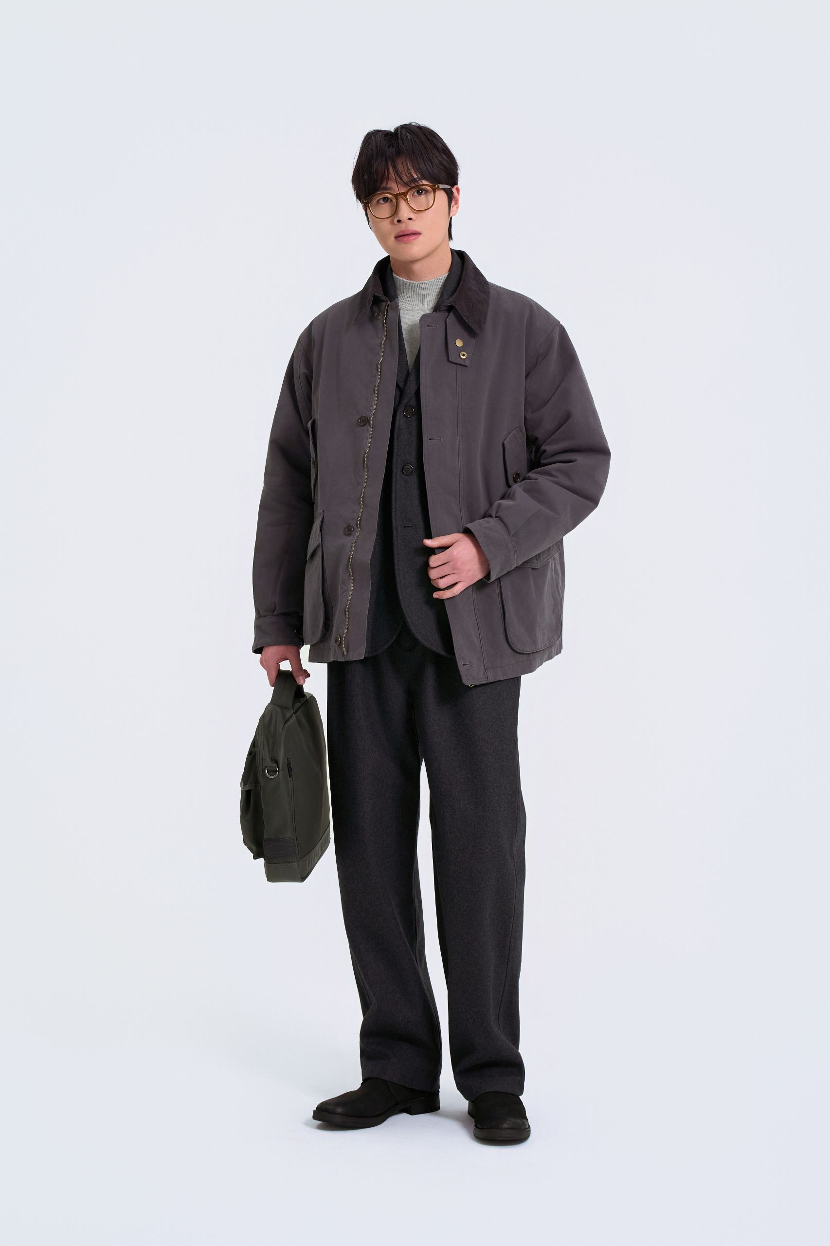코듀로이 칼라로 얌전해 보이는 것이 해브해드 필드 코트의 장점이에요. 도톰한 울 셋업을 매치해 편안하면서도 단정한 스타일을 완성했어요. 드레스 셔츠와 타이 대신 터틀넥으로 보온성과 부드러운 인상을 더해요.