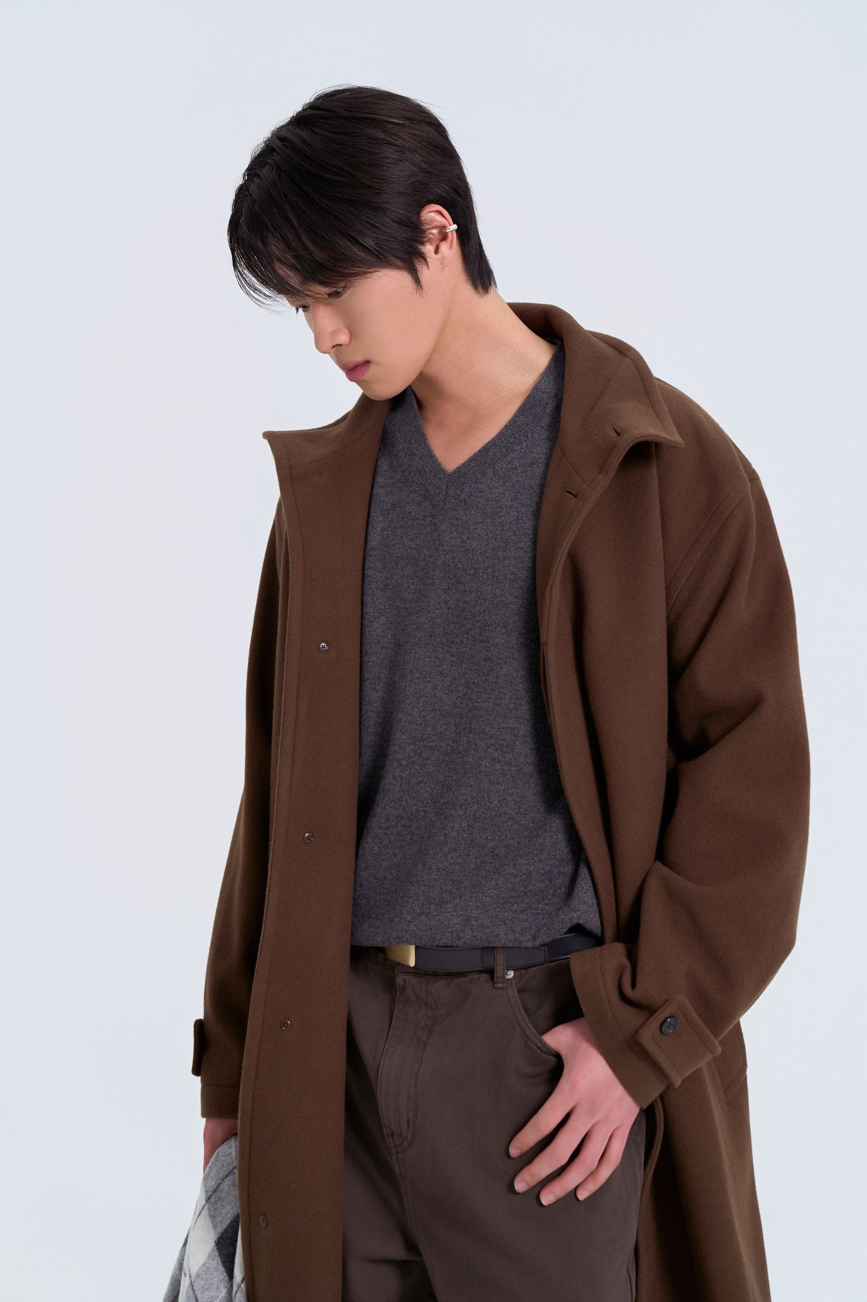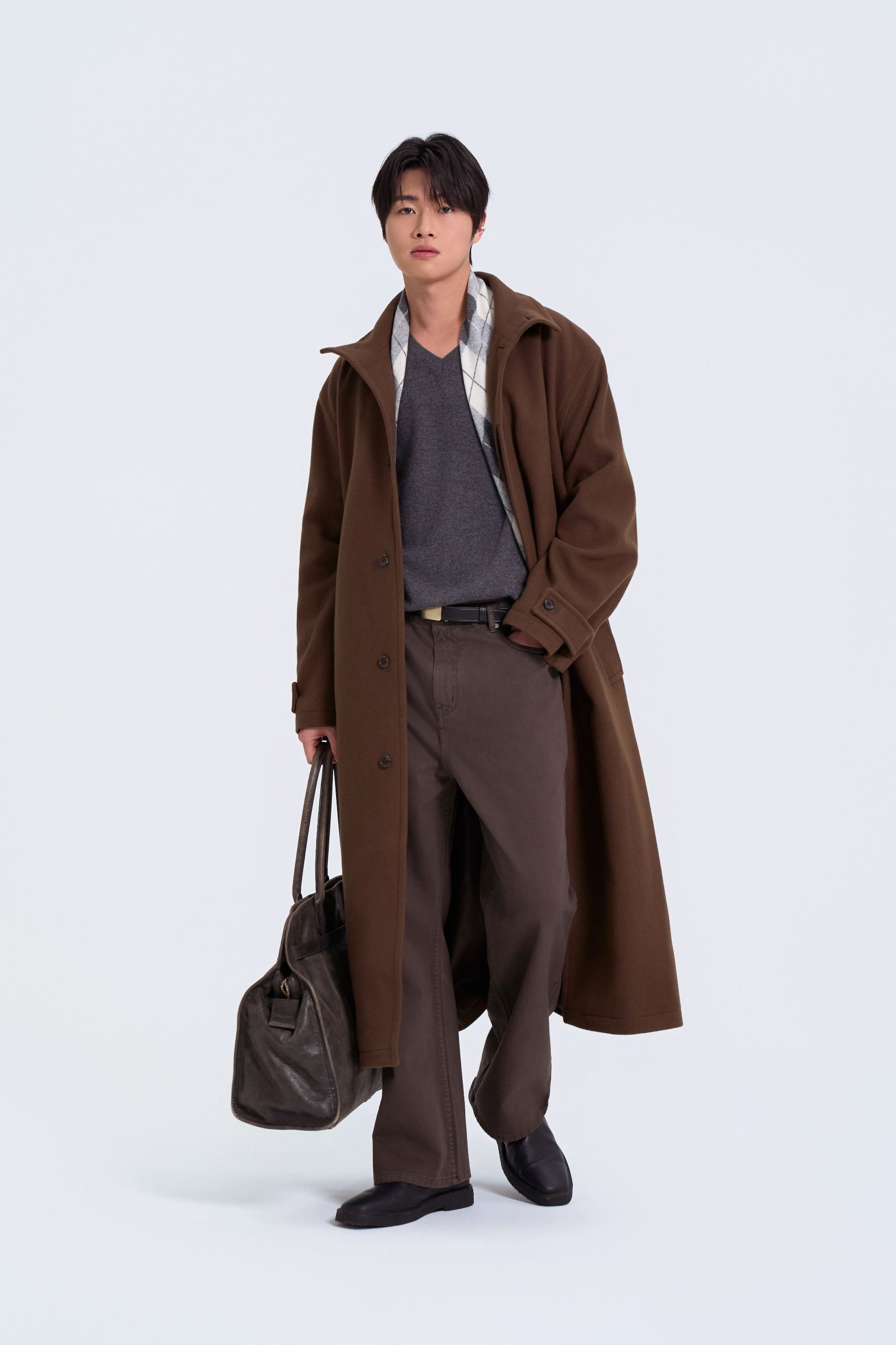 맨 살에 입어도 부드러운 브이넥 니트와 롱 코트, 빅 백으로 감성을 더했어요. 코트와 팬츠를 톤온톤으로 매치해 단정하게 연출해요.