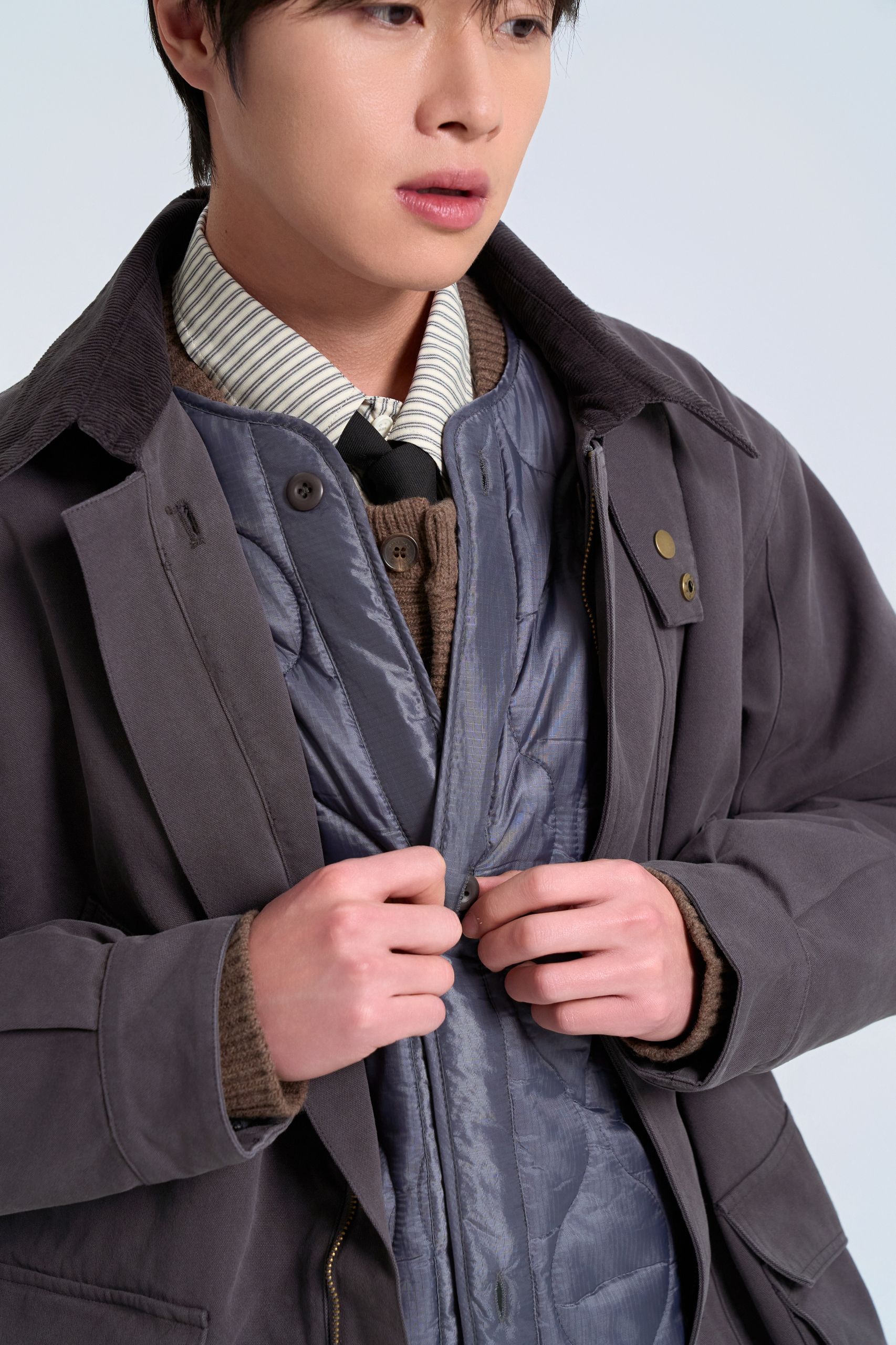 타이로 갖춰 입은 듯한 분위기를 주되 유틸리티 디테일이 있는 코트로 부담스럽지 않은 모임 스타일을 완성했어요. 탈부착 가능한 퀼팅 내피로 추위에도 거뜬해요.