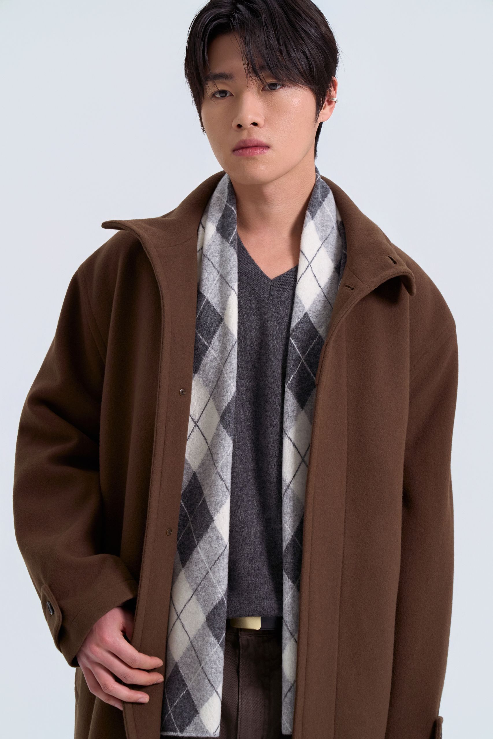 액세서리도 빠질 수 없죠. 니트와 색을 통일한 아가일 패턴 머플러와 벨트로 포인트를 더해요.