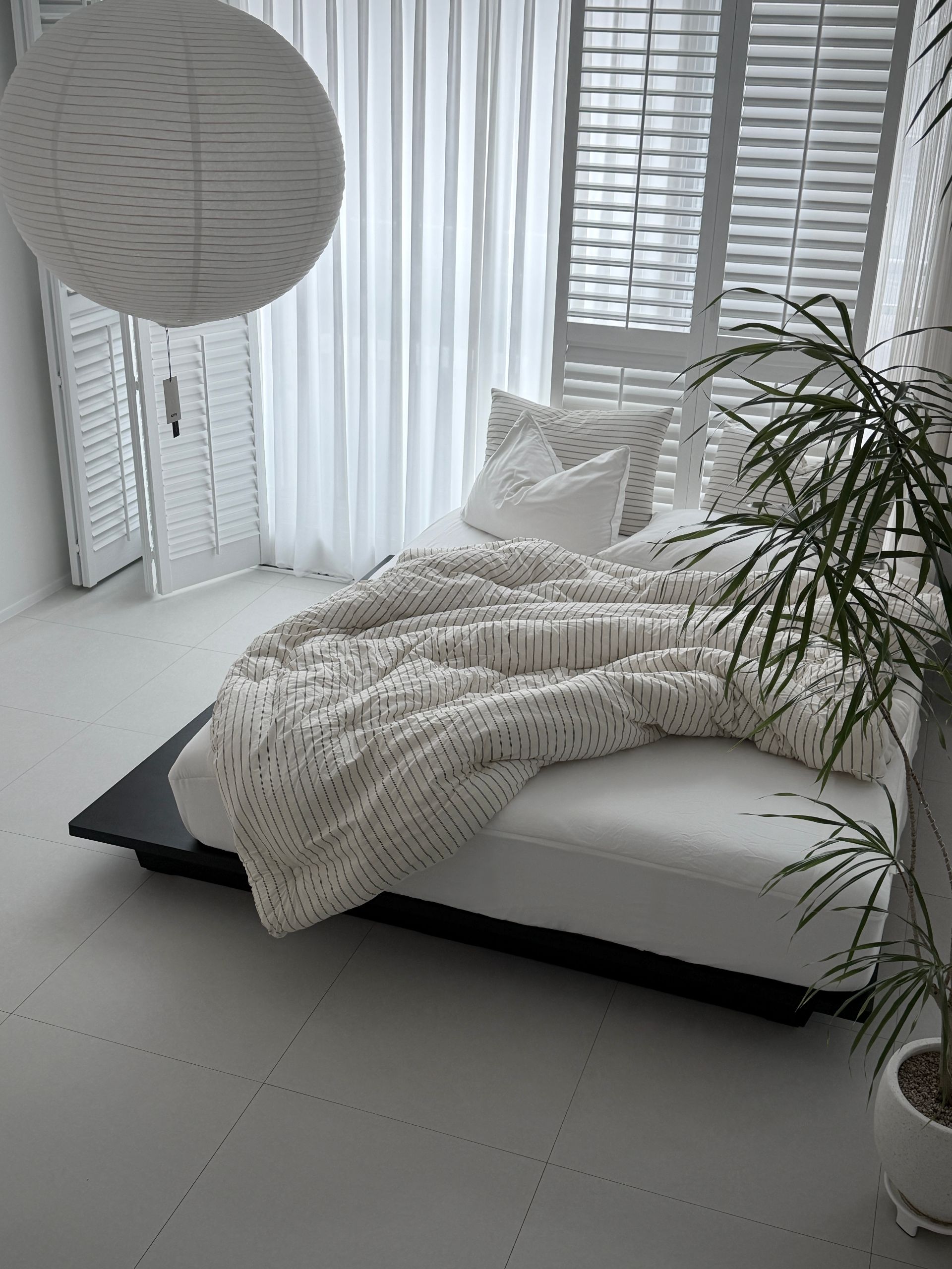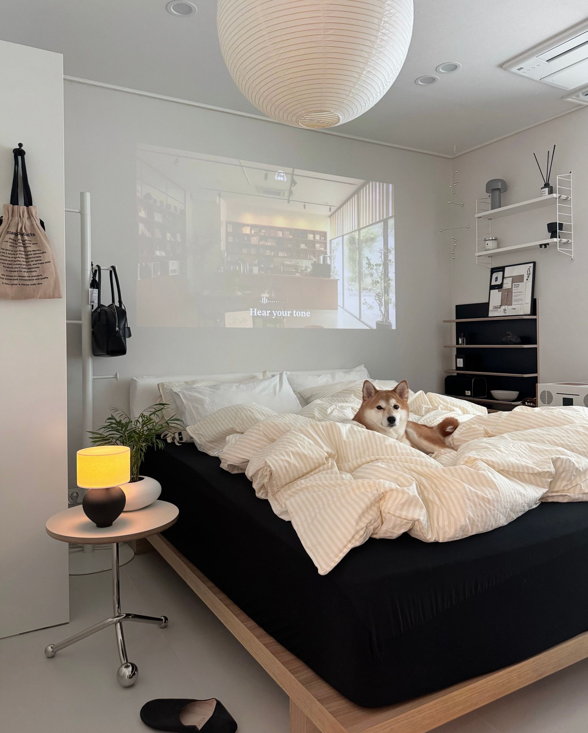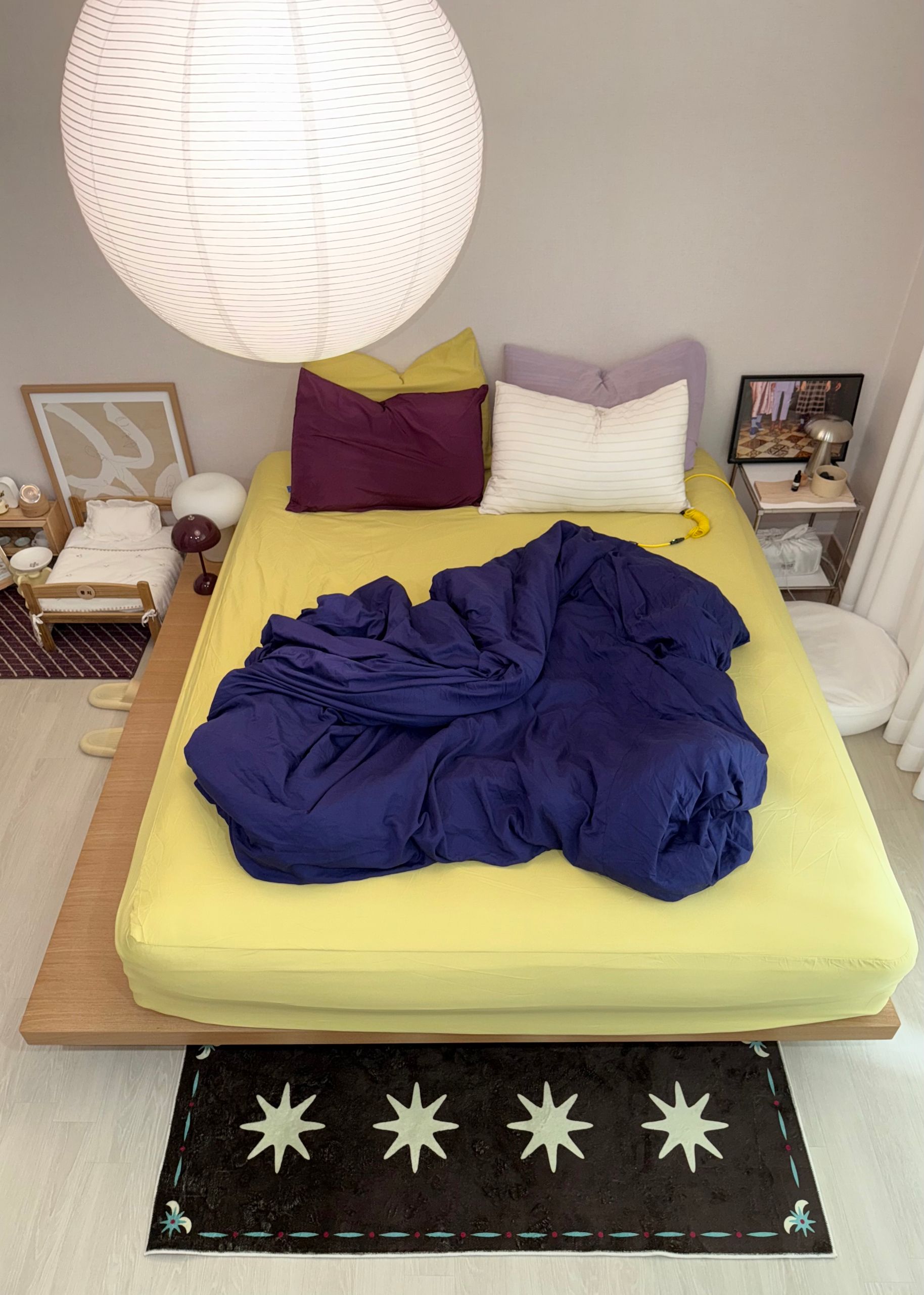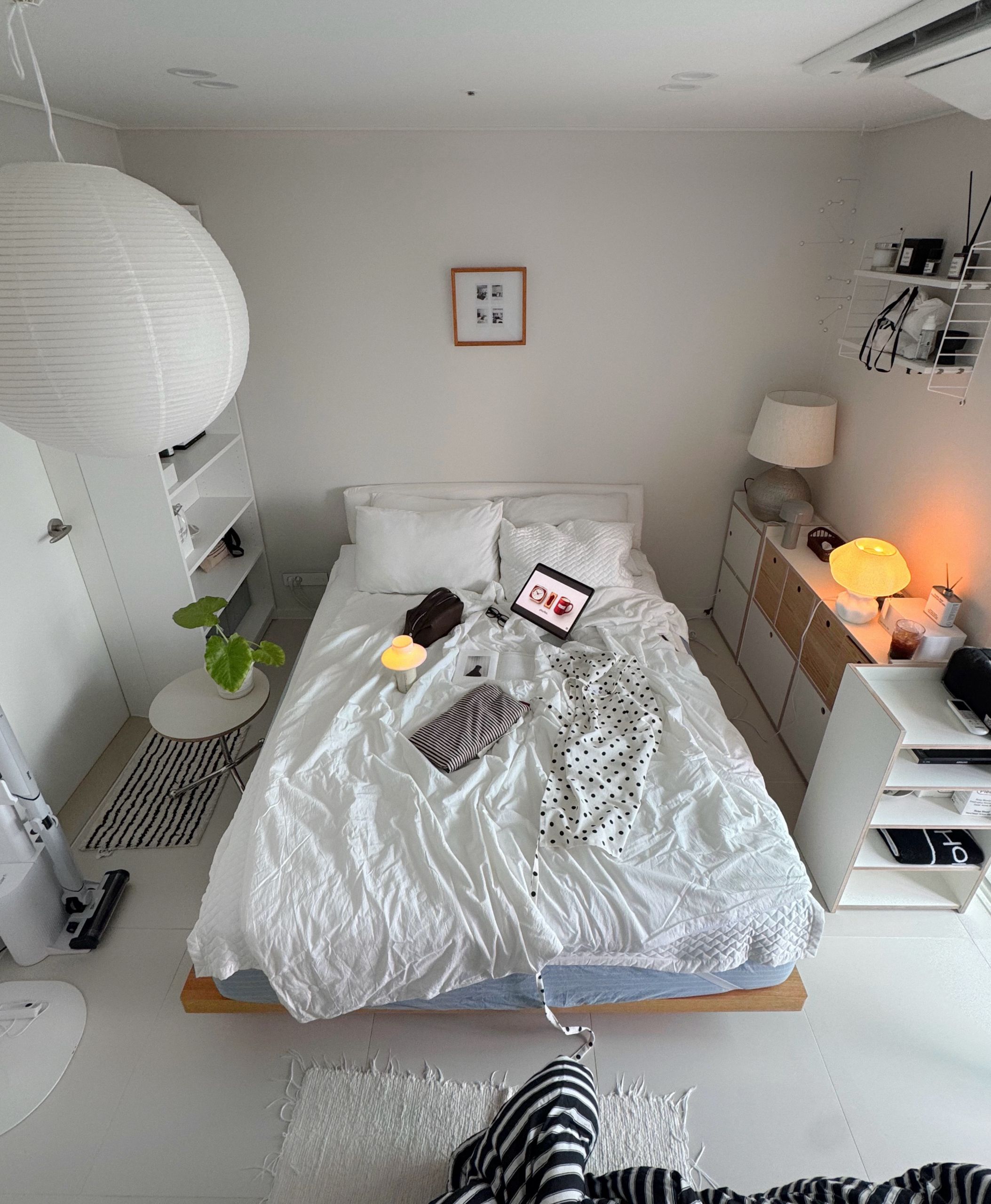 침실과 어울리는 조명을 바닥에 두어 주변을 밝히면 더욱 아늑한 무드를 만들 수 있어요. 침대 충분히 미니멀하기 때문에 다양한 질감과 크기의 소품을 함께 매치하면 자신만의 침실을 만들어 볼 수 있습니다.
