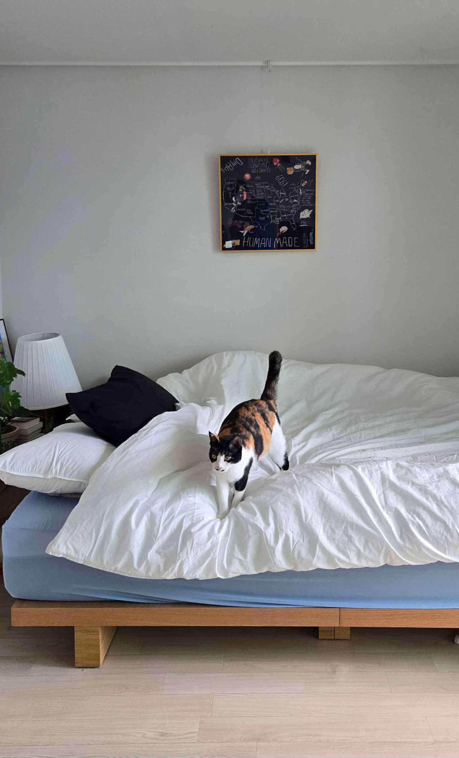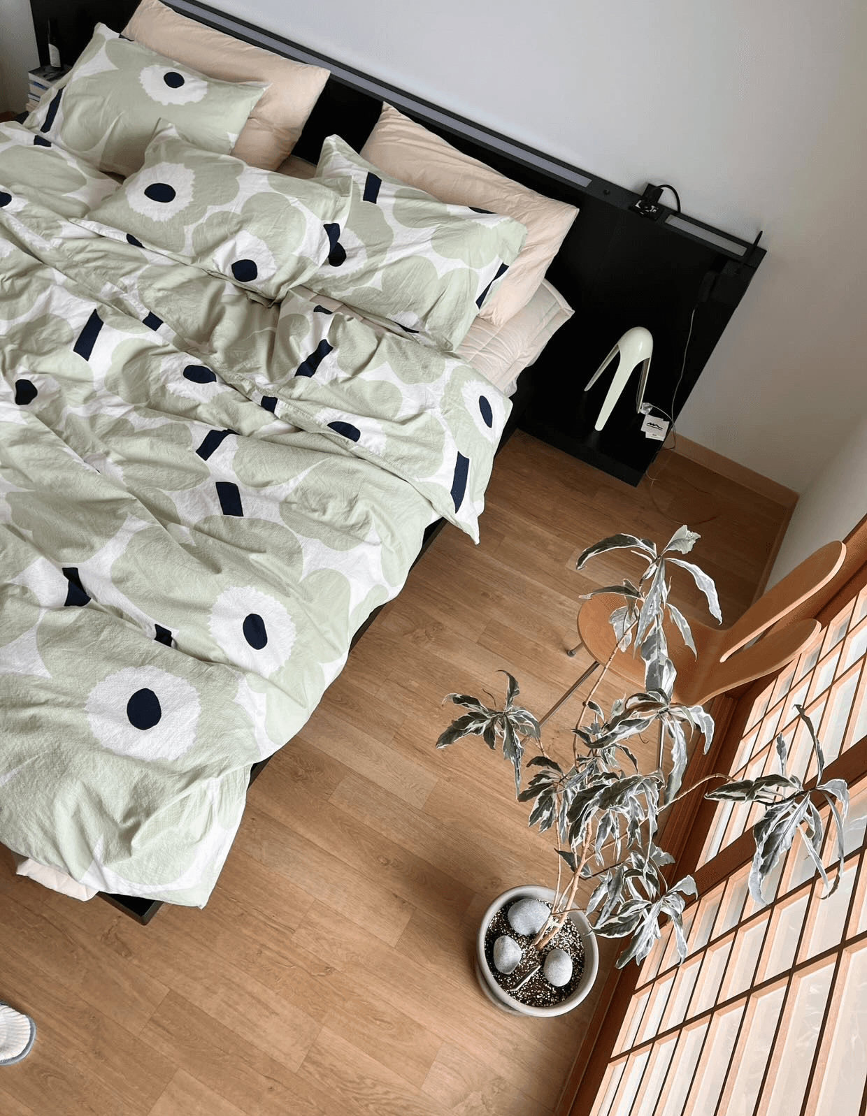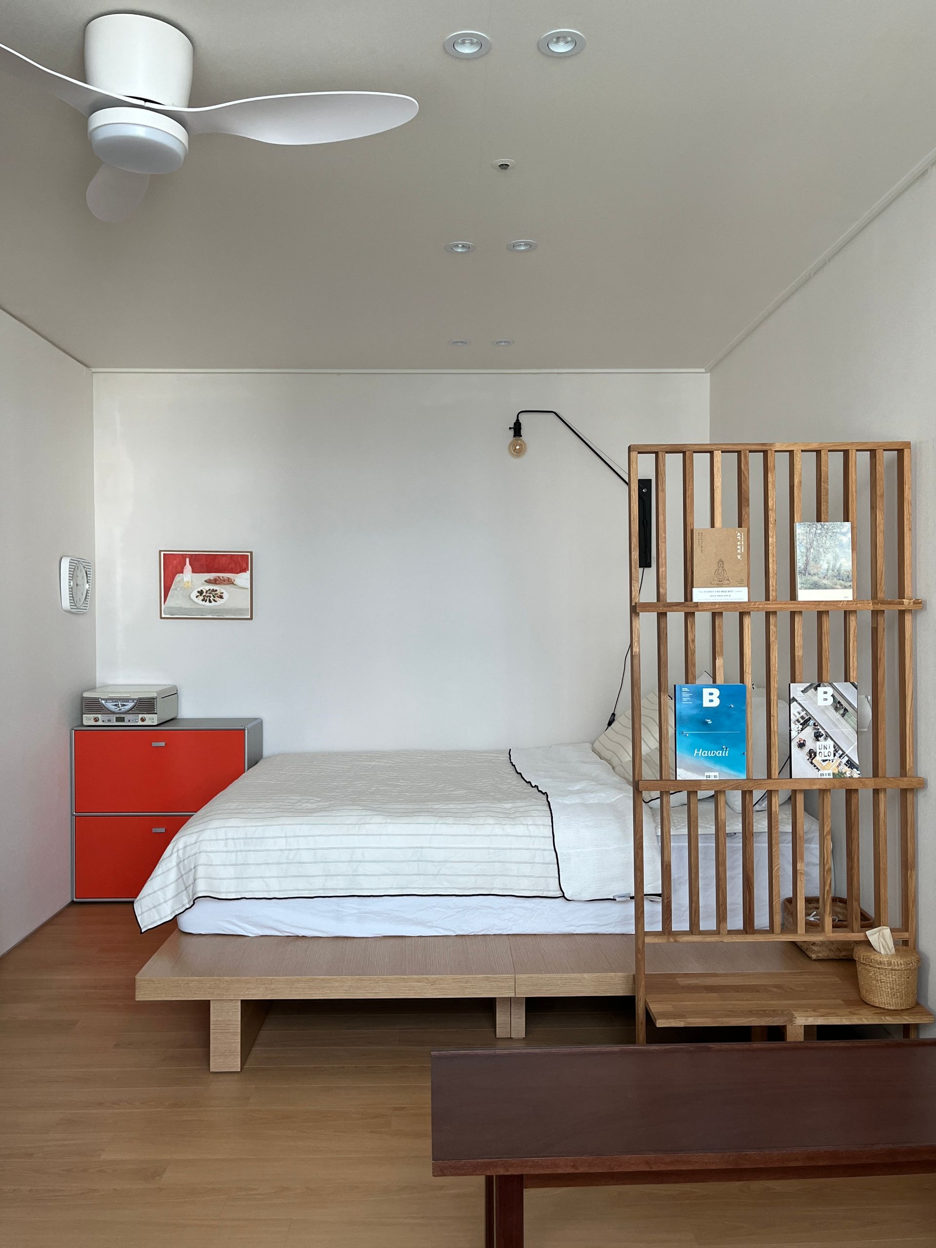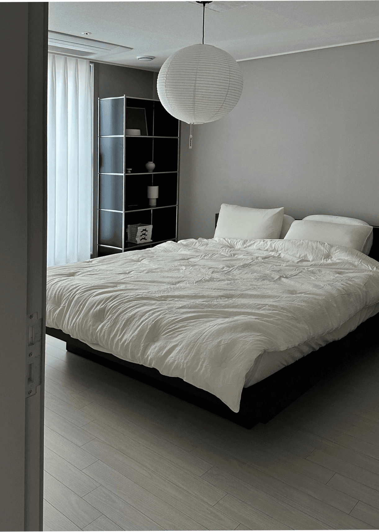 침실과 어울리는 조명을 바닥에 두어 주변을 밝히면 더욱 아늑한 무드를 만들 수 있어요. 침대 충분히 미니멀하기 때문에 다양한 질감과 크기의 소품을 함께 매치하면 자신만의 침실을 만들어 볼 수 있습니다.