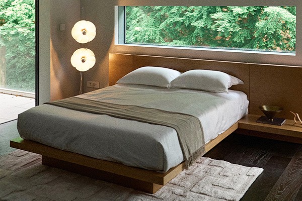 헤드보드 없는 간결한 디자인이지만 좌우를 길게 가로지르는 다릿발로 디자인 포인트를 주었어요. 천연 무늬목은 에이징의 깊이를 기대하게 합니다.