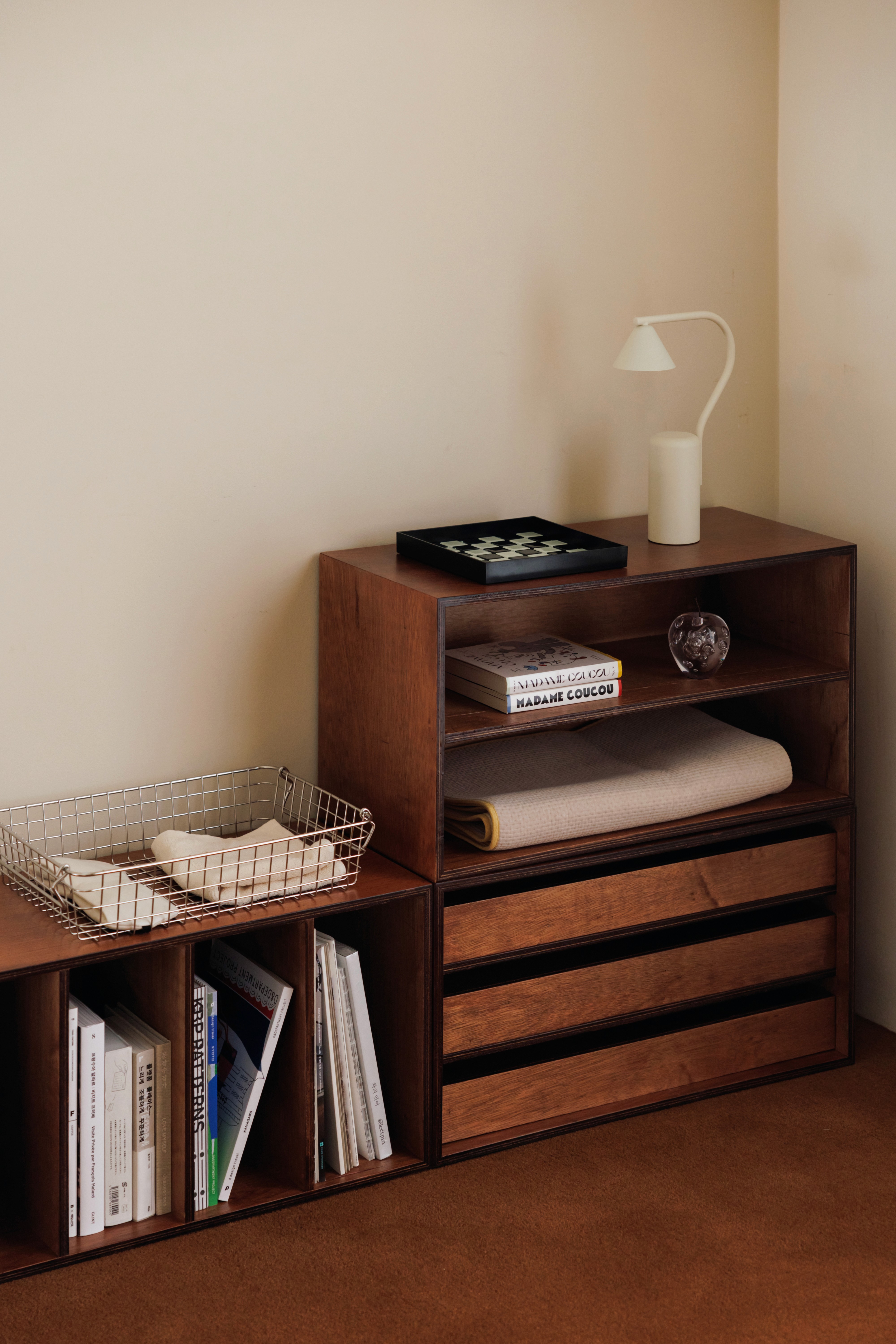 별도의 도구 없이 간단하게 쌓아 사용할 수 있는 간결한 형태의 수납장이에요. 나왕의 자연스러운 나뭇결이 편안한 분위기를 만들어 줄 겁니다.