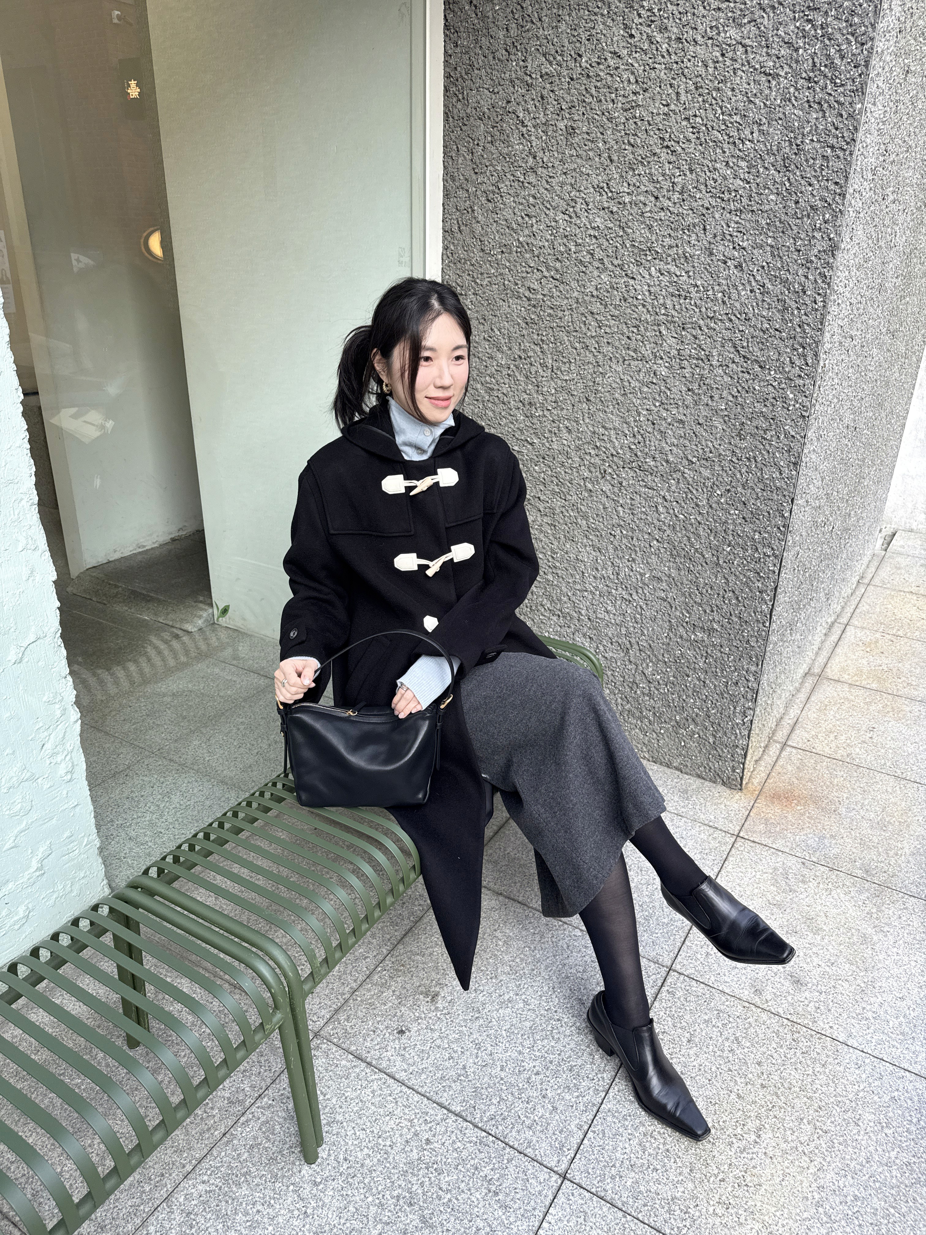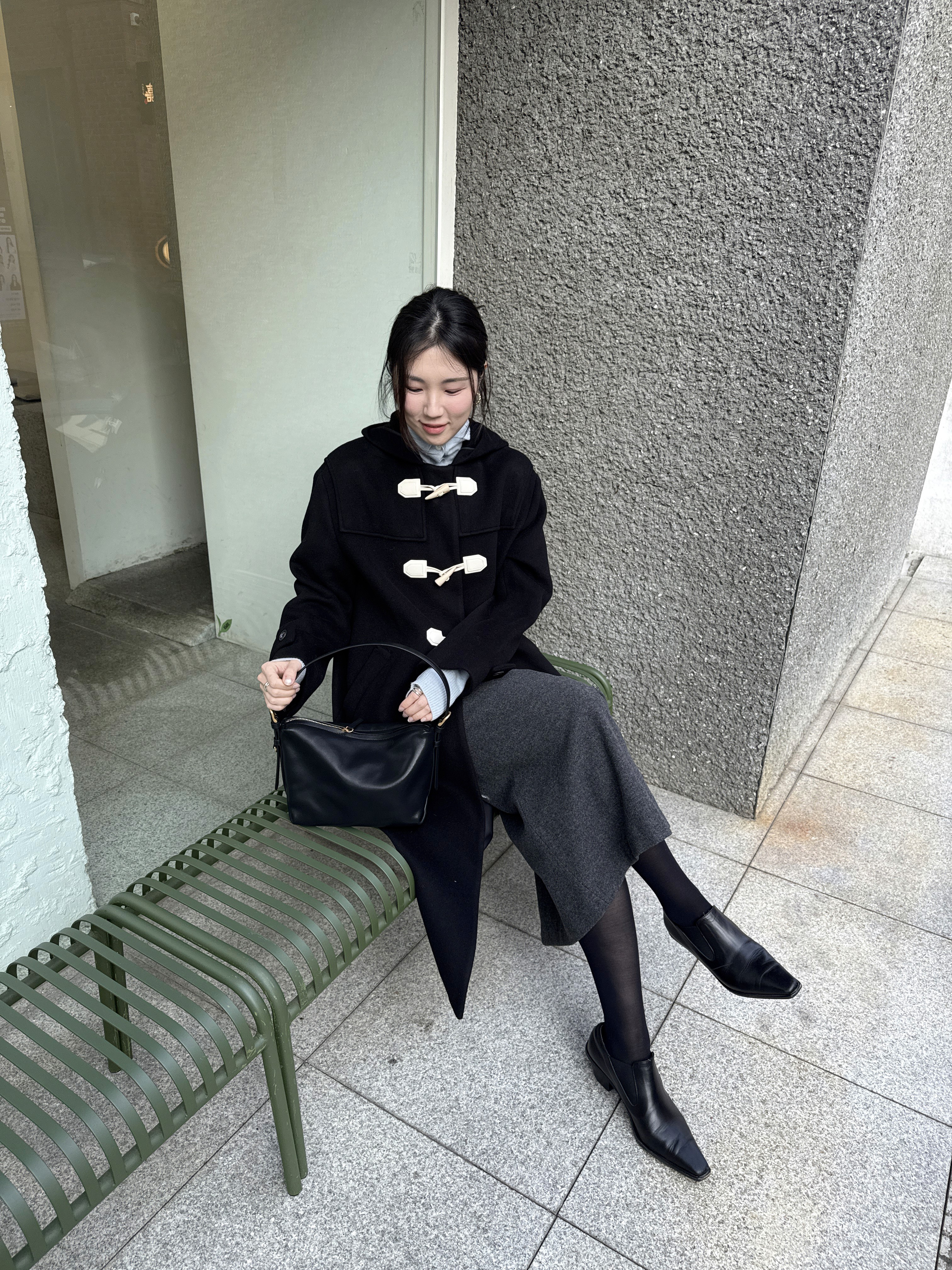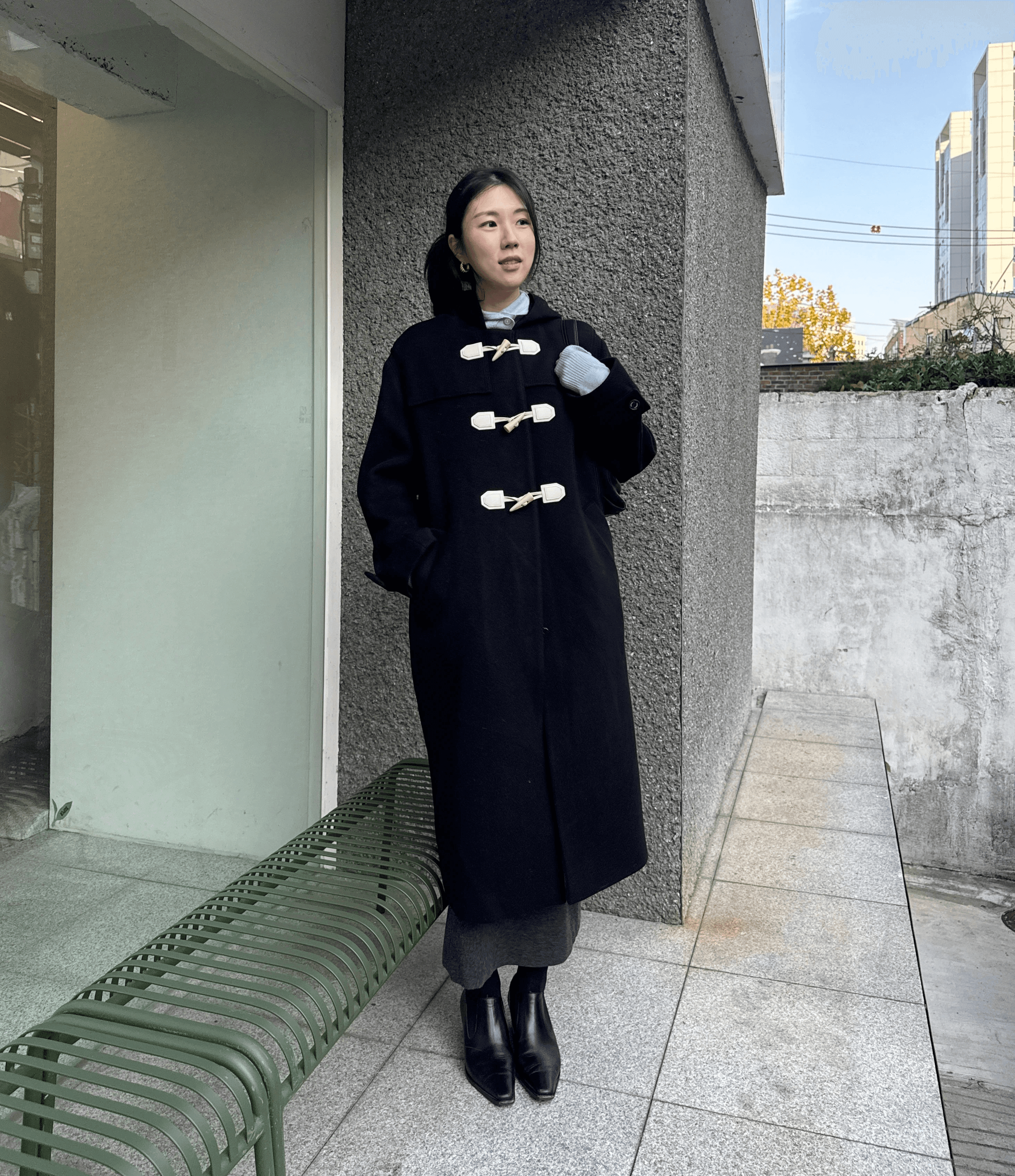 롱한 기장감에 여유 있으면서도 슬림하게 떨어지는 핏의 더플 코트로, 후드가 있어 다양한 느낌을 낼 수 있습니다.클래식한 느낌의 화이트 컬러 토글 단추로 포인트를 주어 심플하면서 고급스러운 제품입니다.