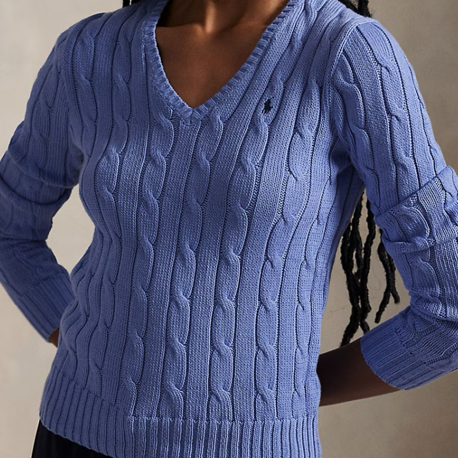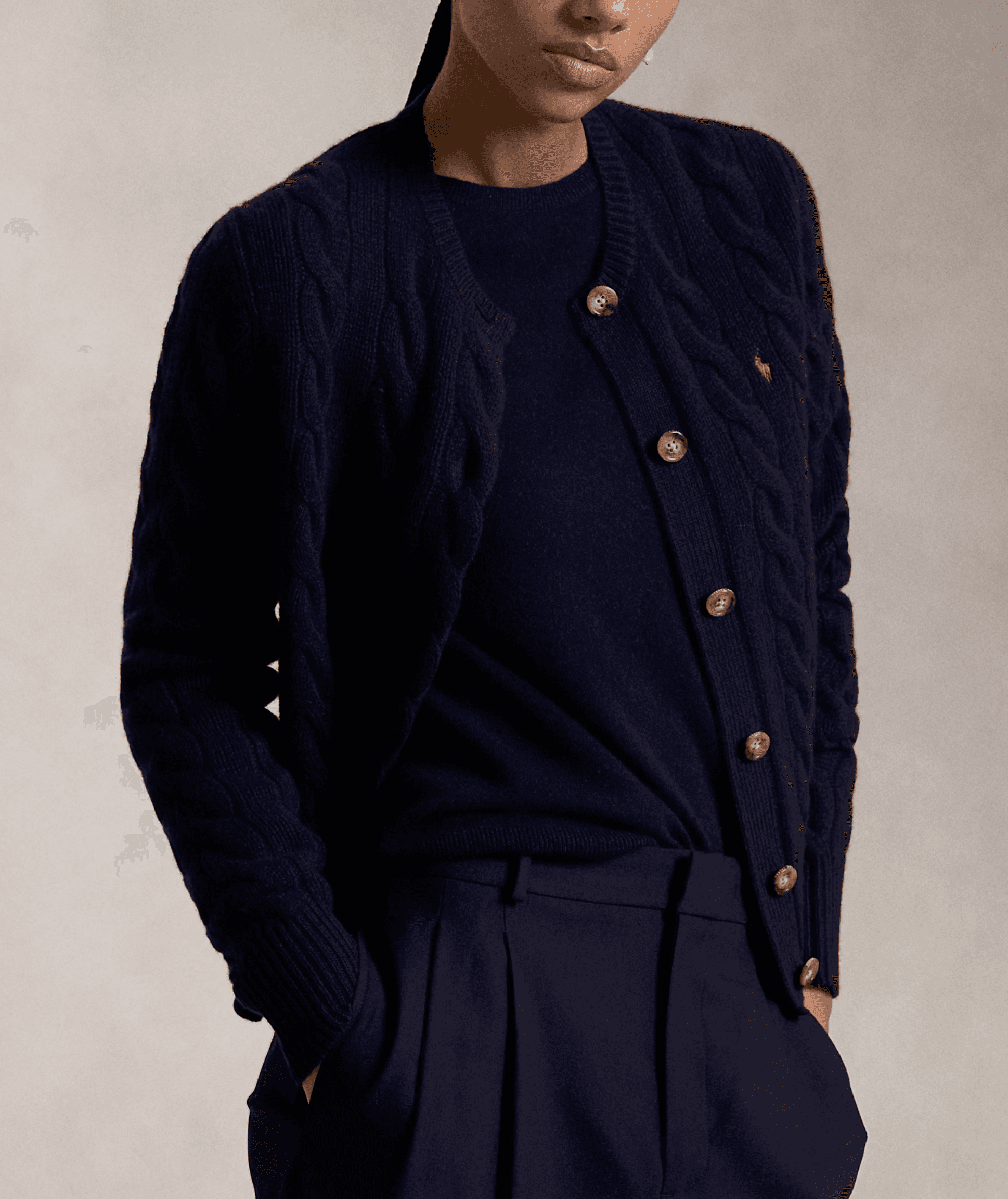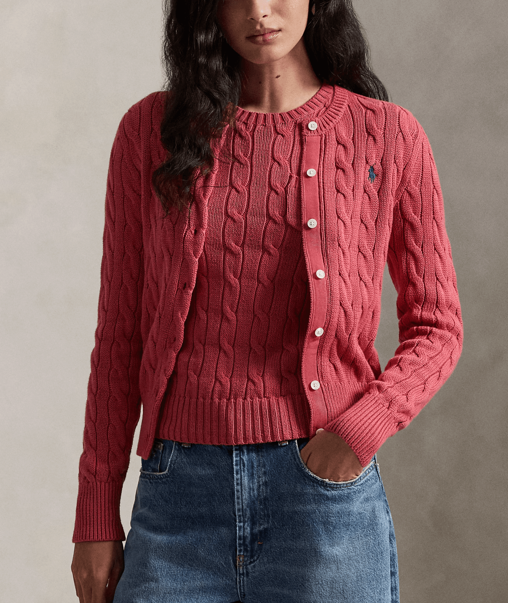 이탈리아산 울과 카딩 처리한 캐시미어가 혼방된 부드러운 소재에 케이블 니트 조직을 적용한 버튼 크루넥 카디건으로, 체스트에 시그니처 포니 자수가 돋보이는 아이템입니다.
