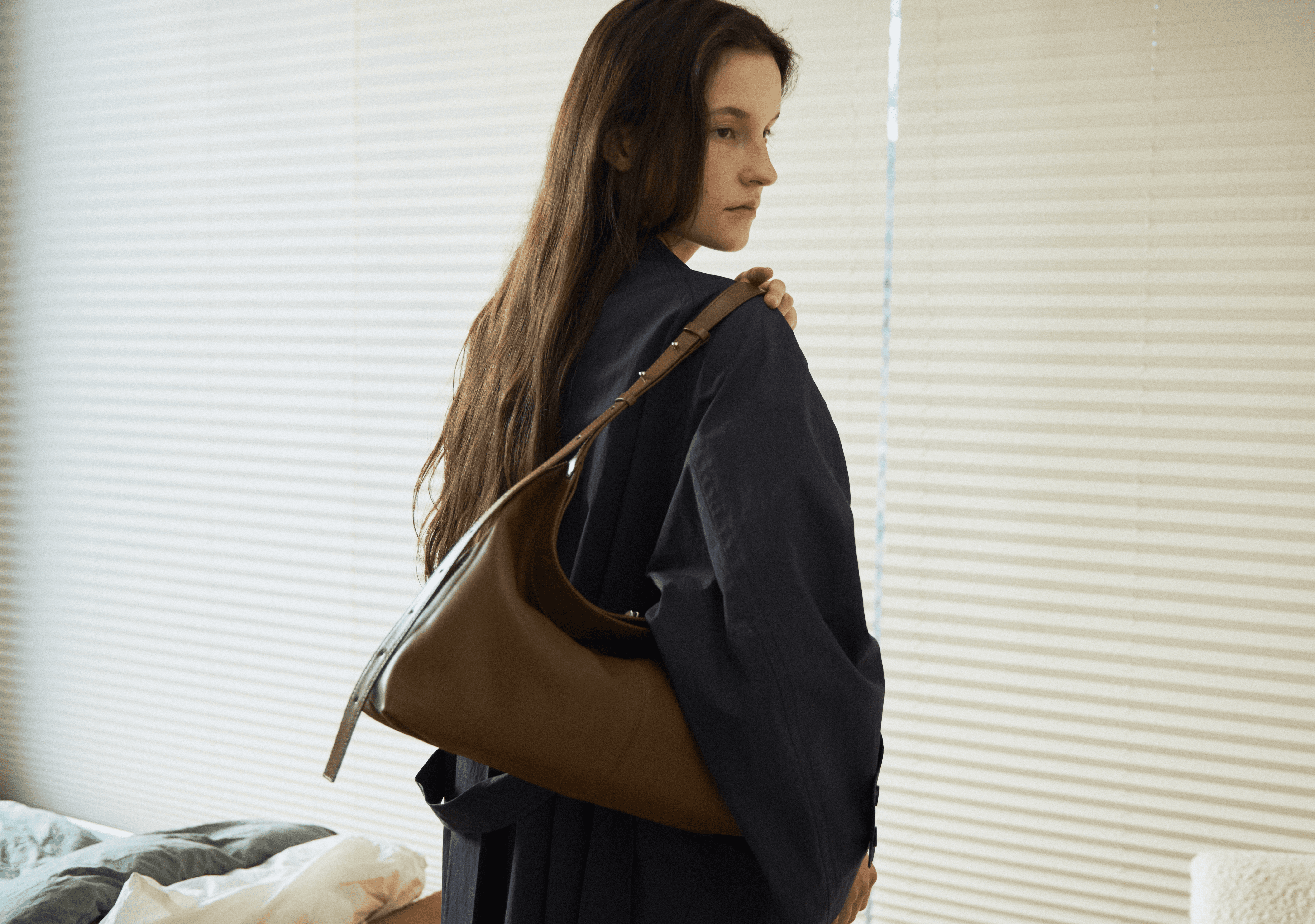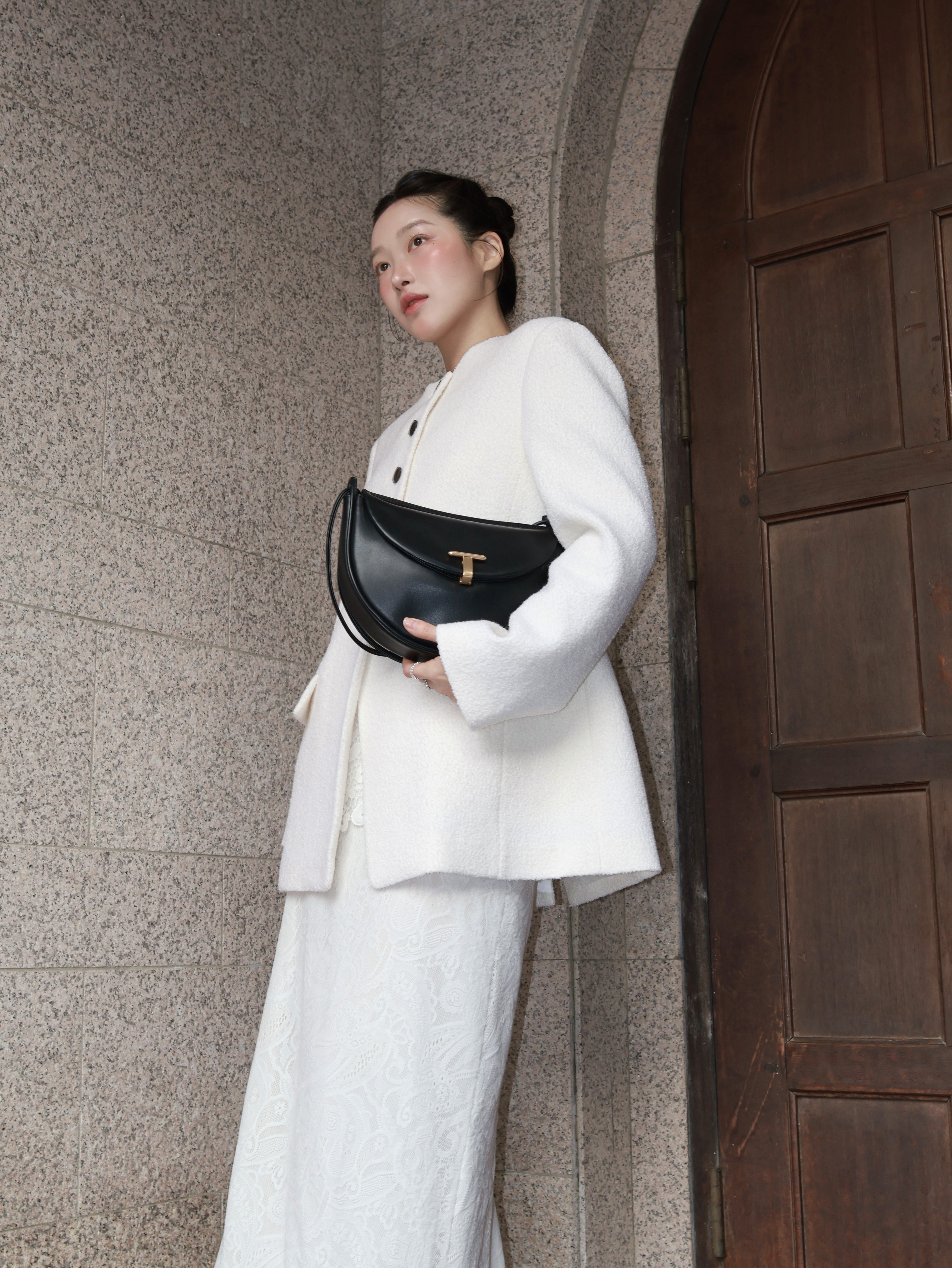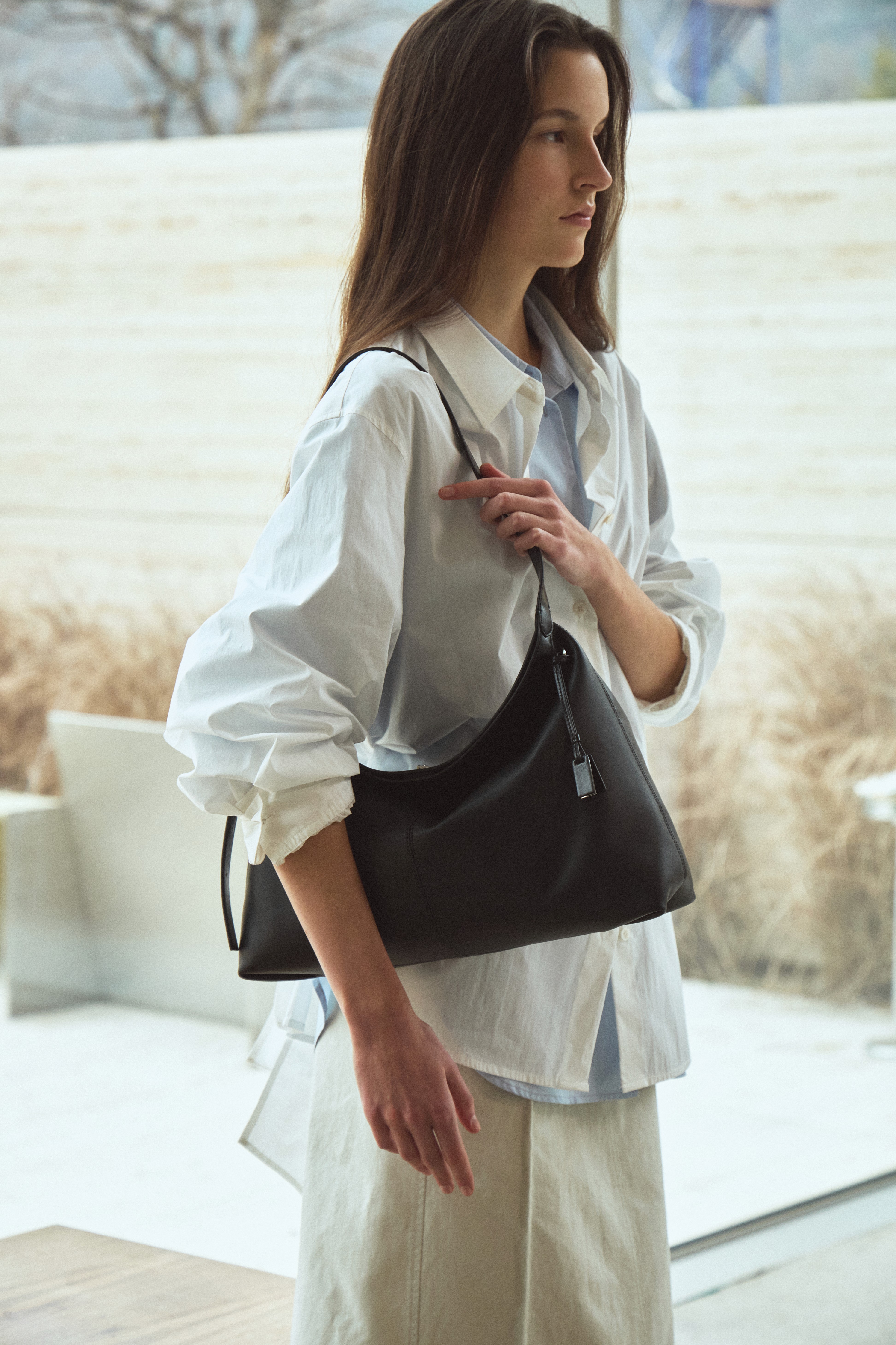 슬림하고 가벼운 바디에 섬세한 띠 디테일이 더해져 여성스러움이 가미된 숄더백입니다. 자연스러운 슬라우치되는 바디감으로 SS 시즌 가볍게 들기 좋아요.