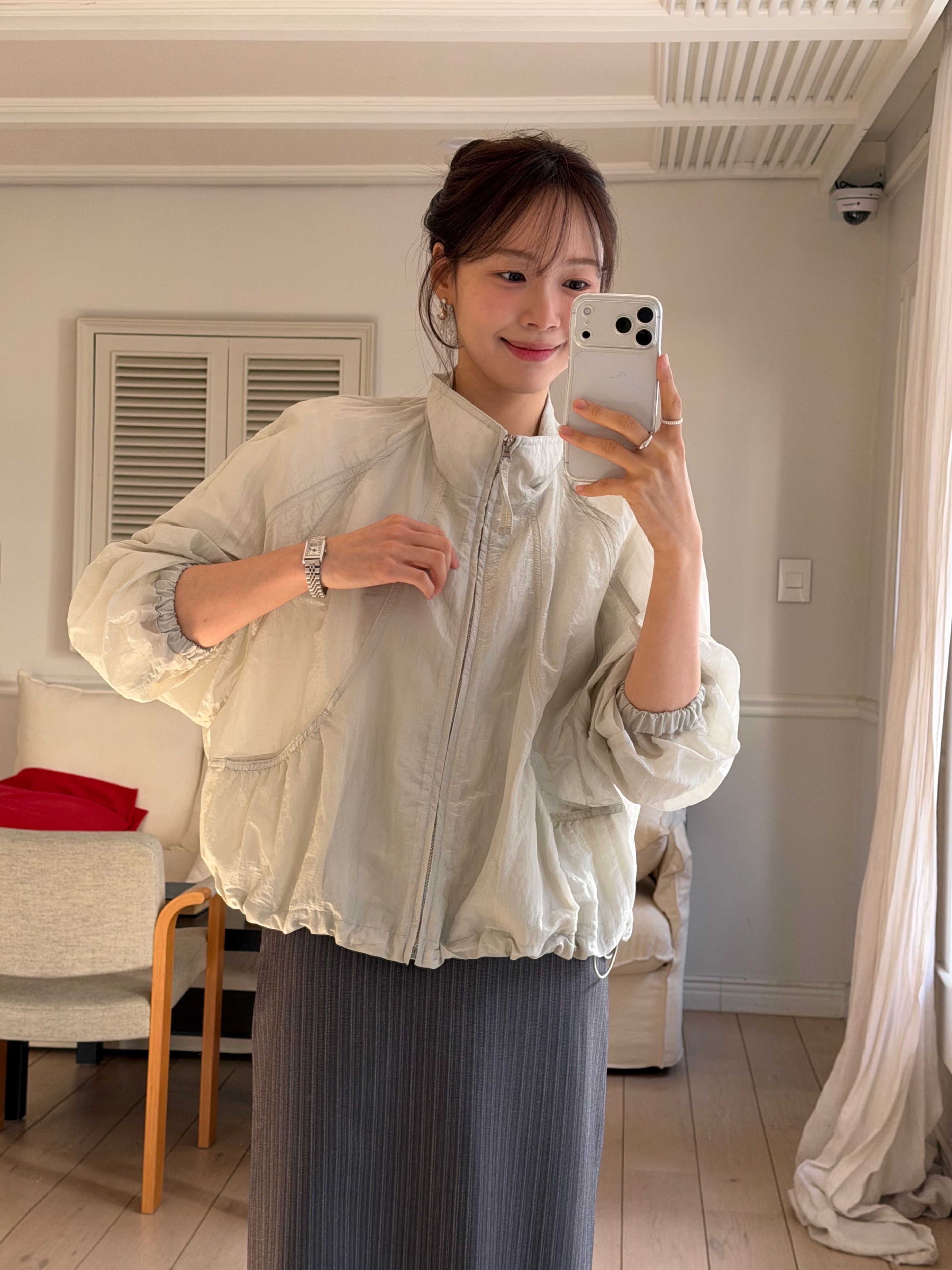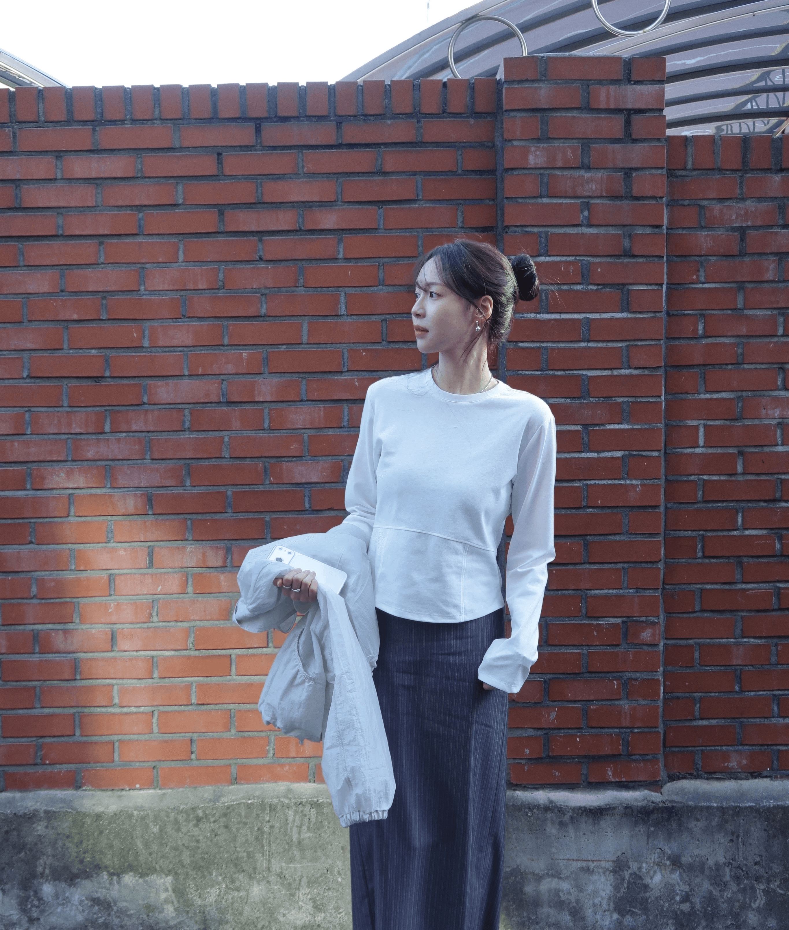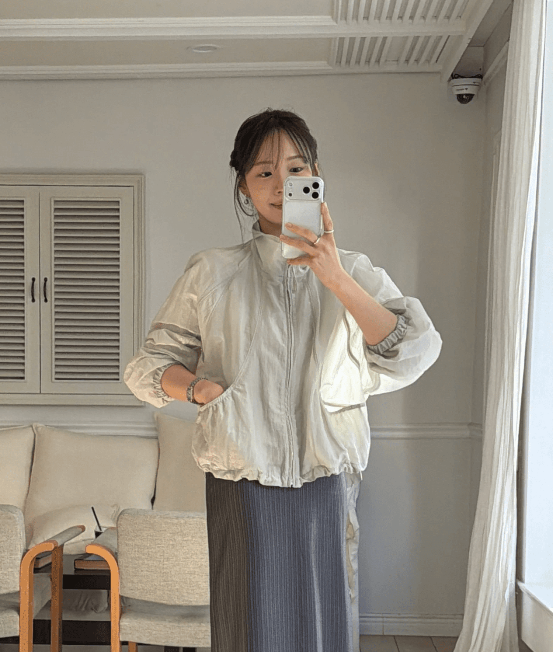 스포티한 경쾌함과 클래식한 우아함을 동시에 갖춘 룩입니다. 셔링 디테일의 크롭 점퍼가 활동적인 느낌을 주면, 슬림한 롱 티셔츠와 벨티드 스트라이프 스커트가 전체적인 비율을 드라마틱하게 살려줍니다. 편안하면서도 갖춰 입은 듯한 느낌을 주어 데일리 룩은 물론 격식 있는 외출복으로도 손색이 없습니다.