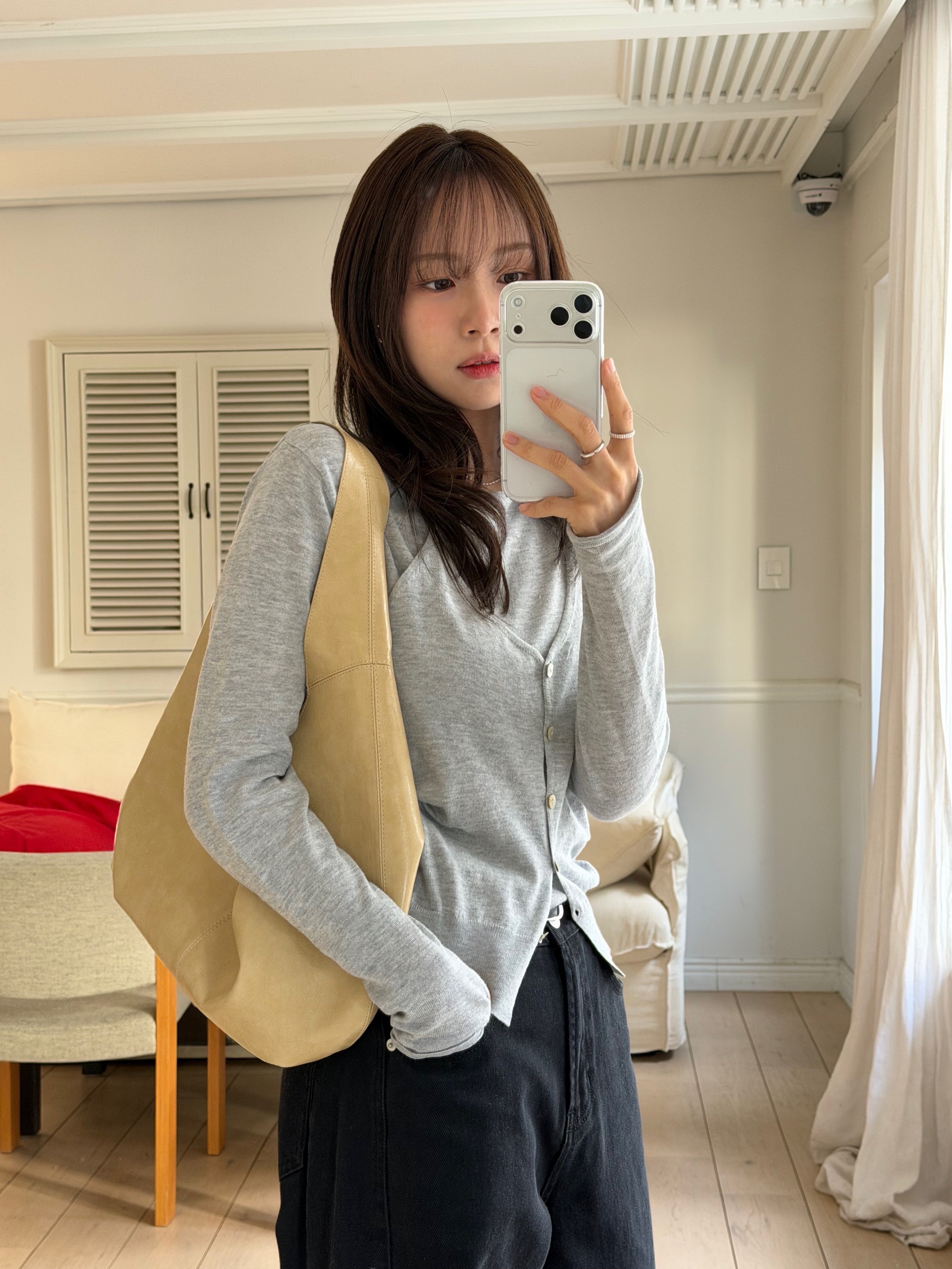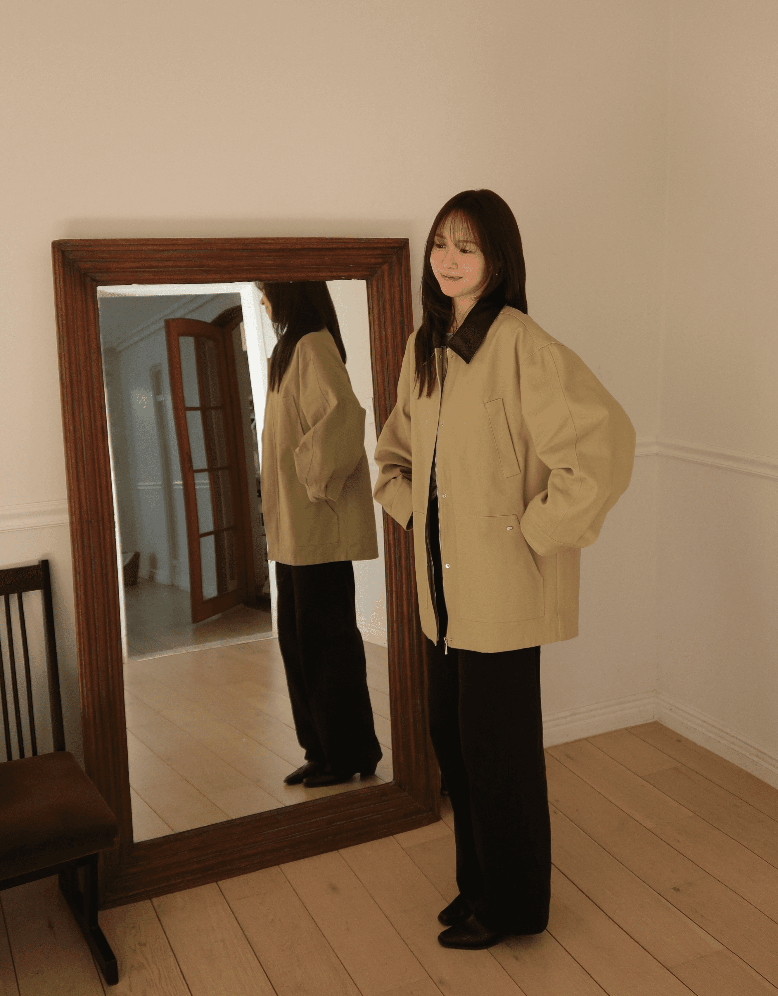 이번 조합은 빈티지한 워크웨어 무드에 여성스러운 디테일을 한 방울 섞은 감각적인 어반 빈티지 룩을 연출해보세요. 레더 칼라 포인트의 코튼 자켓이 주는 무심하고 쿨한 분위기와 , 커브드 실루엣의 데님 팬츠가 전체적인 룩에 입체적이고 트렌디한 볼륨감을 더해줍니다. 여기에 라운드 숄더백을 매치해 완성도 높은 코디를 참고해보세요.