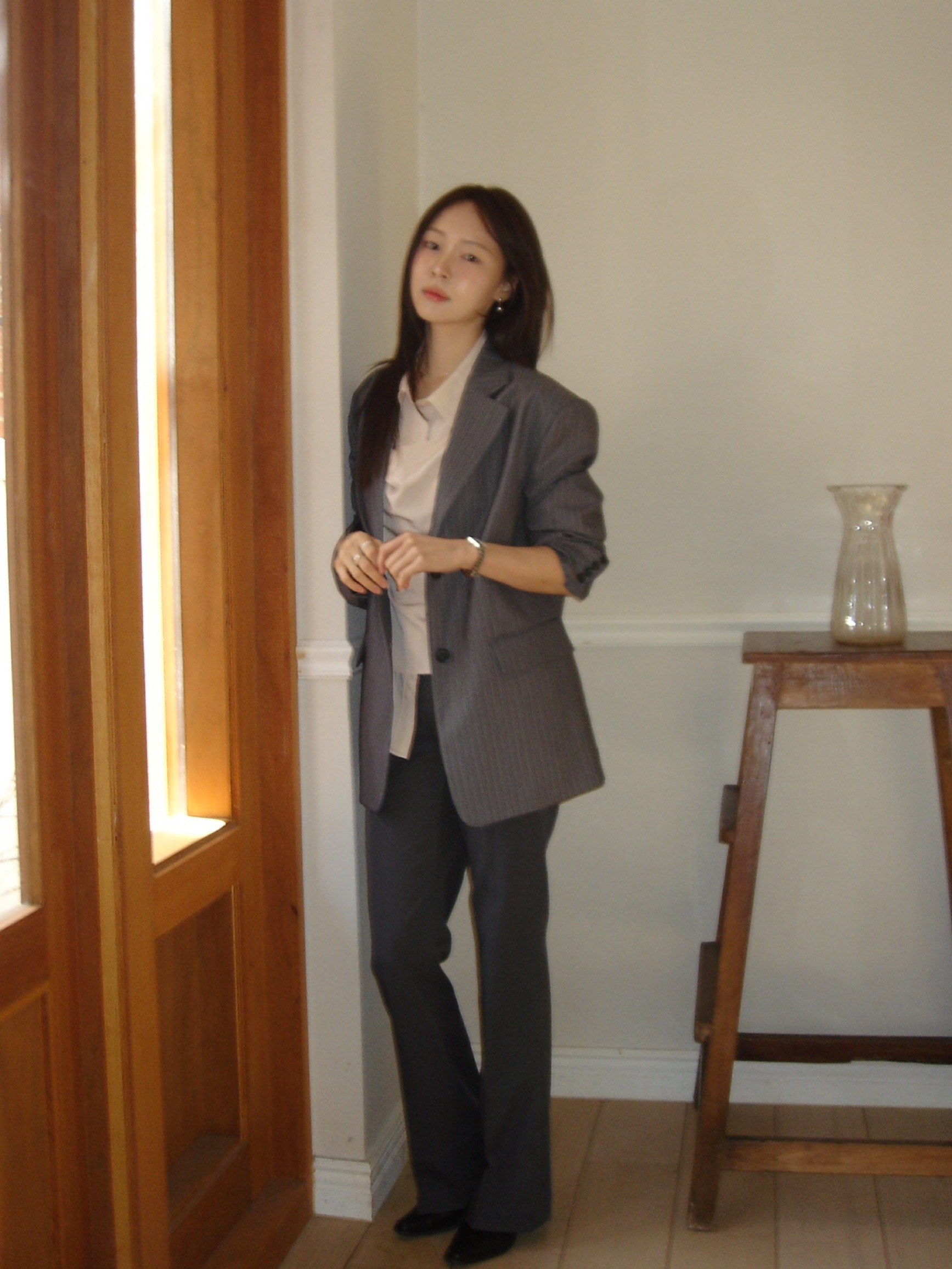 세련된 비즈니스 캐주얼의 정석으로 풀어낸 룩이에요. 매니시하고 현대적인 무드의 재킷과 홀터넥으로 연출된 블라우스로 스타일리시하게 연출했어요. 부츠컷 팬츠가 다리 라인을 길게 잡아주어 전체적으로 길어 보이고 슬림한 실루엣을 완성합니다.