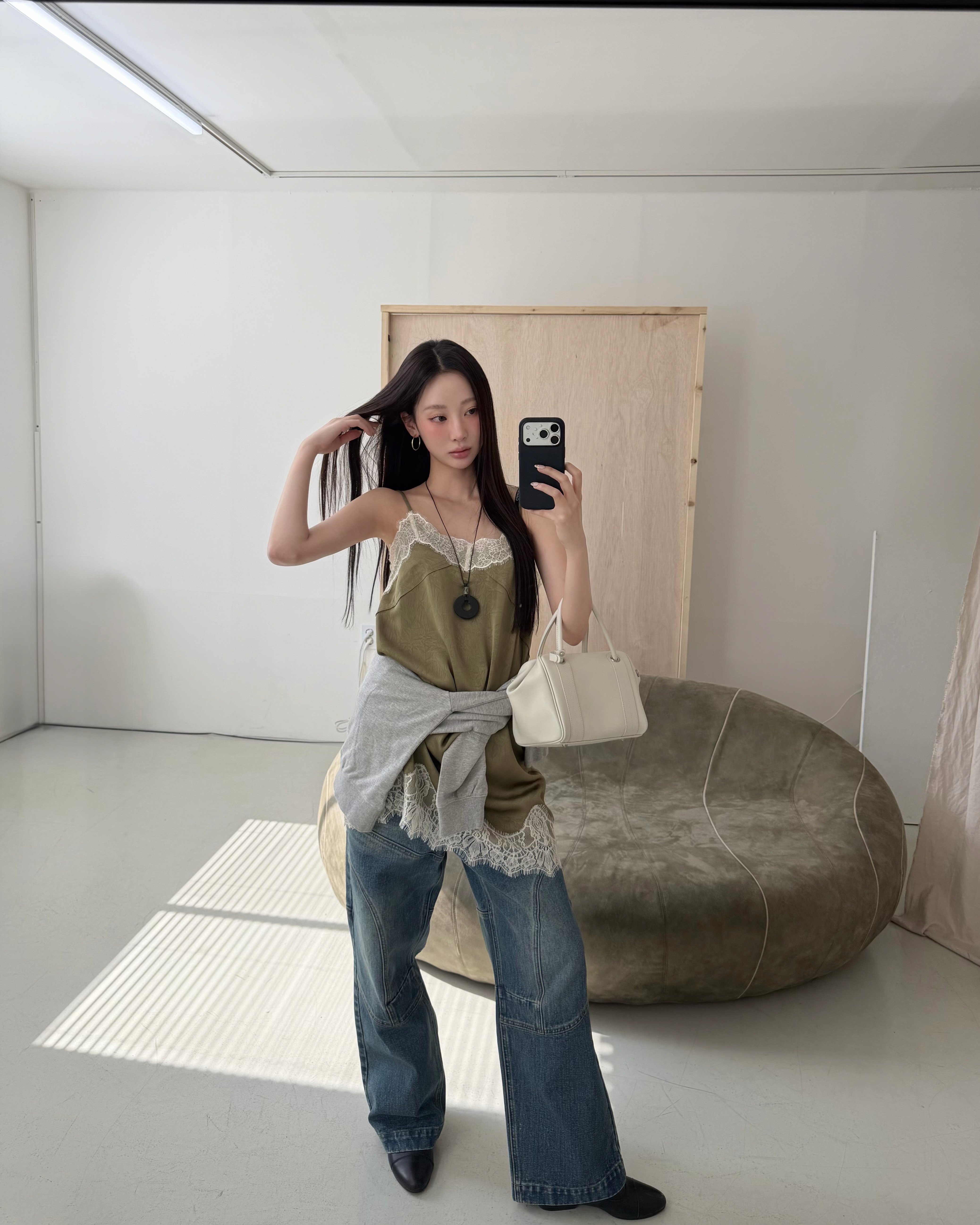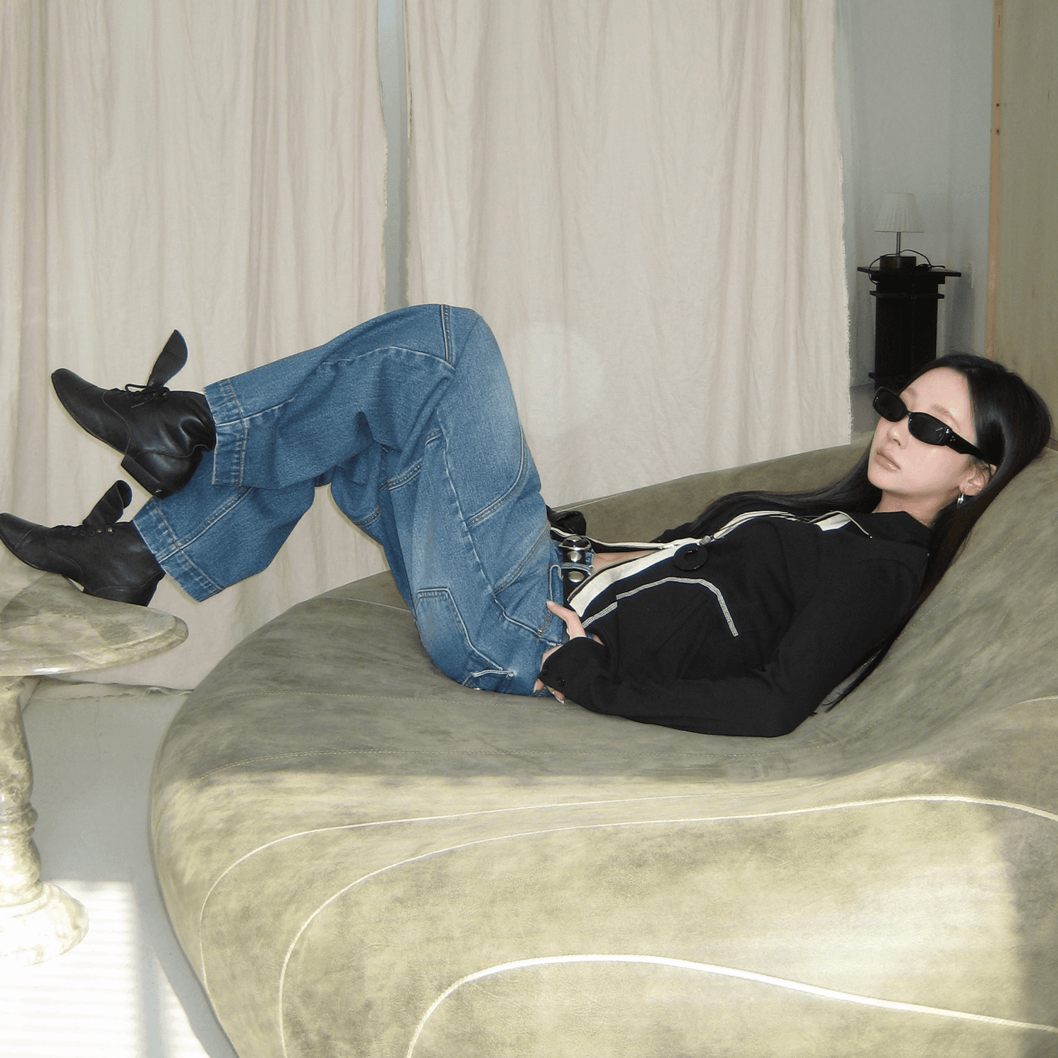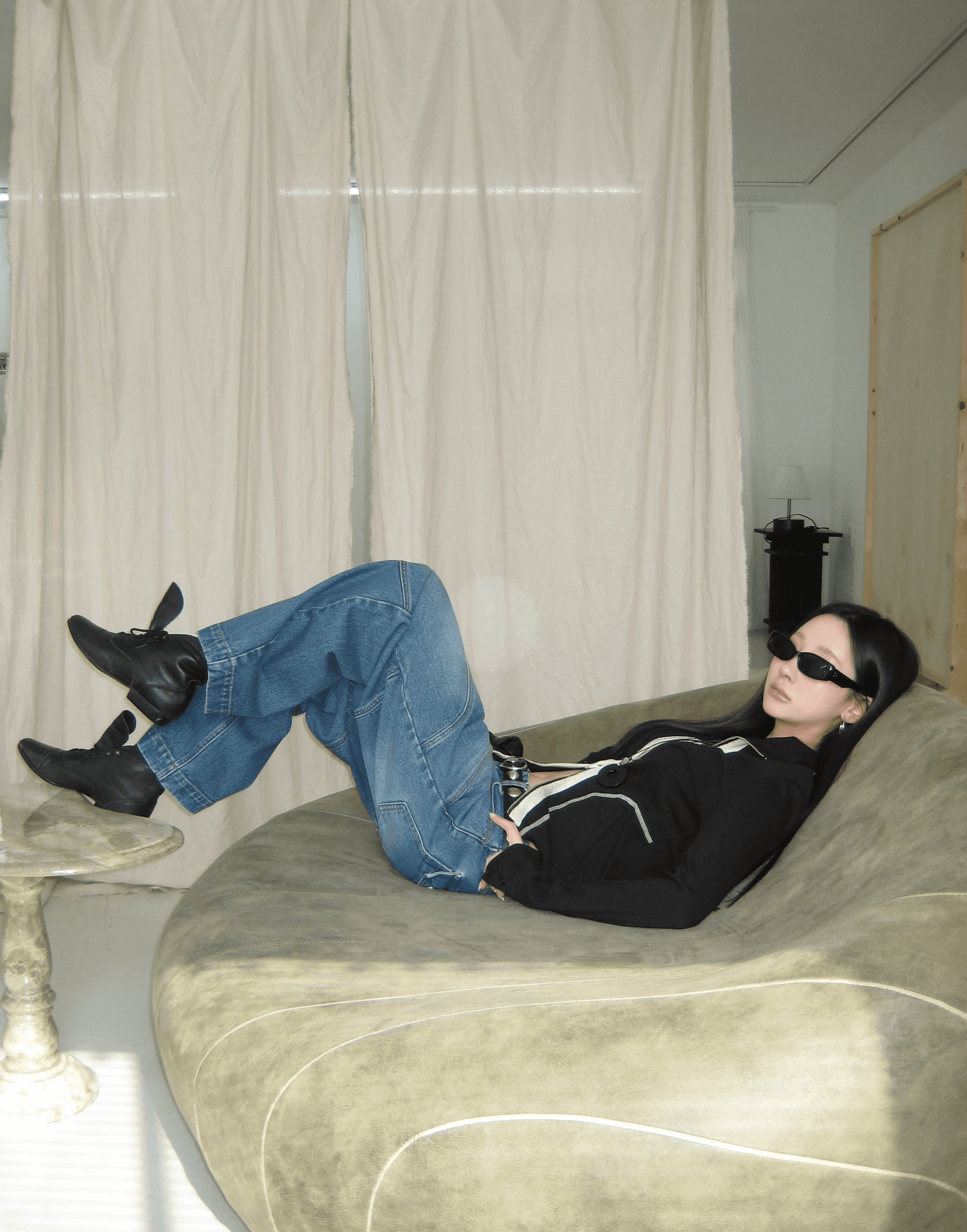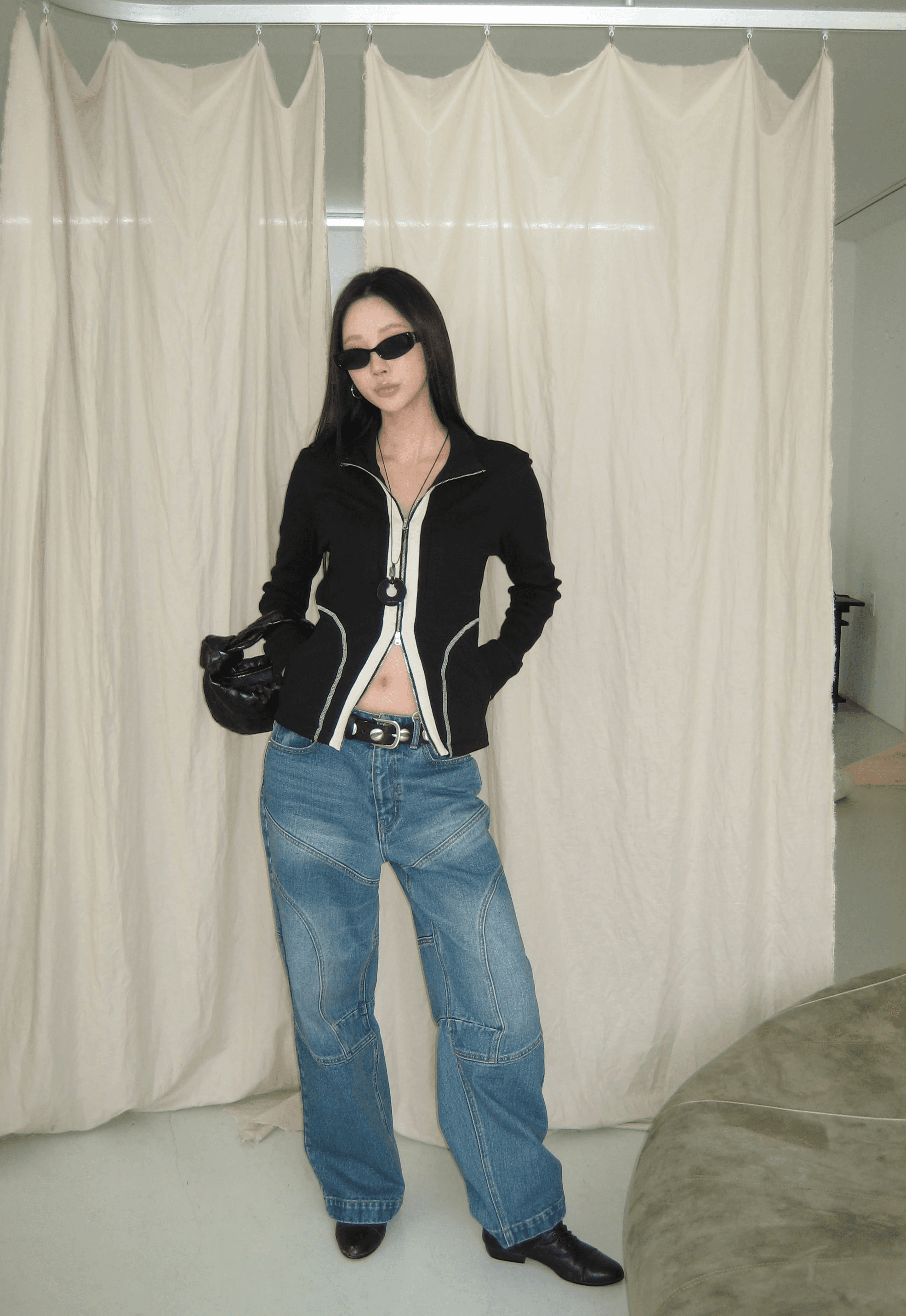 세미 벌룬 와이드 핏의 라인 절개 디자인이 포인트인 데님 팬츠에요.
