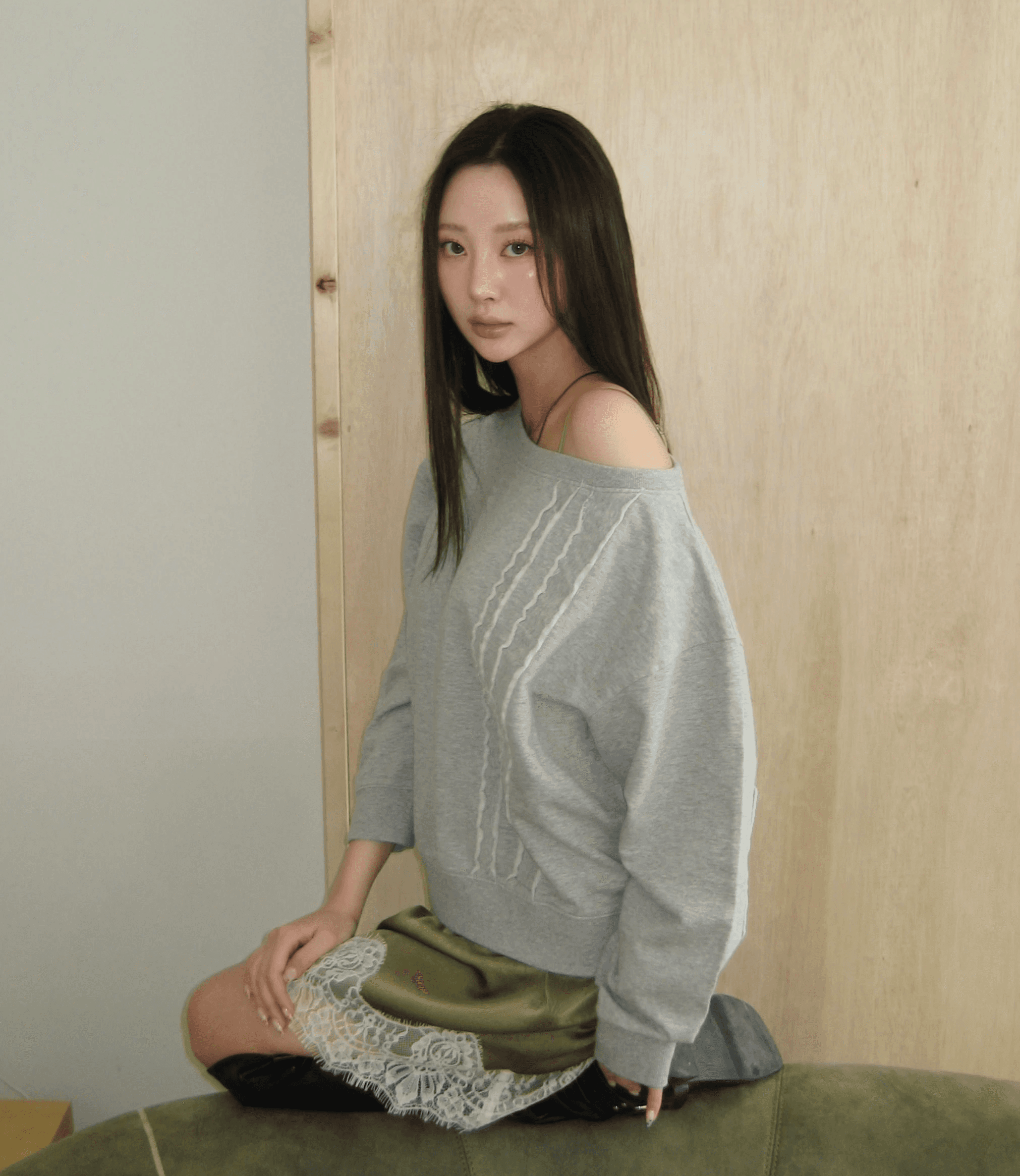 컷아웃 패치 디테일의 스웨트셔츠. 와이드한 보트넥으로 오프숄더로도 연출이 가능하며, 여유로운 핏으로 편안하게 착용할 수 있어요.