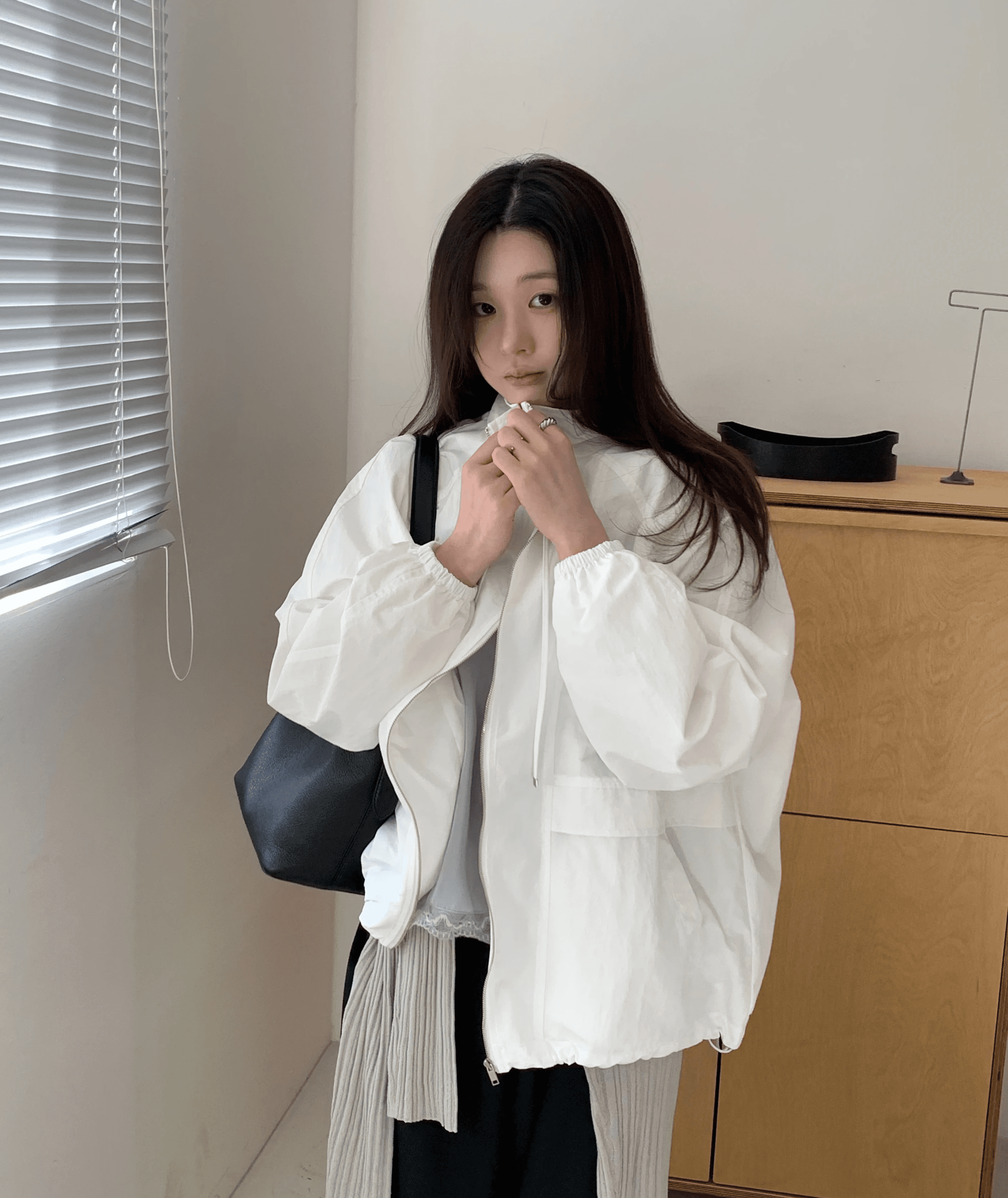 가볍고 탄탄한 나일론 100% 소재로 바람을 막고 생활 방수가 가능한 점퍼입니다. 안감이 있어 간절기에 착용하기 좋으며, 루즈핏과 나그랑 소매로 활동성이 높습니다. 하이넥과 스트링, 포켓으로 실용성을 더했습니다.