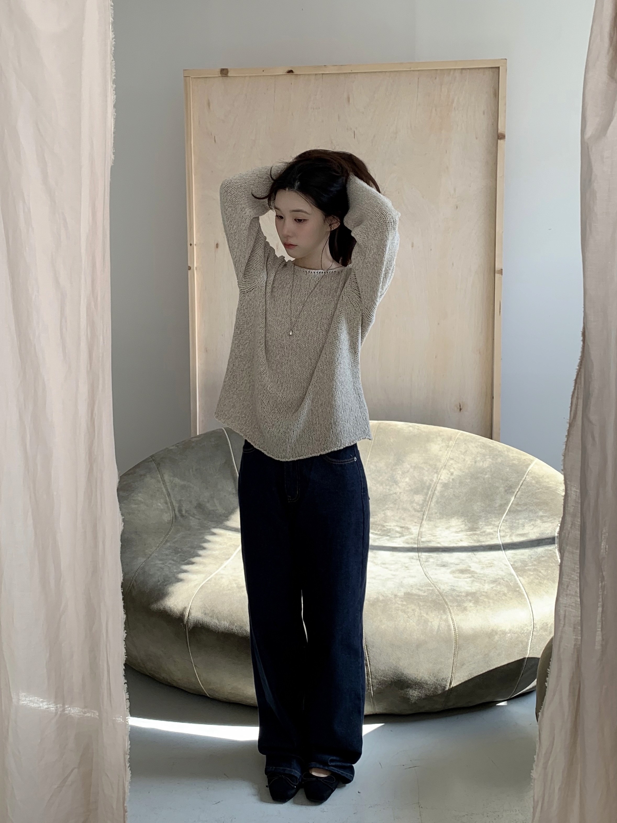 면, 린넨, 나일론 혼방 테이프 원사로 가볍고 쾌적한 루즈 핏 니트입니다. 납작 원사 편직으로 입체 텍스처가 살아 있고 보풀, 변형에 강합니다. 뒤 넥 자개 장식으로 포인트가 더해졌습니다.