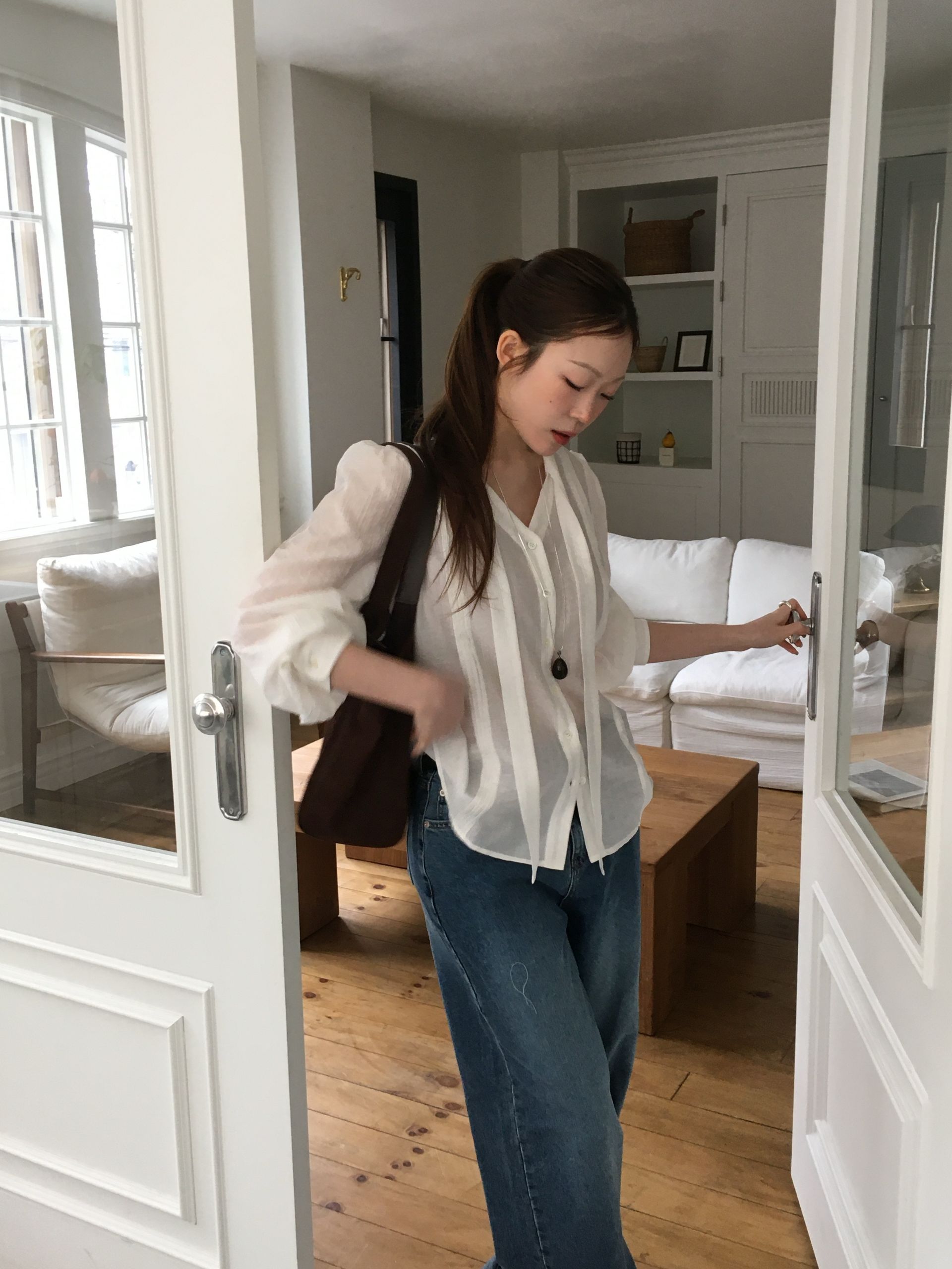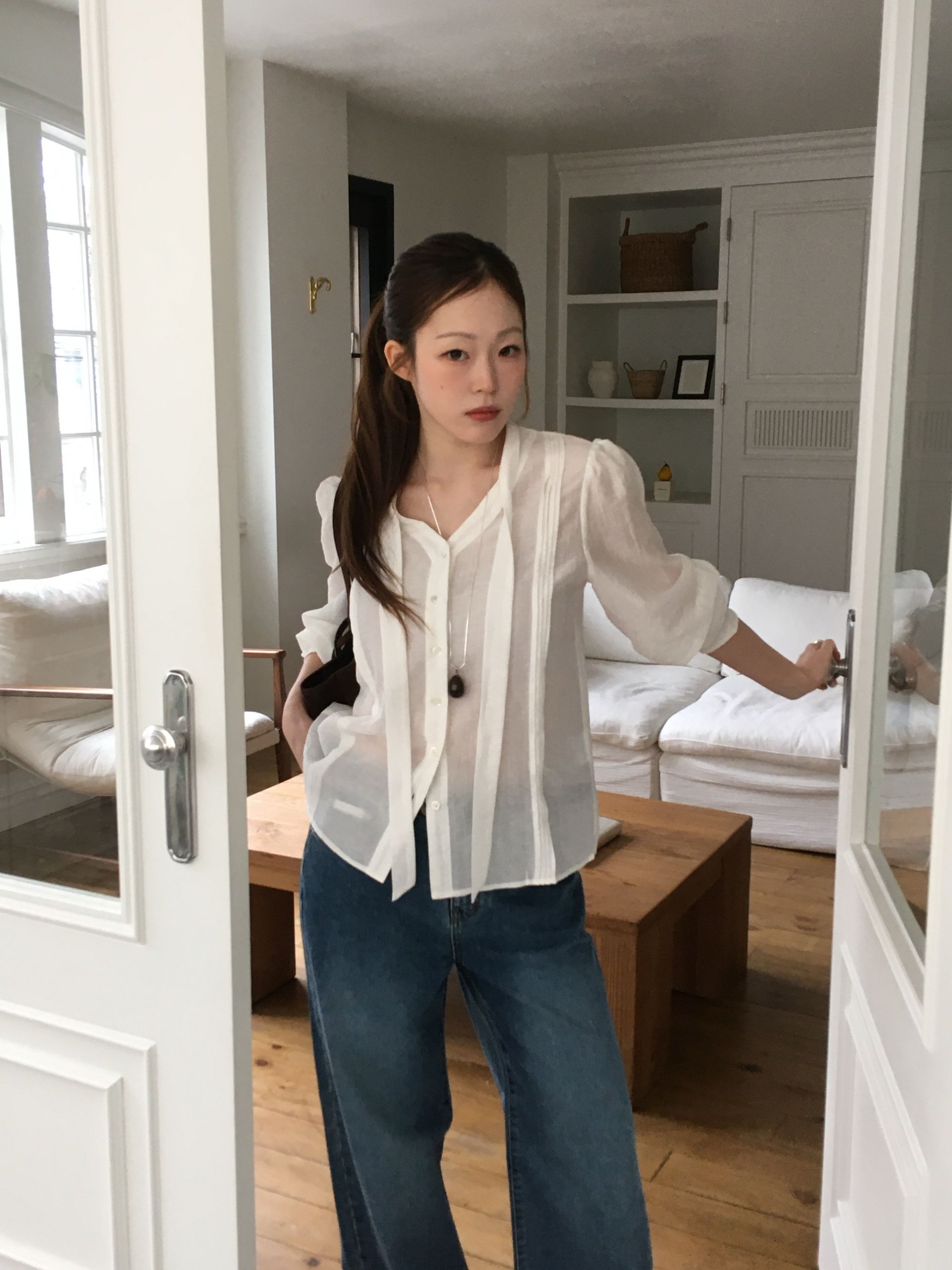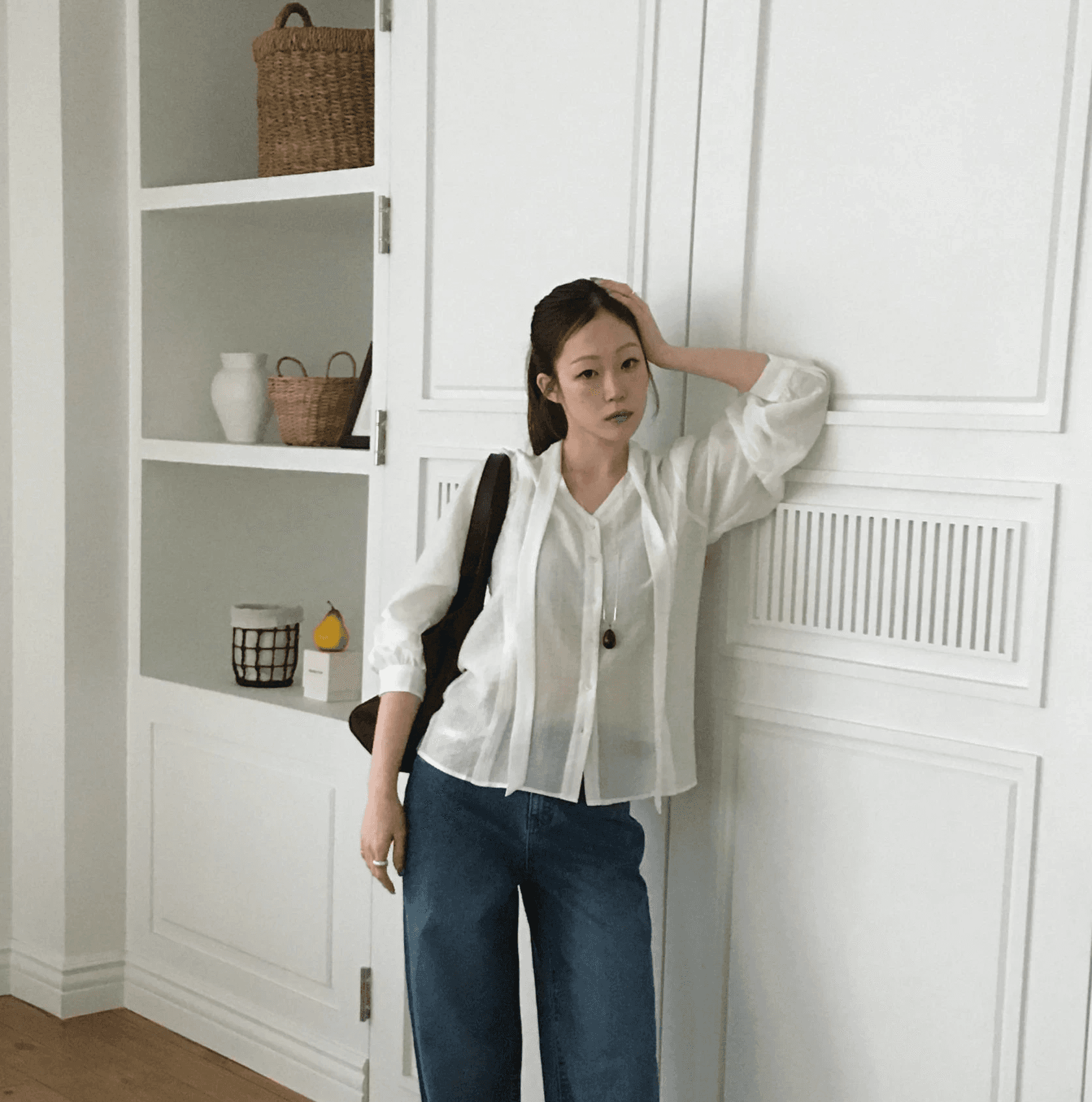 페미닌한 감성의 스카프 타이 디자인이 포인트인 블라우스입니다. 부드럽고 시어한 원단을 사용해 자연스럽게 흐르는 릴랙스한 실루엣을 연출하며, 은은한 비침으로 간절기부터 한여름까지 가볍게 스타일링할 수 있습니다.