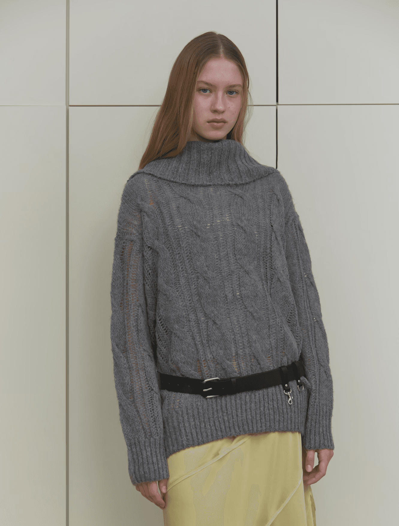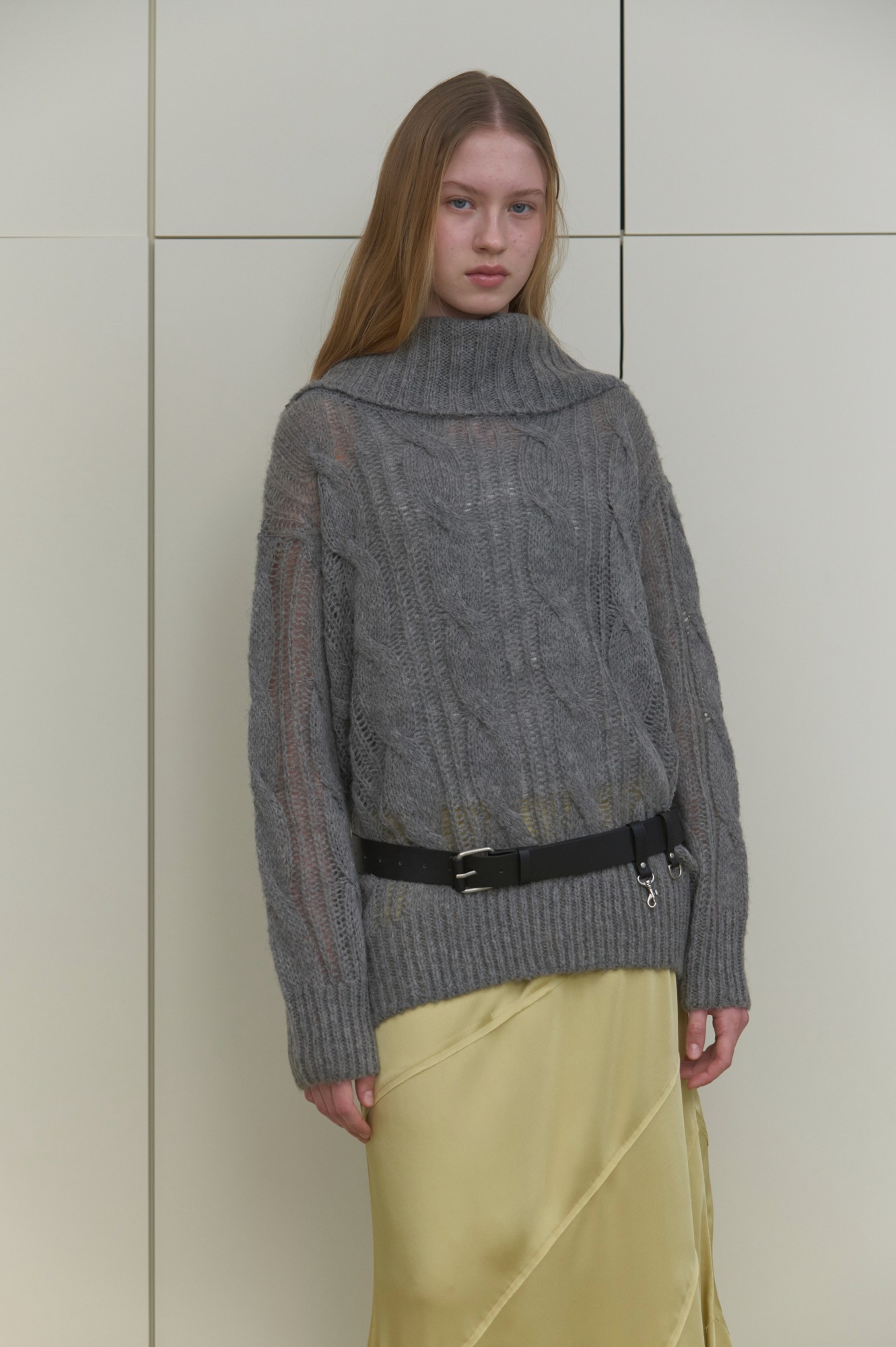 모헤어 혼방 원사로 짜인 부드러운 터치감의 케이블 오버 니트. 넥 라인은 여유 있는 폴드 디자인으로 연출에 따라 하이넥처럼 착용하거나 오프숄더로도 스타일링이 가능해 다양한 무드를 즐길 수 있습니다. 단독 착용은 물론 레이어드 스타일에도 활용도가 높은 아이템입니다.