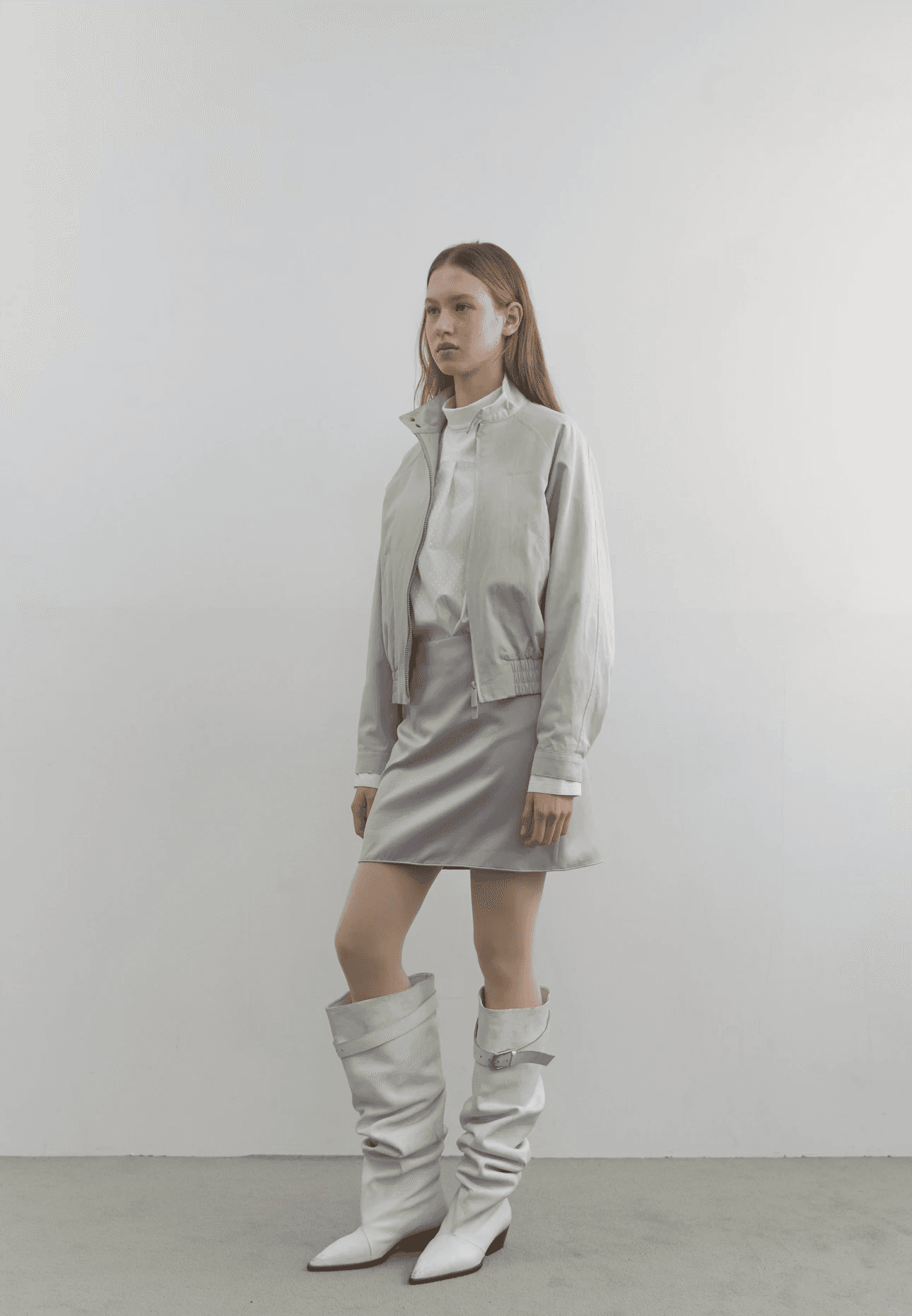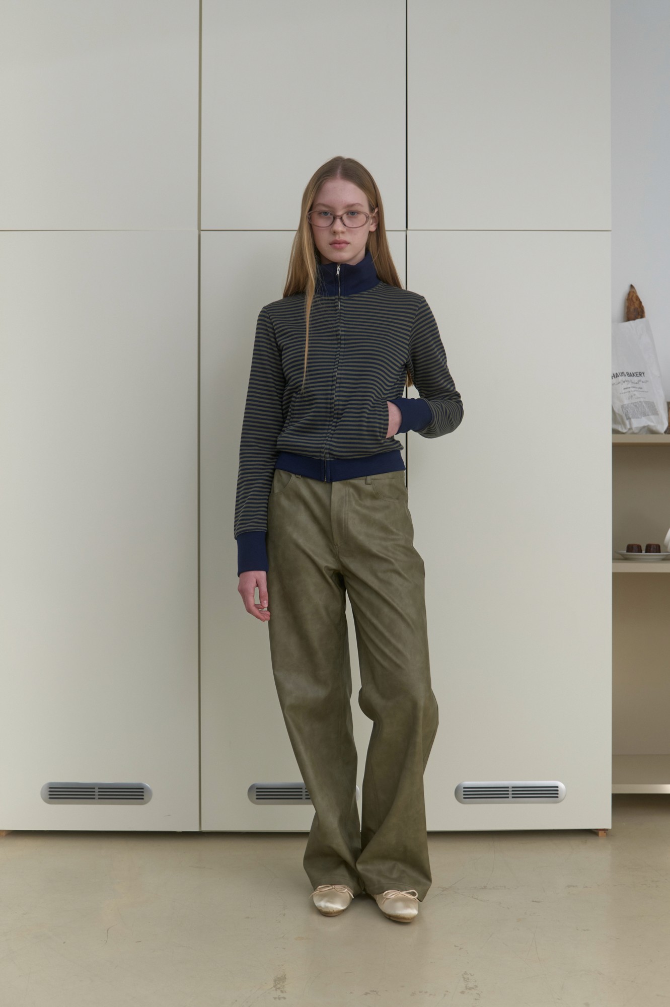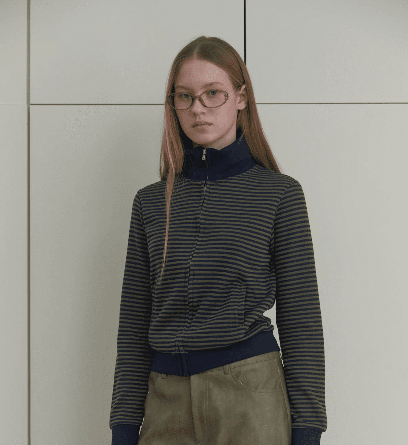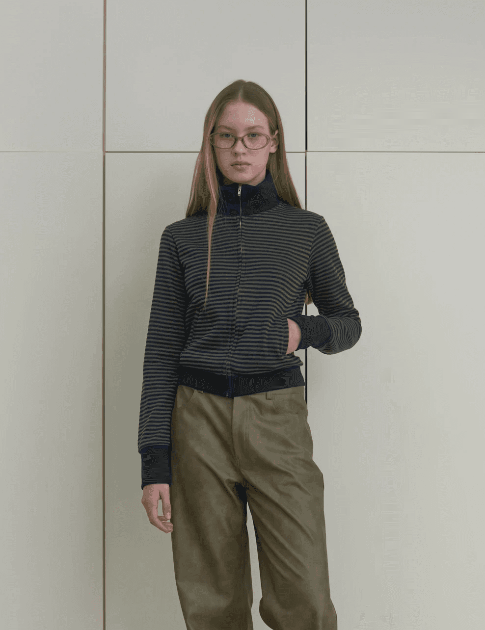 스트라이프 소재의 슬림 집업. 탄탄한 조직감으로 안정적인 슬림핏 실루엣을 연출합니다. 크롭 기장과 집업 디테일이 어우러져 다양한 스타일링이 가능한 아이템이에요.