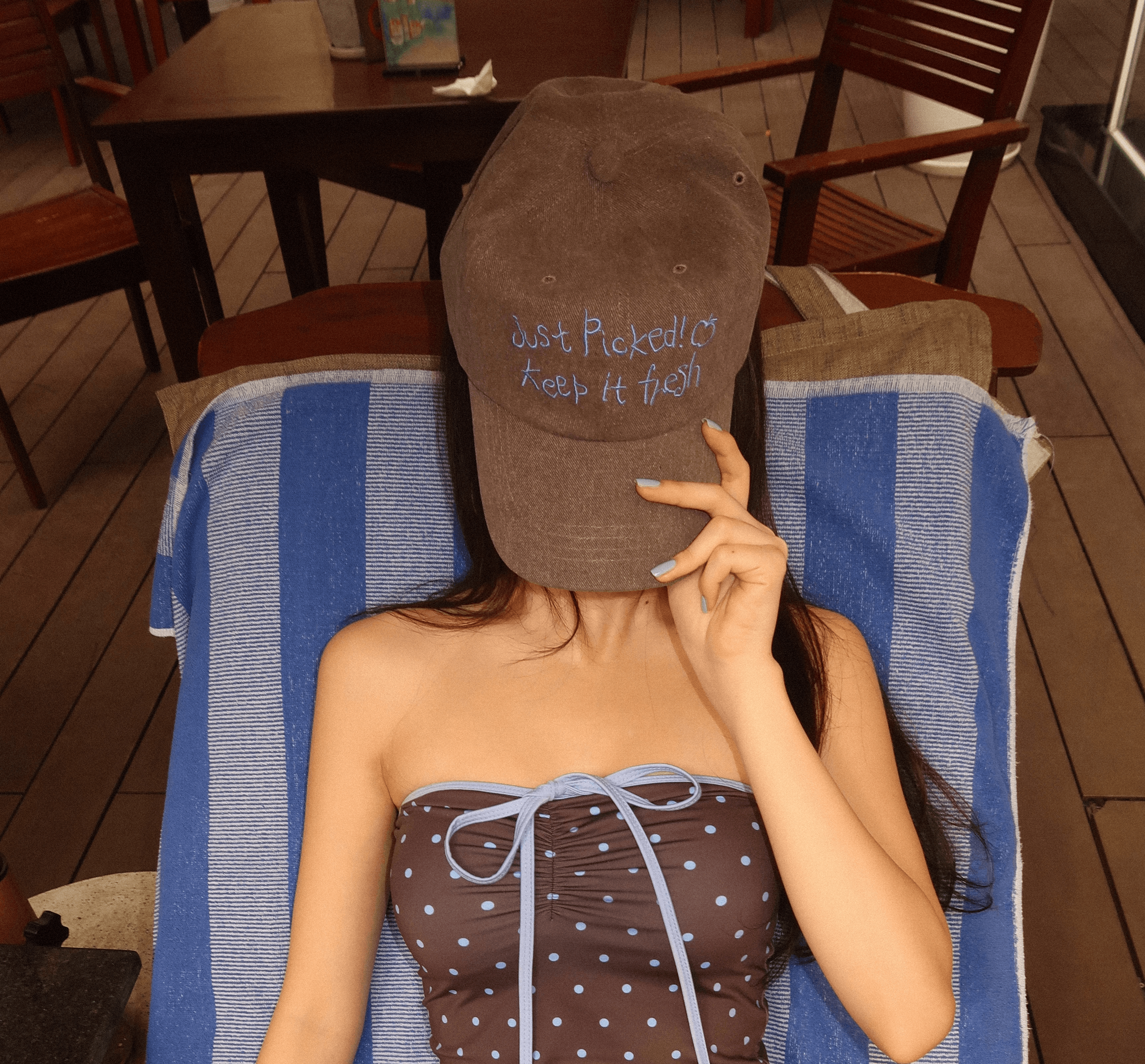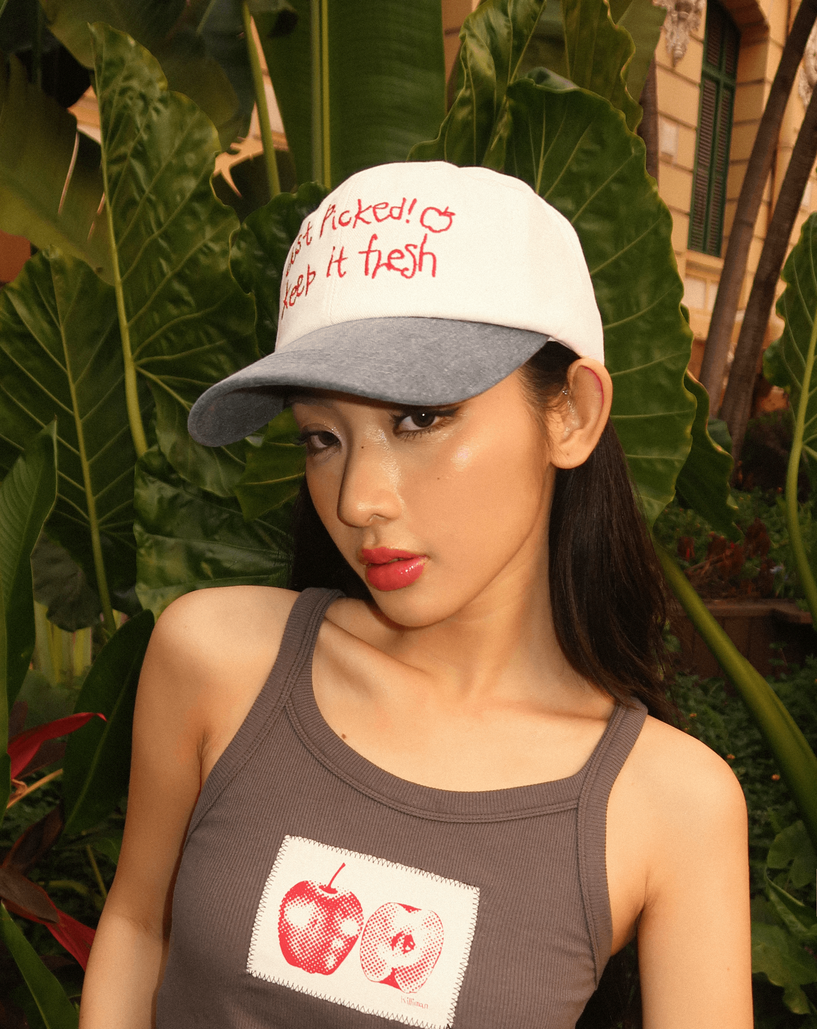 빈티지한 워싱과 핸드라이팅 그래픽이 어우러진 캡입니다. 뒷면 하트 자수가 더해져, 돌려 썼을 때도 자연스럽게 포인트가 됩니다.