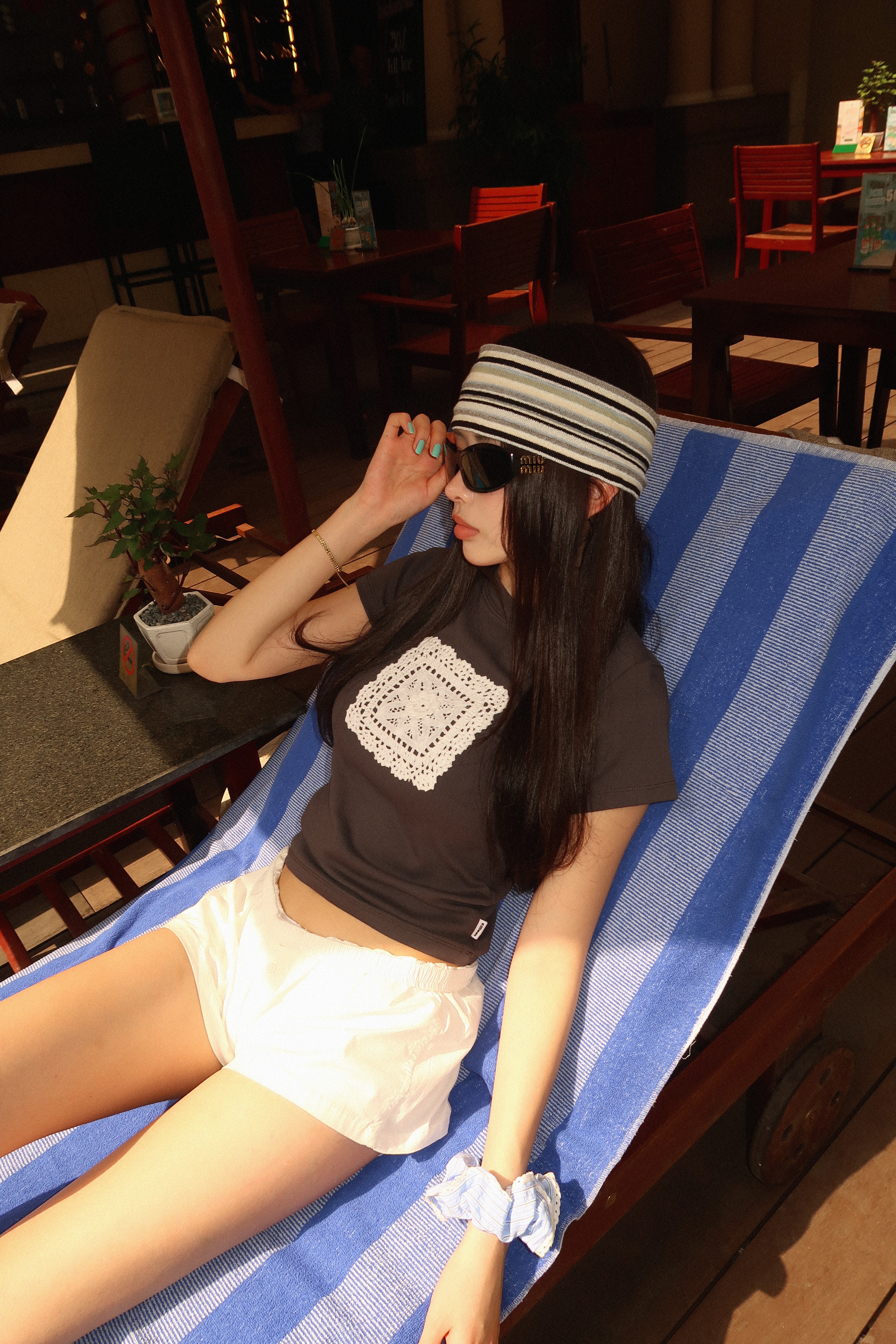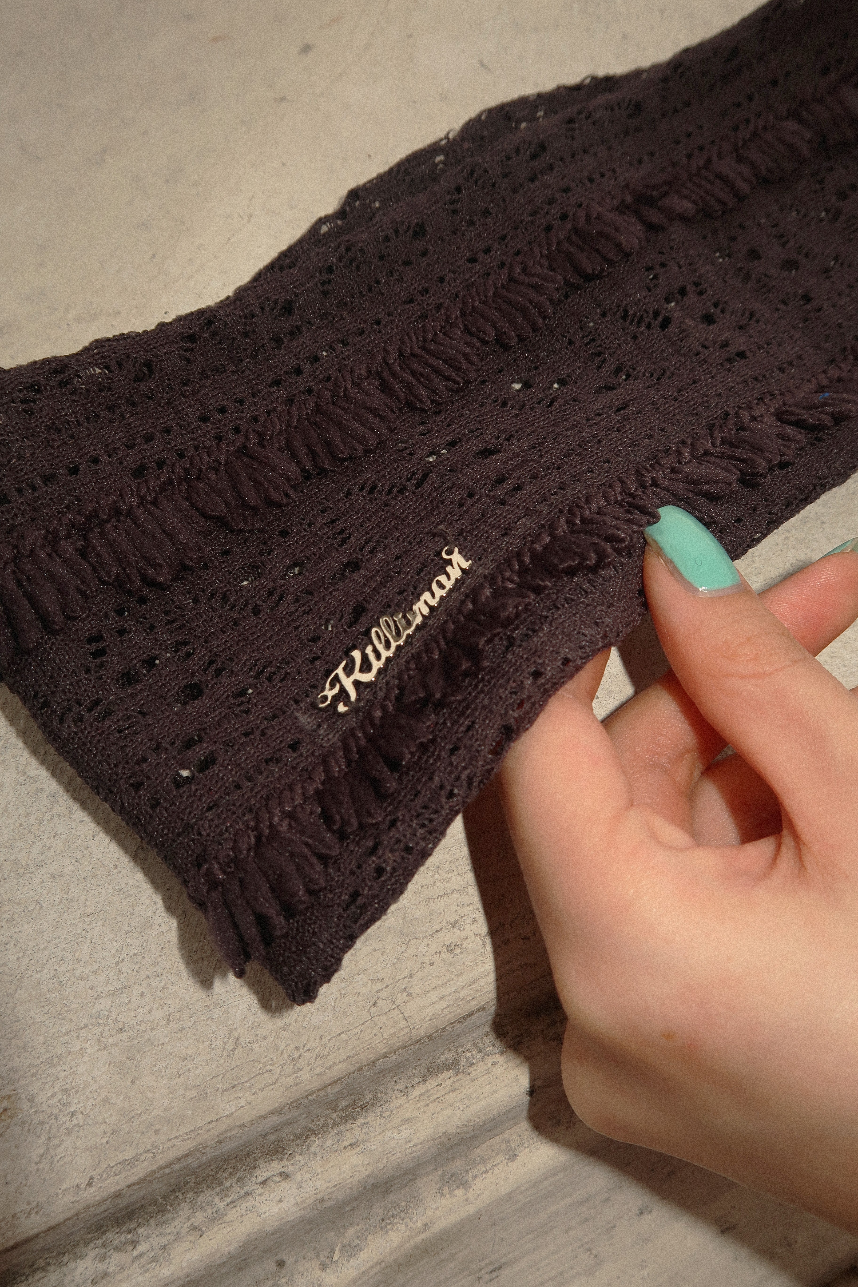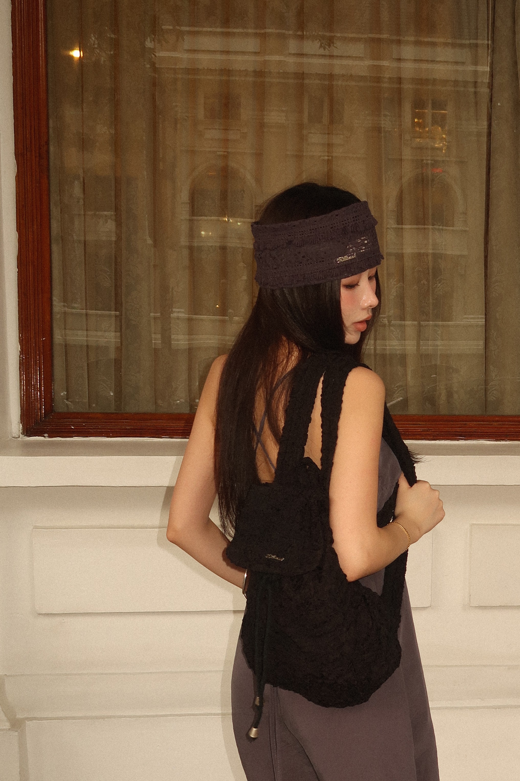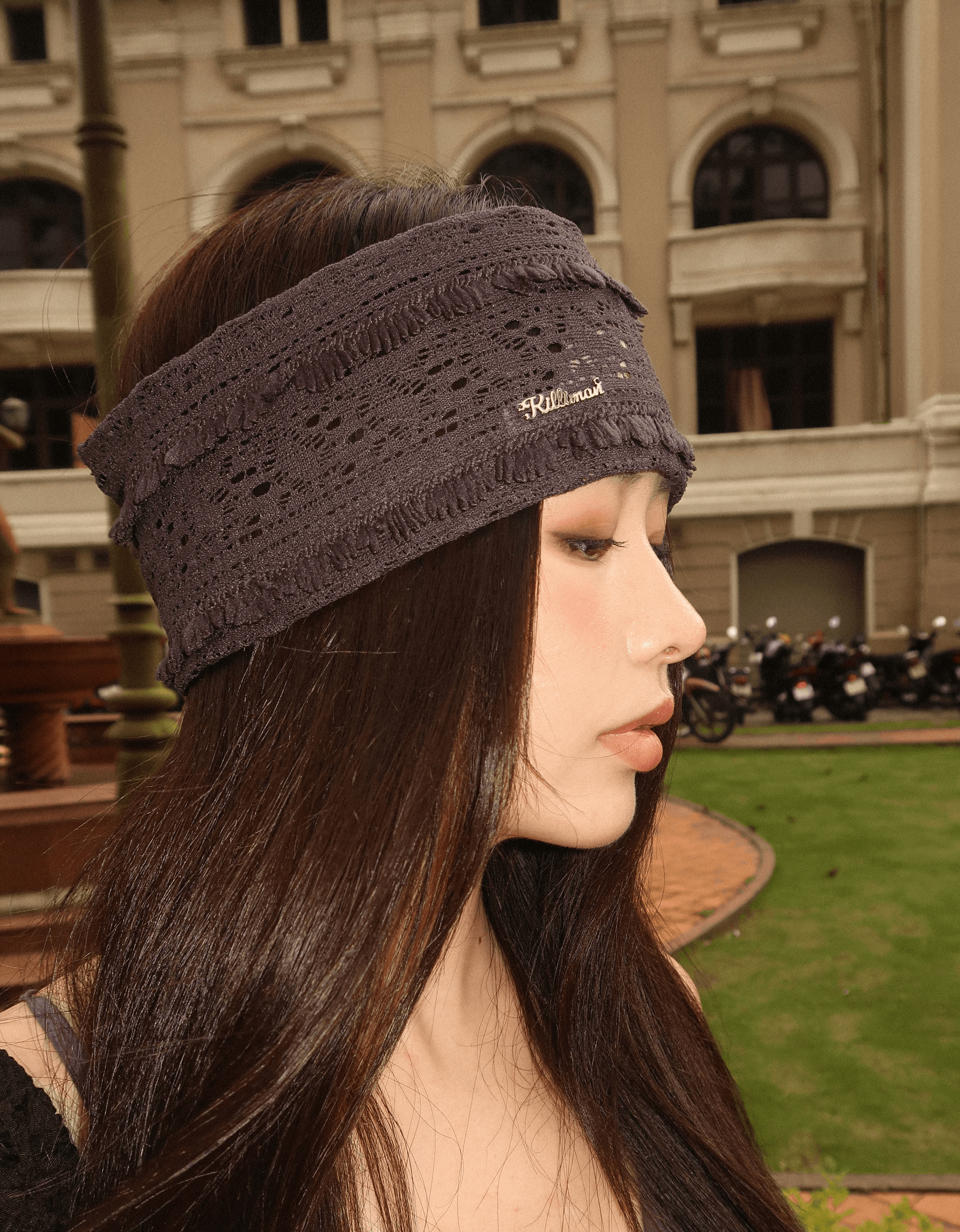 아일렛과 수술 디테일이 어우러진 헤어밴드입니다. 킬리만의 실버 로고가 더해져 은은한 포인트를 더하며, 다양한 스타일로 연출하기 좋습니다.