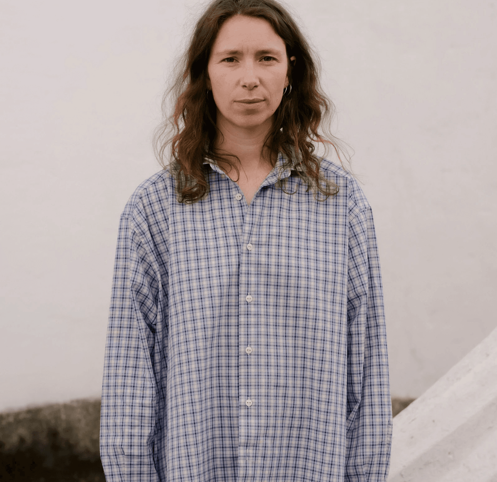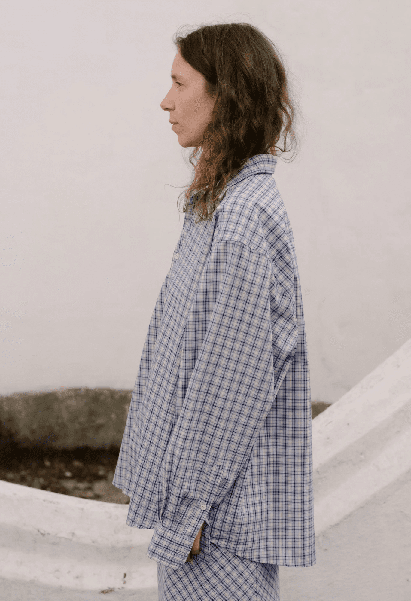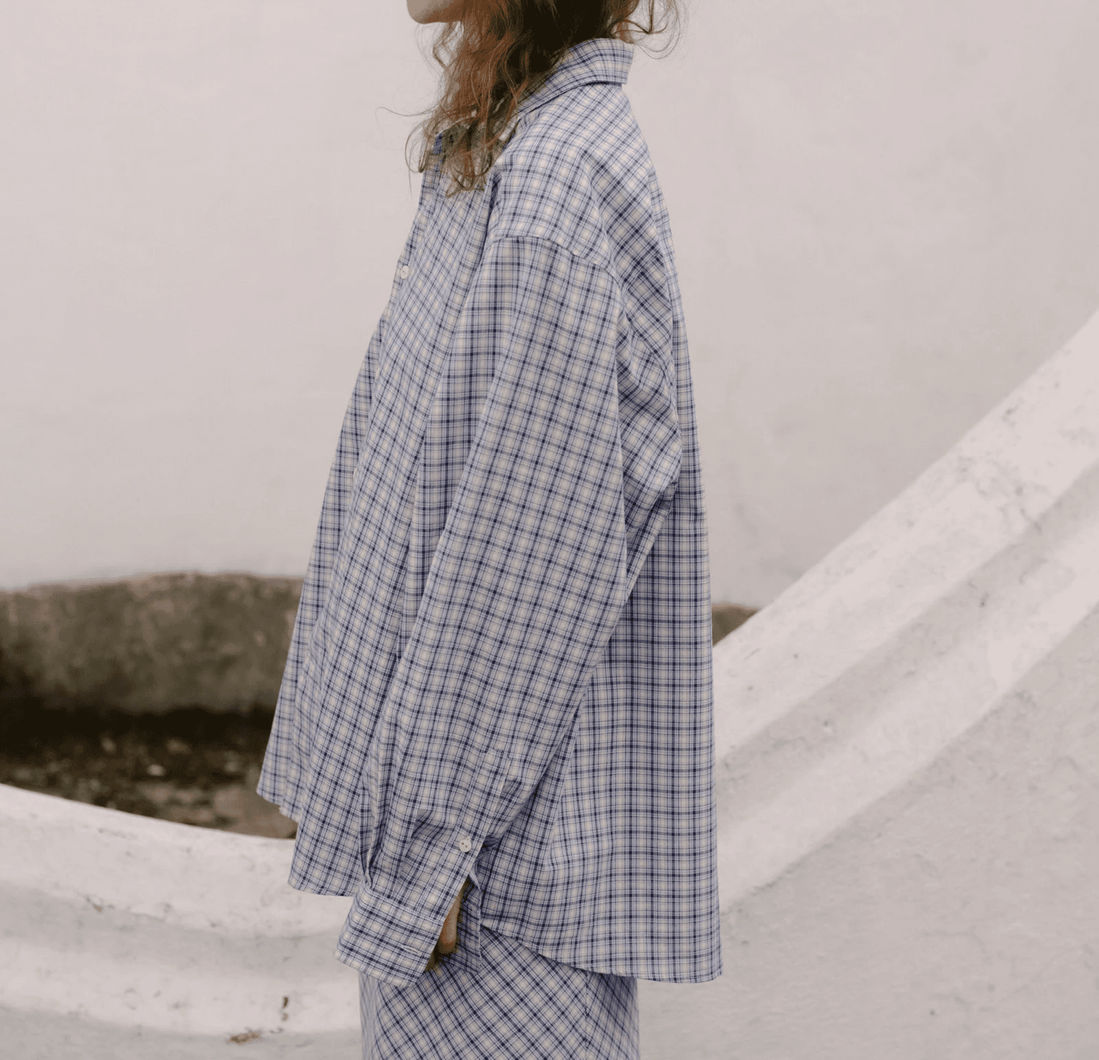 코튼 소재의 버튼업 셔츠. 차분한 블루,네이비,화이트가 섞인체크 패턴이 돋보입니다.