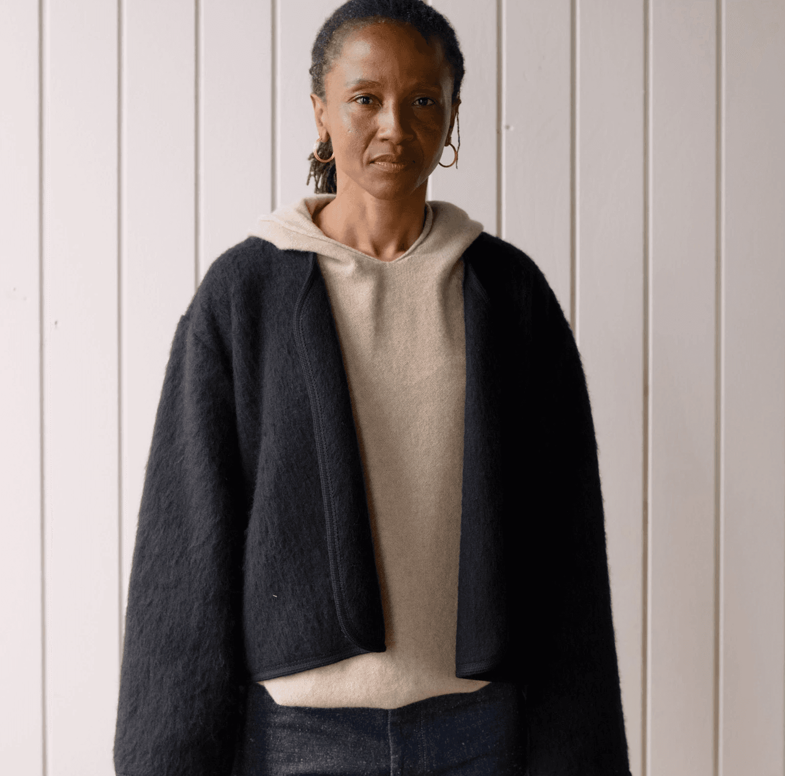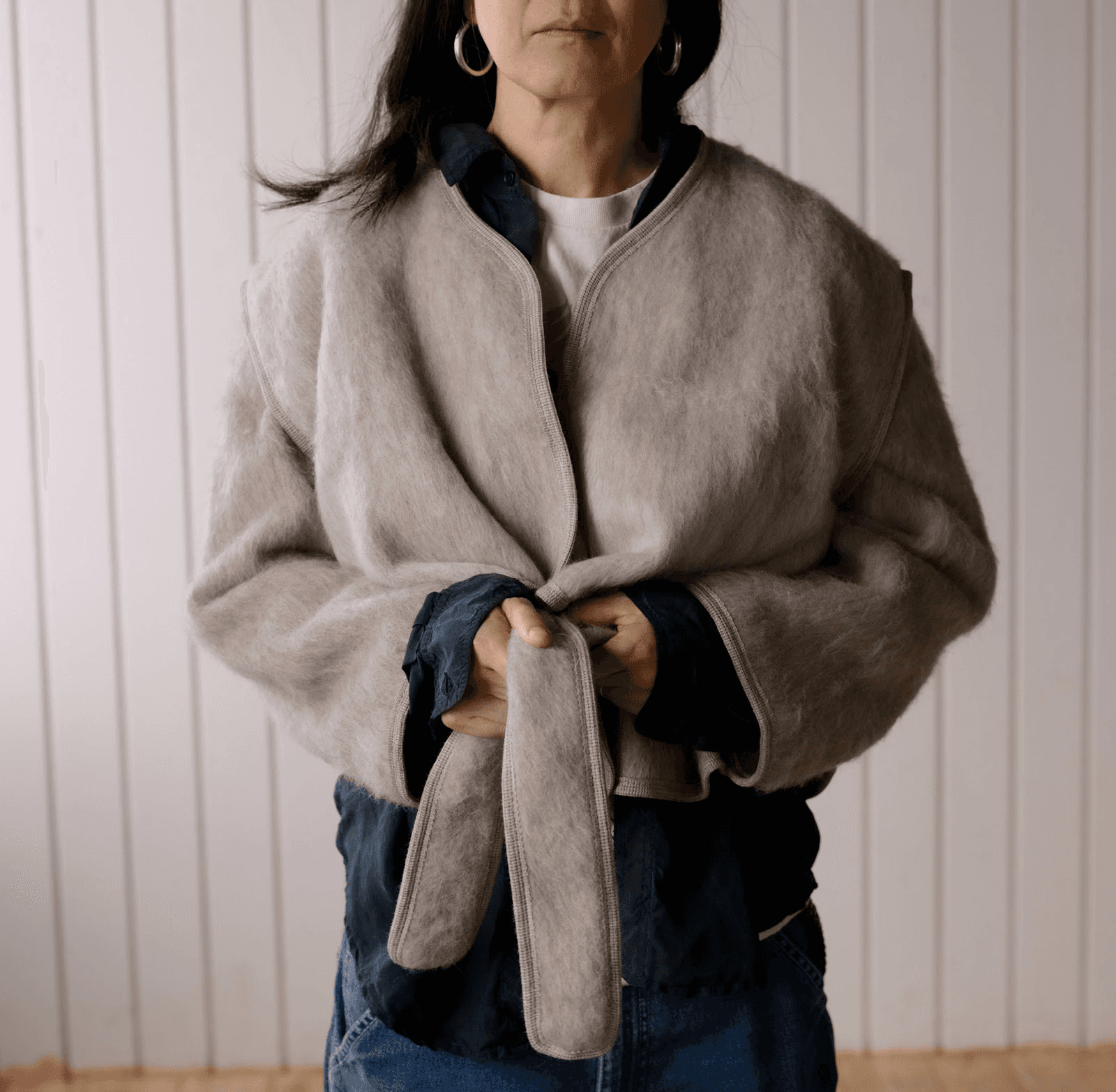 가벼운 무게, 높은 보온성을 가진 브러쉬드 울 소재의 아우터 웨어. 크롭된 기장감과 소재의 텍스처가 특징입니다.