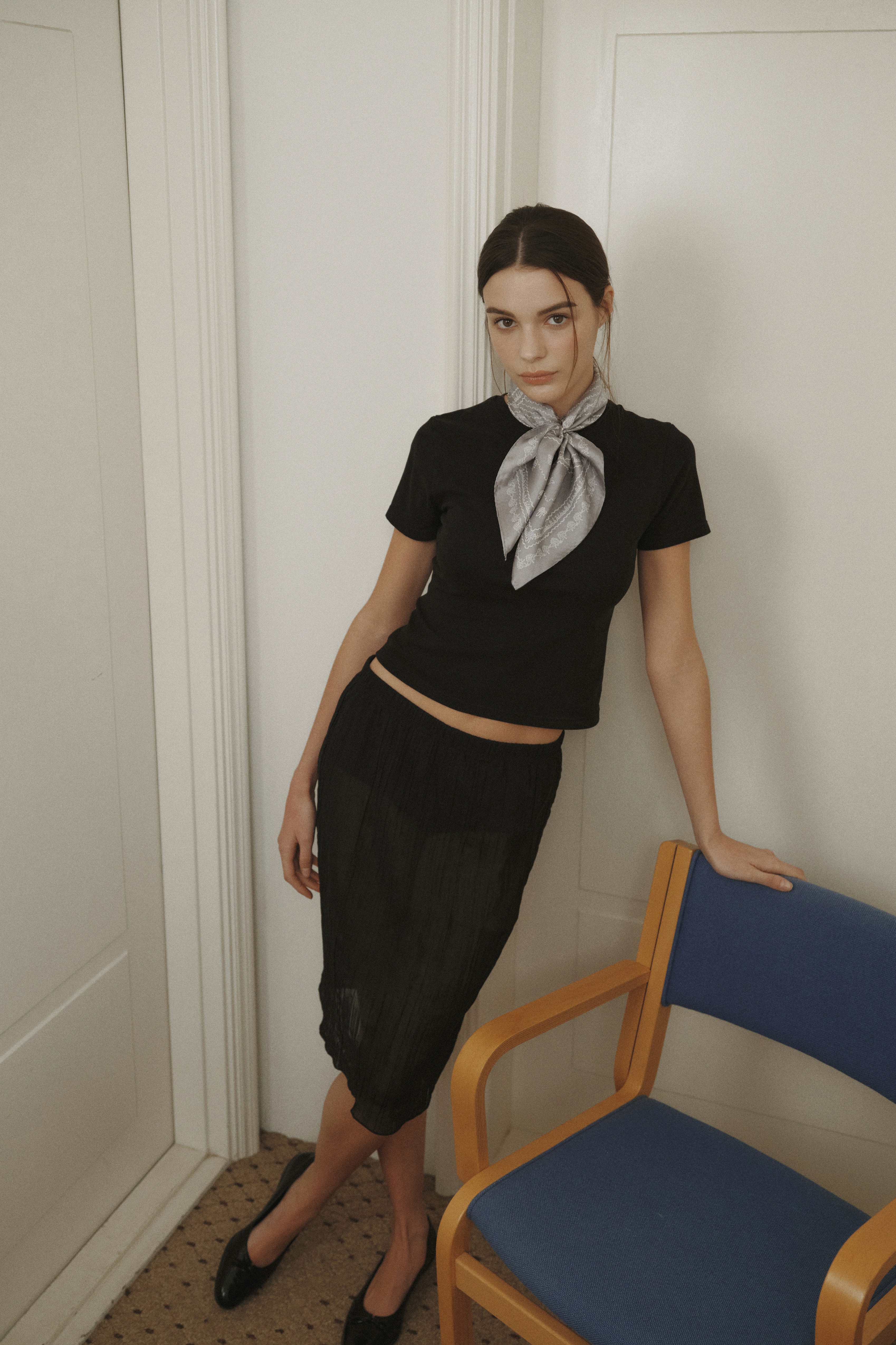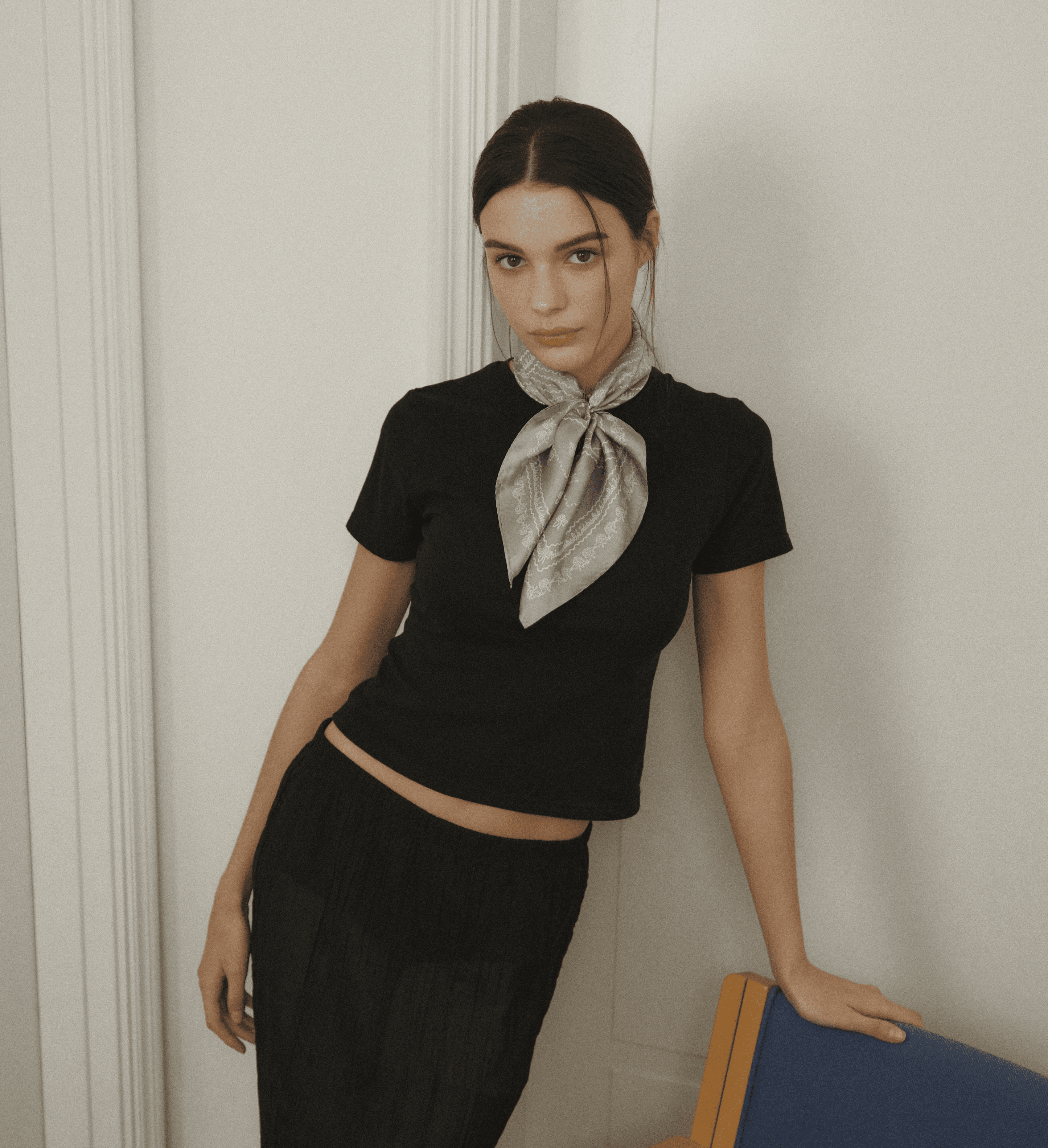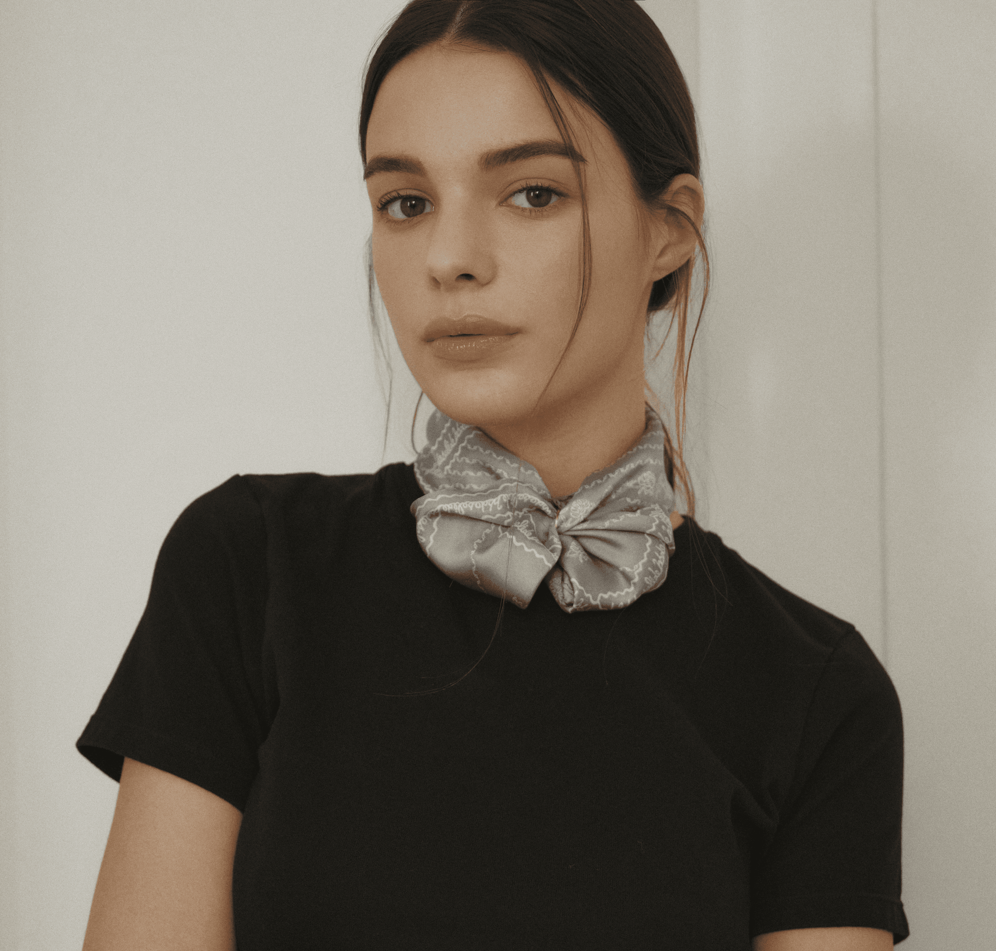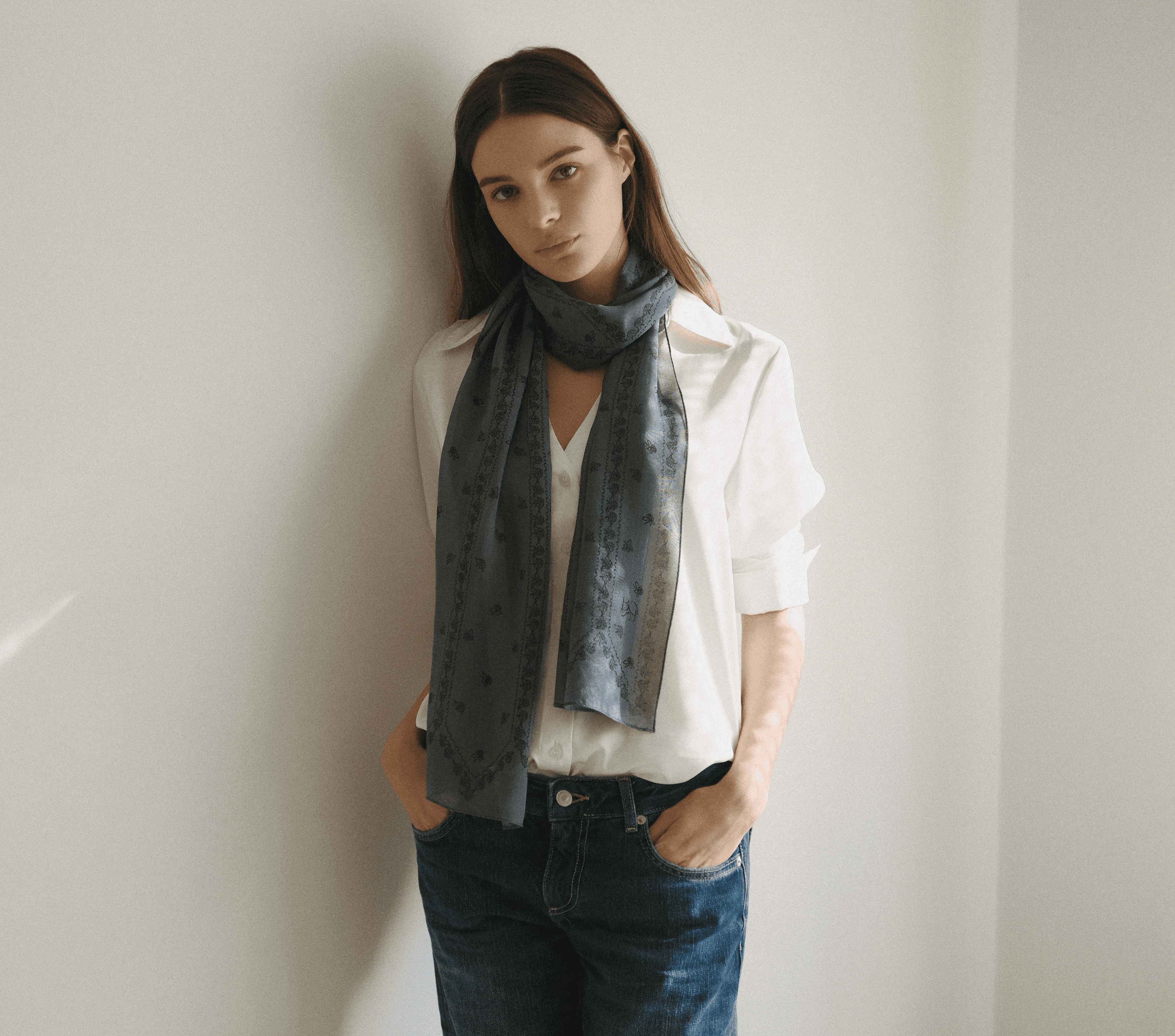 감각적인 패턴과 세련된 컬러감이 돋보이는 모브 실크 미니 스카프, 장인의 수작업 나염으로 완성된 100% 실크 소재가 깊이 있는 윤광을 띠며 룩에 한층 더 고급스러운 포인트를 선사합니다.