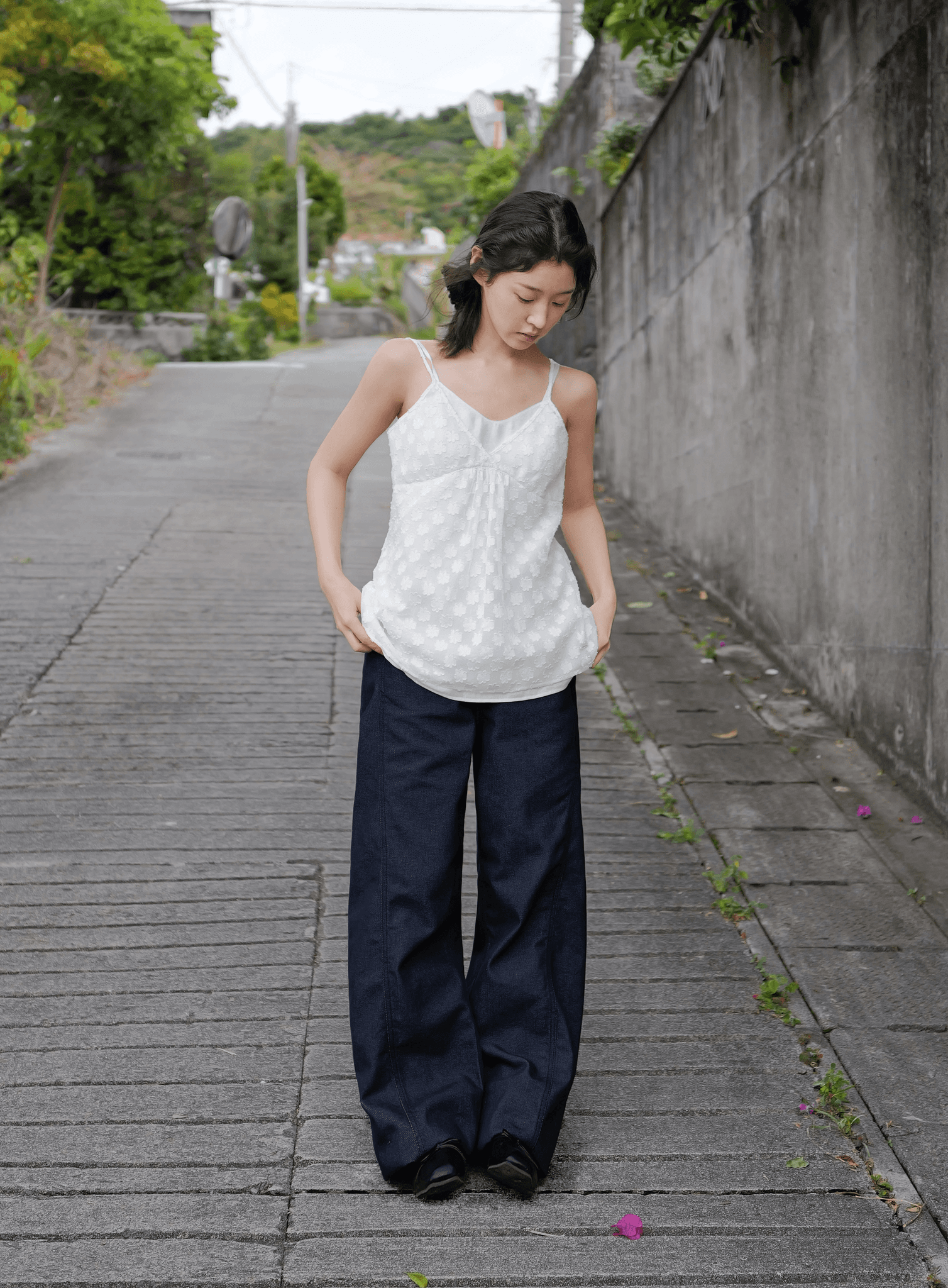 플라워 패턴의 시수루 원단이 레이어드 된 슬리브리스입니다.