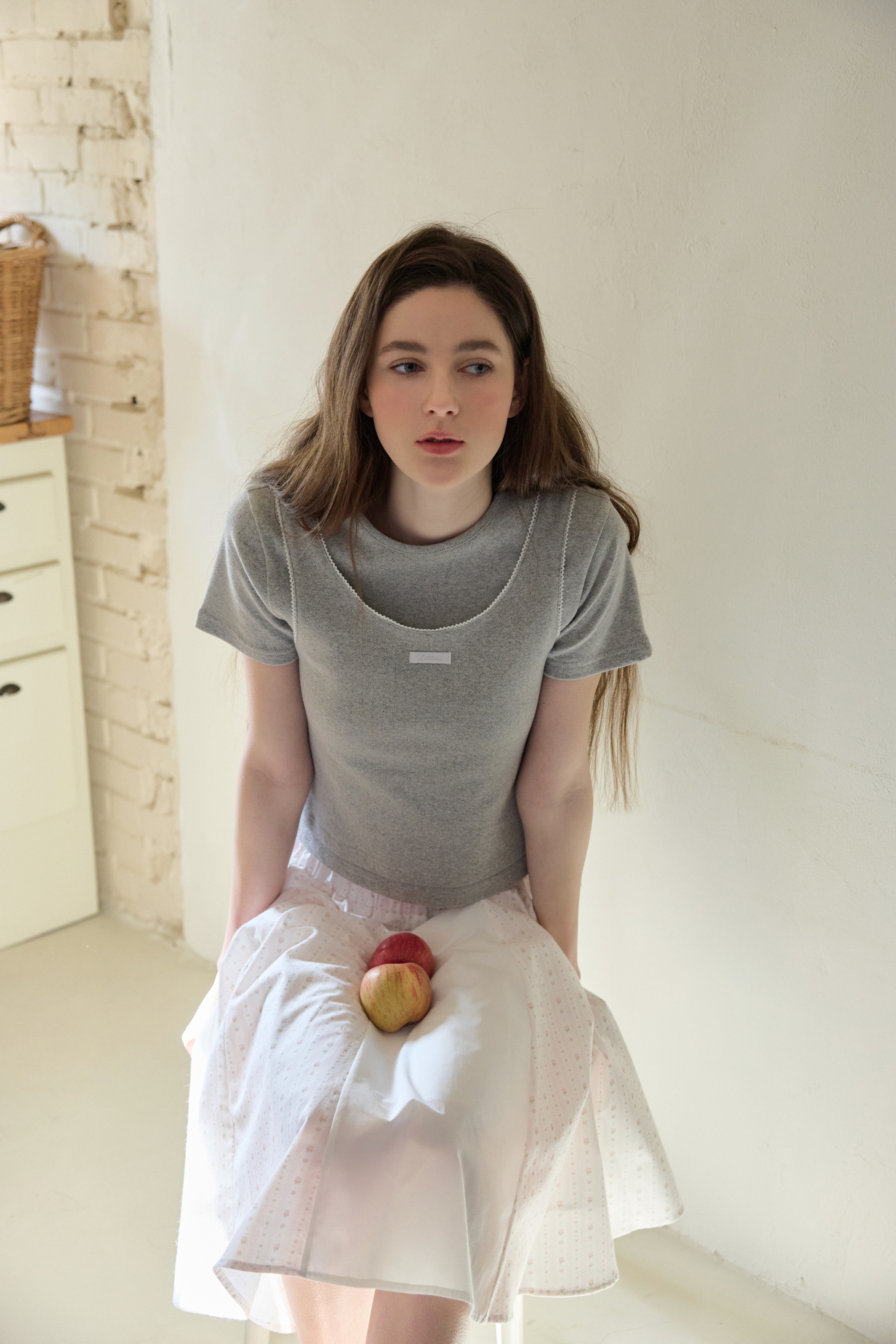 단정한 브이넥 라인을 베이스로 데이지크 콜라보 그래픽 DTP를 더해 감각적인 포인트를 살렸으며, 넥 라인을 따라 스칼럽 디테일을 추가해 여성스럽고 로맨틱한 무드를 완성했습니다.