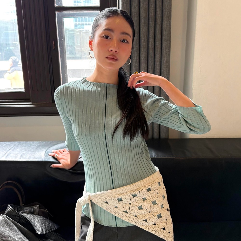 뒷면 배색 라인이 포인트인 7부 소매의 니트입니다. 볼드한 립 조직으로 바디 라인에 맞춰 자연스러운 실루엣이 연출되며, 배색 라인을 원하는 방향에 맞추어 앞, 뒤 모두 착용이 가능한 아이템입니다.