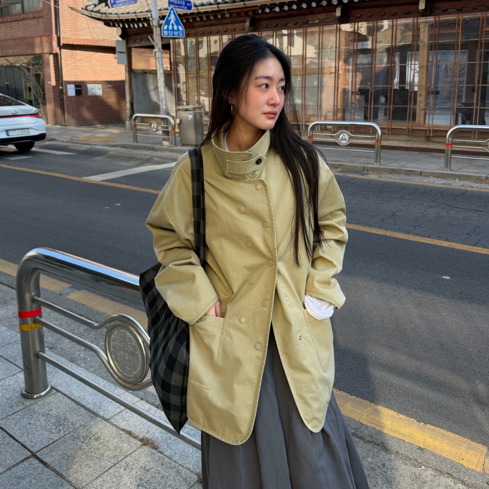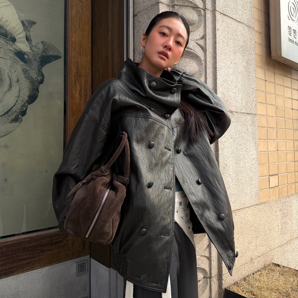 더블 단추가 특징인 레더 점퍼입니다. 은은한 광이 매력적인 에코 레더를 사용하였으며 넥이 감싸지는 라인과 여유로운 실루엣으로 편안하면서도 멋스러운 연출이 가능합니다.