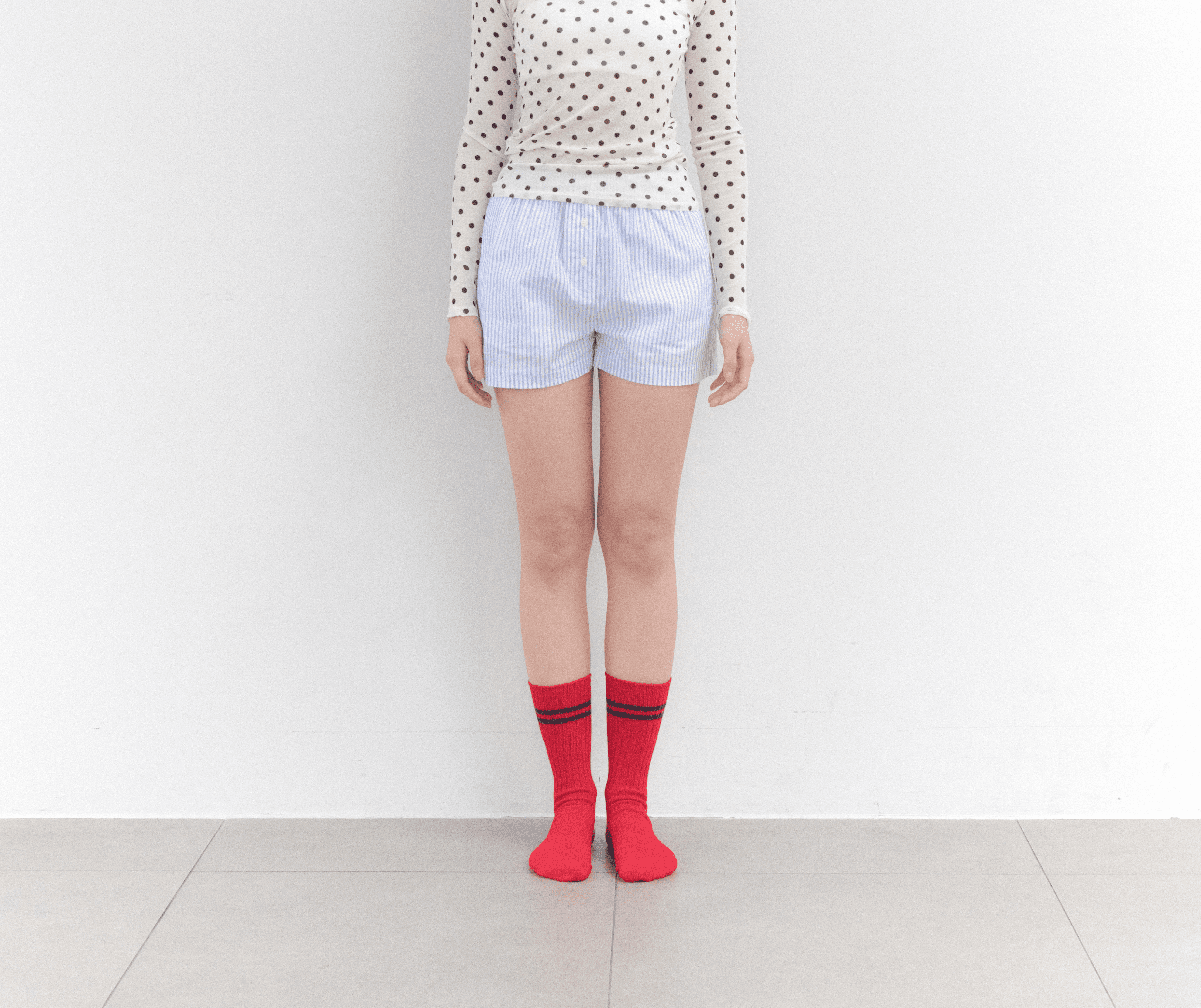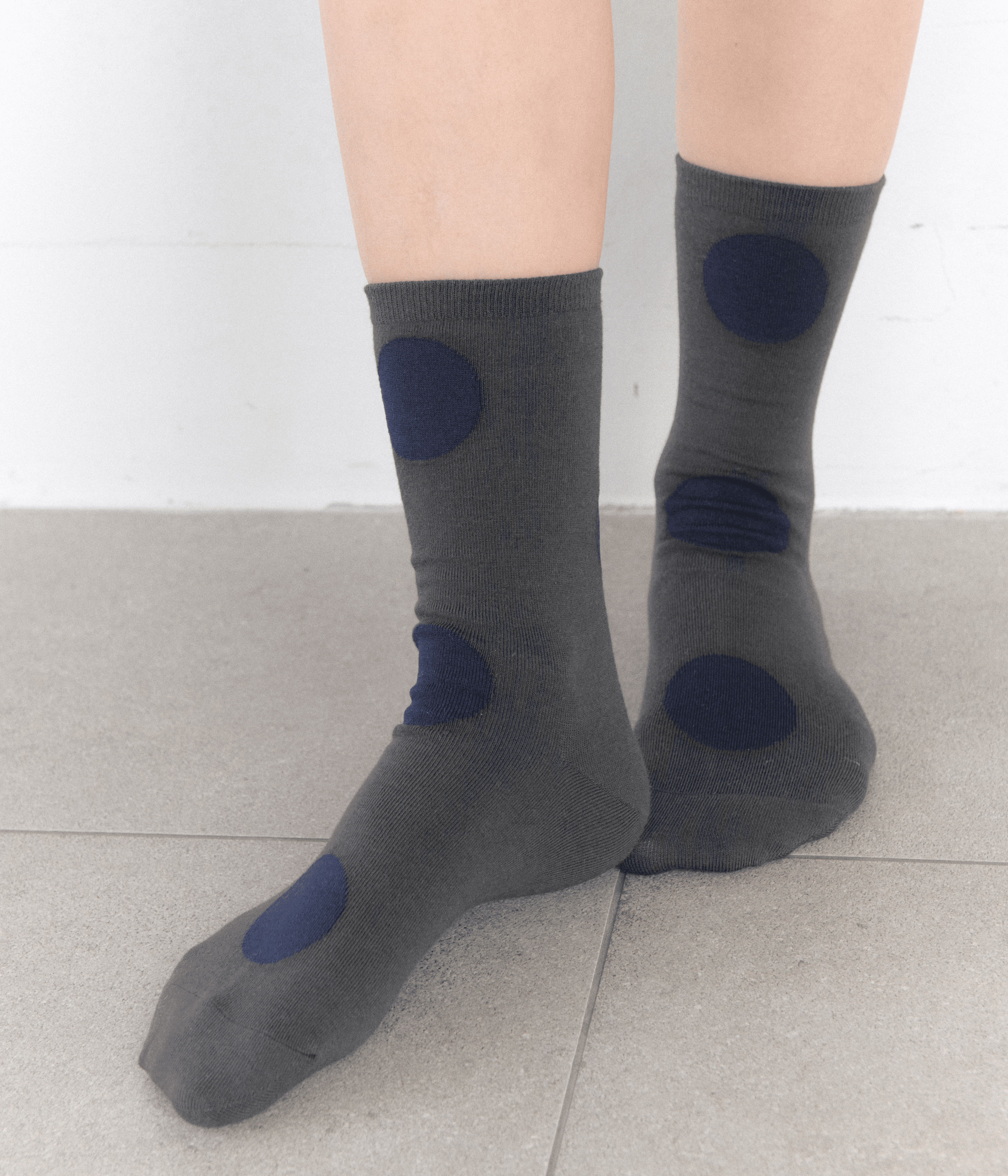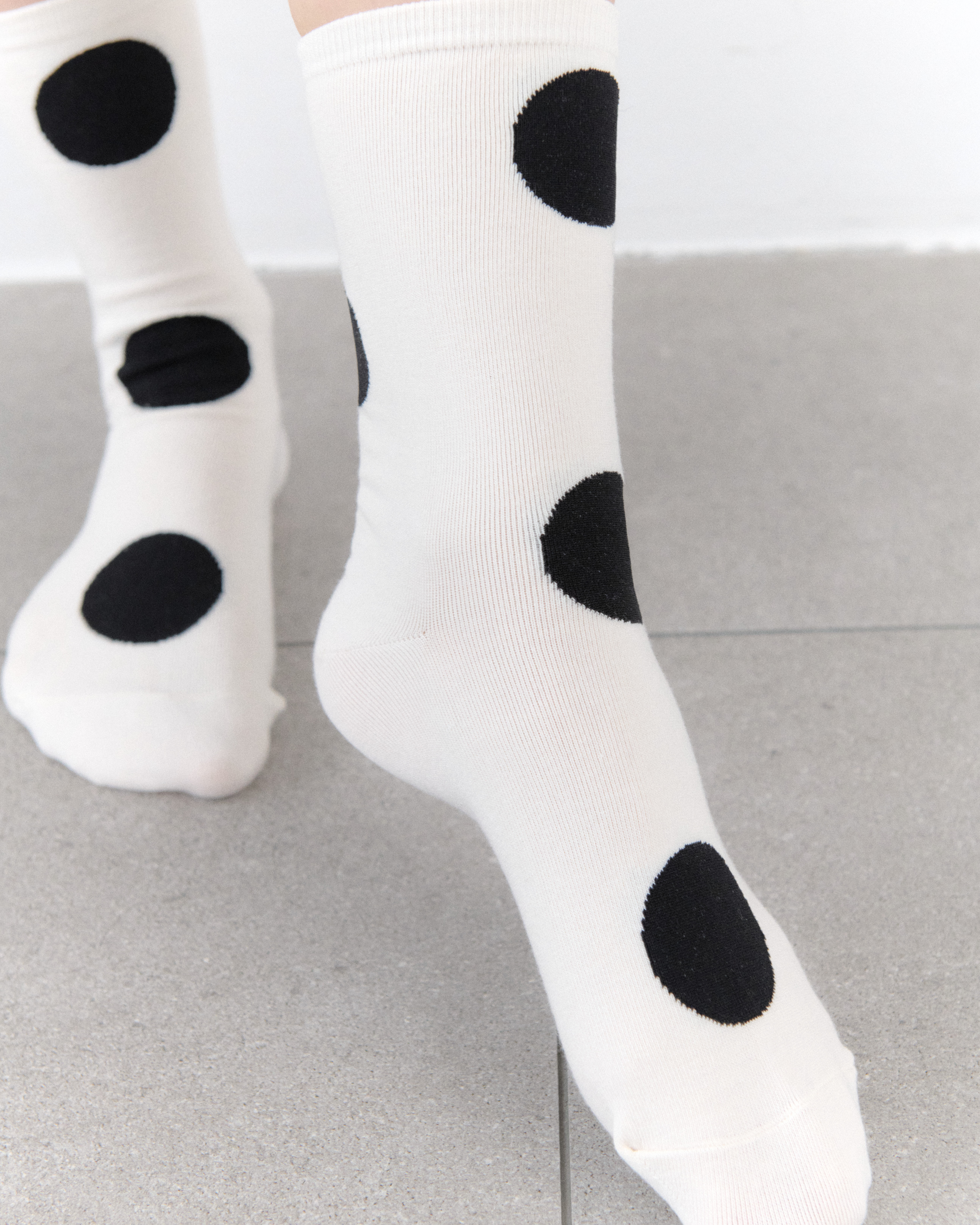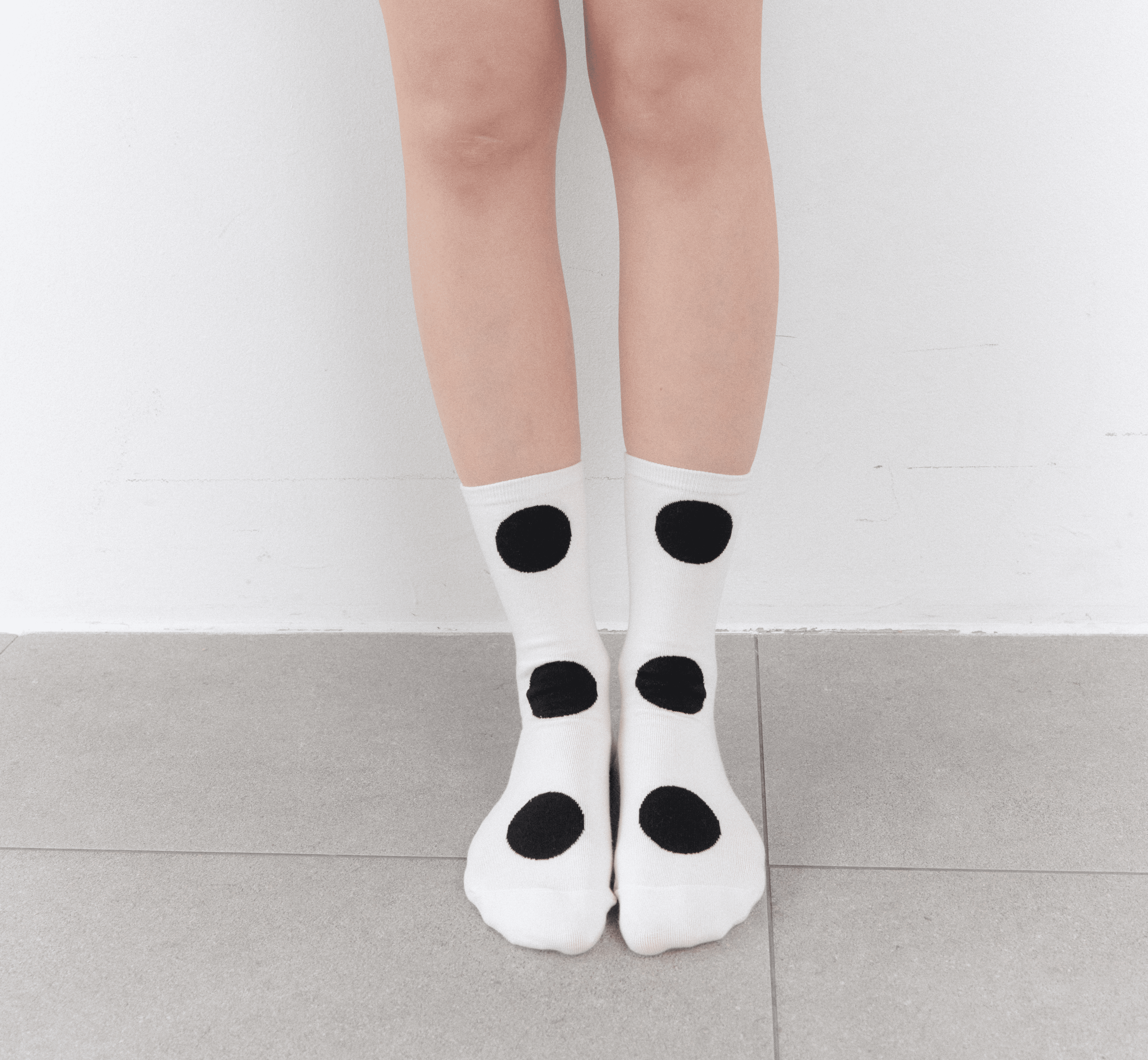 베이직한 컬러 위에 큰 블랙 도트 패턴을 더해 가볍고 발랄한 무드를 완성한 양말입니다