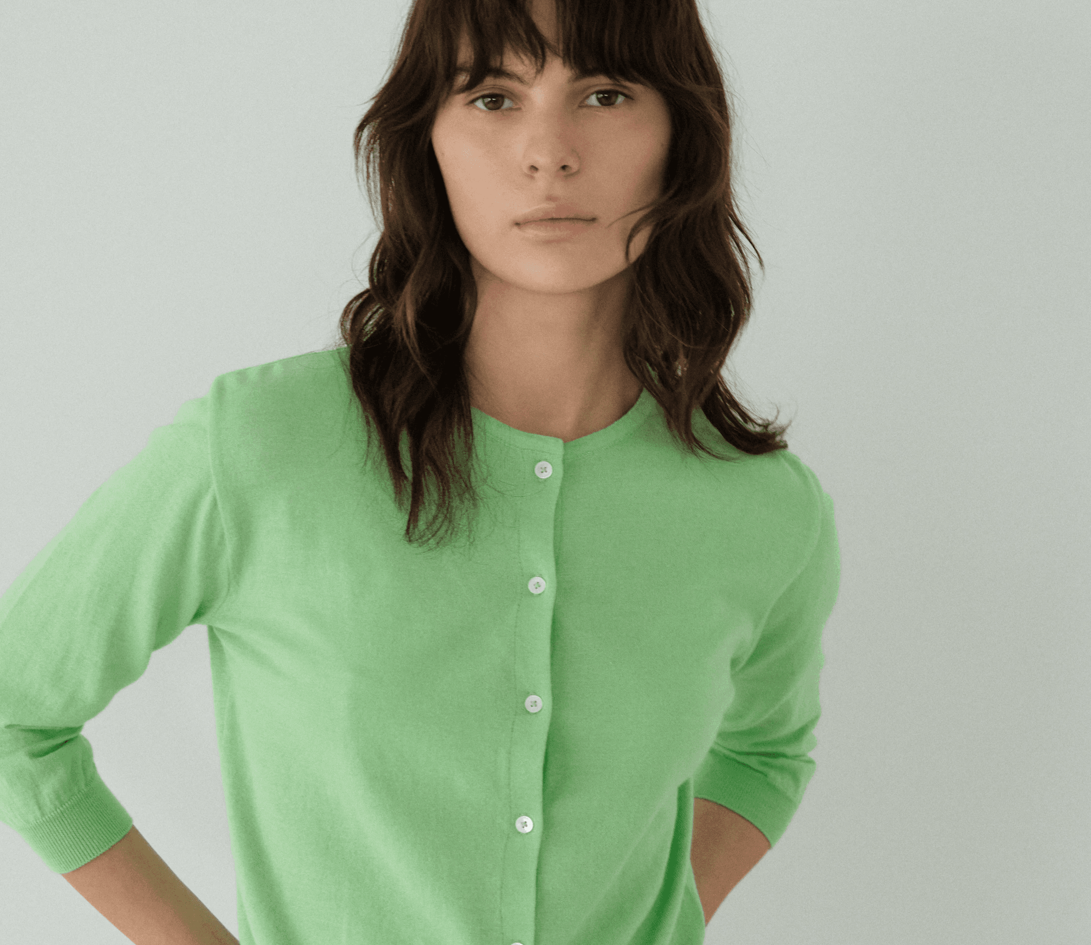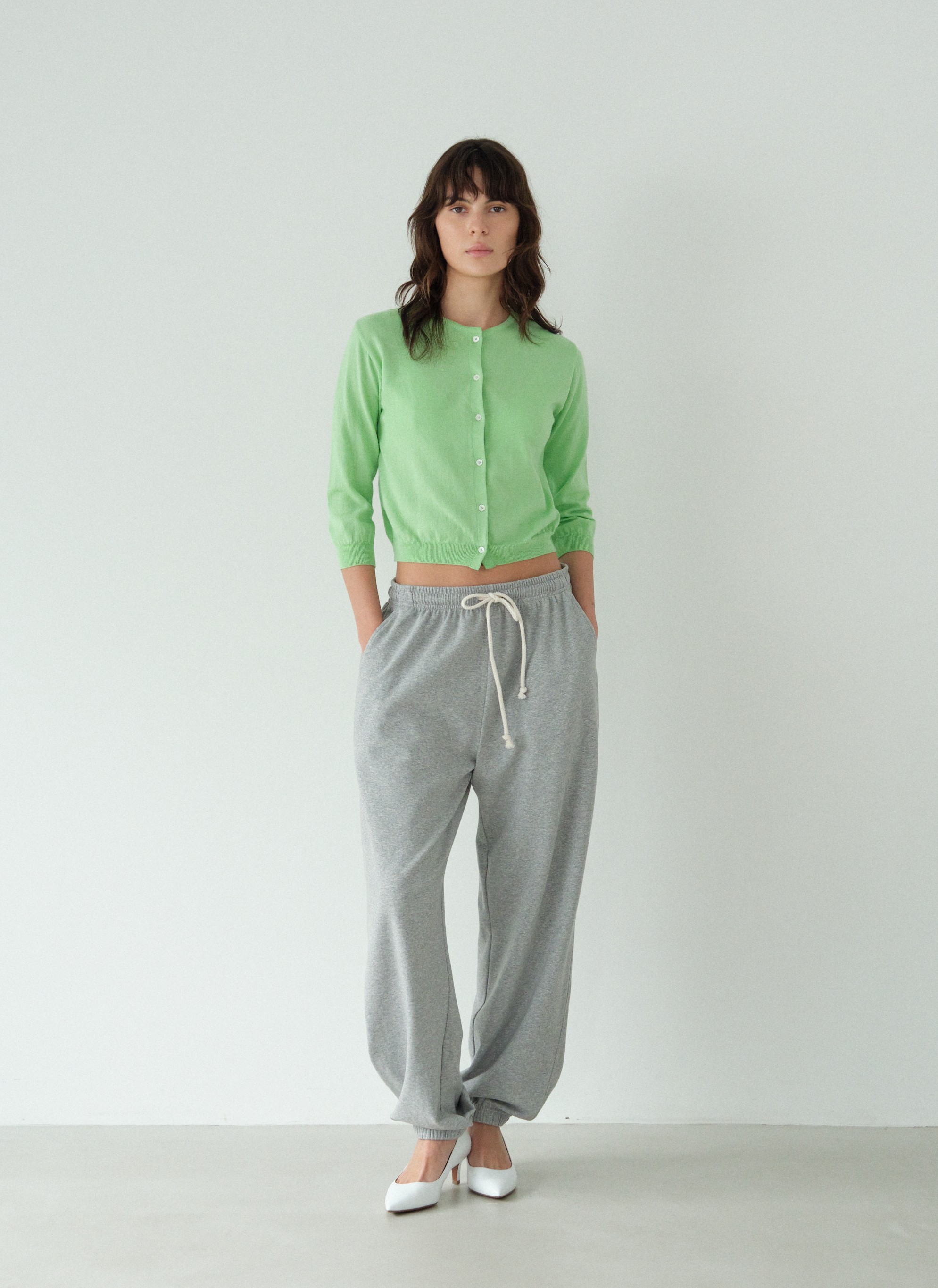 미니멀한 디자인의 크롭 기장 가디건으로, 계절에 관계없이 다양하게 레이어링할 수 있어 활용도가 높은 니트 아이템입니다.