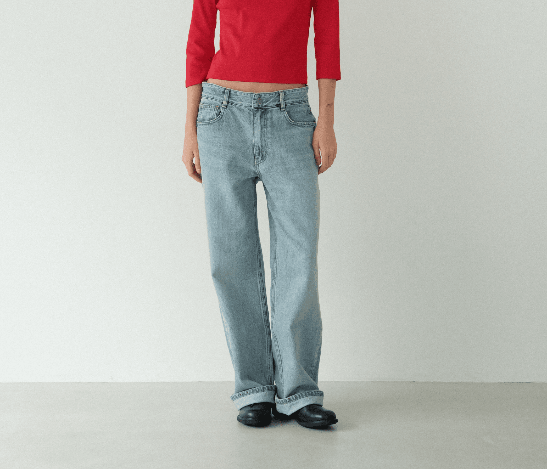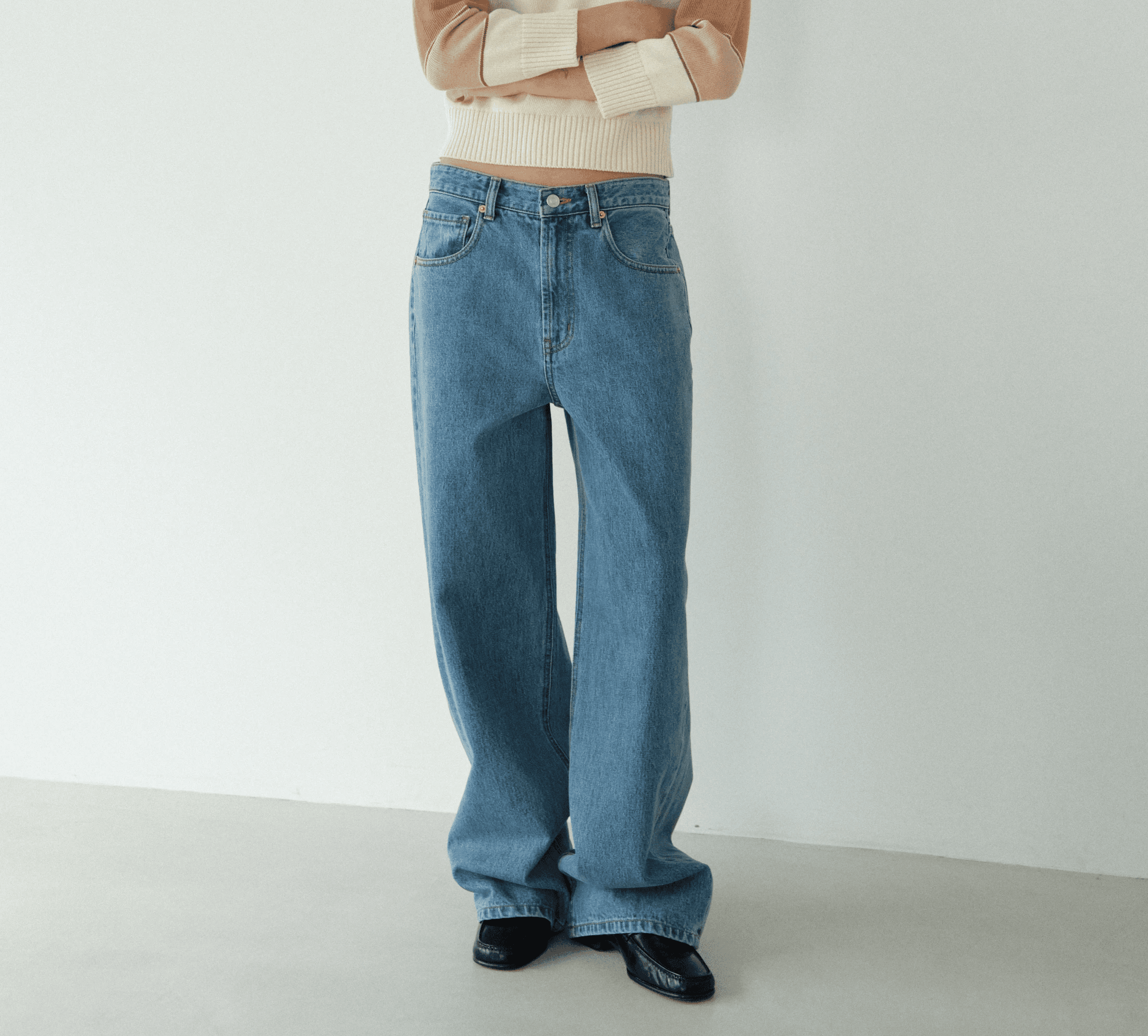 패션 아이콘 벨라 하디드가 즐겨 입는 루즈 핏 스트레이트 데님에서 모티브를 얻어 디자인한 제품입니다. 허리와 힙 라인이 편안하고 골반부터 아래로 자연스럽게 떨어지는 실루엣으로 부담 없이 착용할 수 있으며 앞면 리벳 장식을 생략해 미니멀한 분위기를 강조하고 스냅 버튼 디테일로 편안한 착용감을 더했습니다.