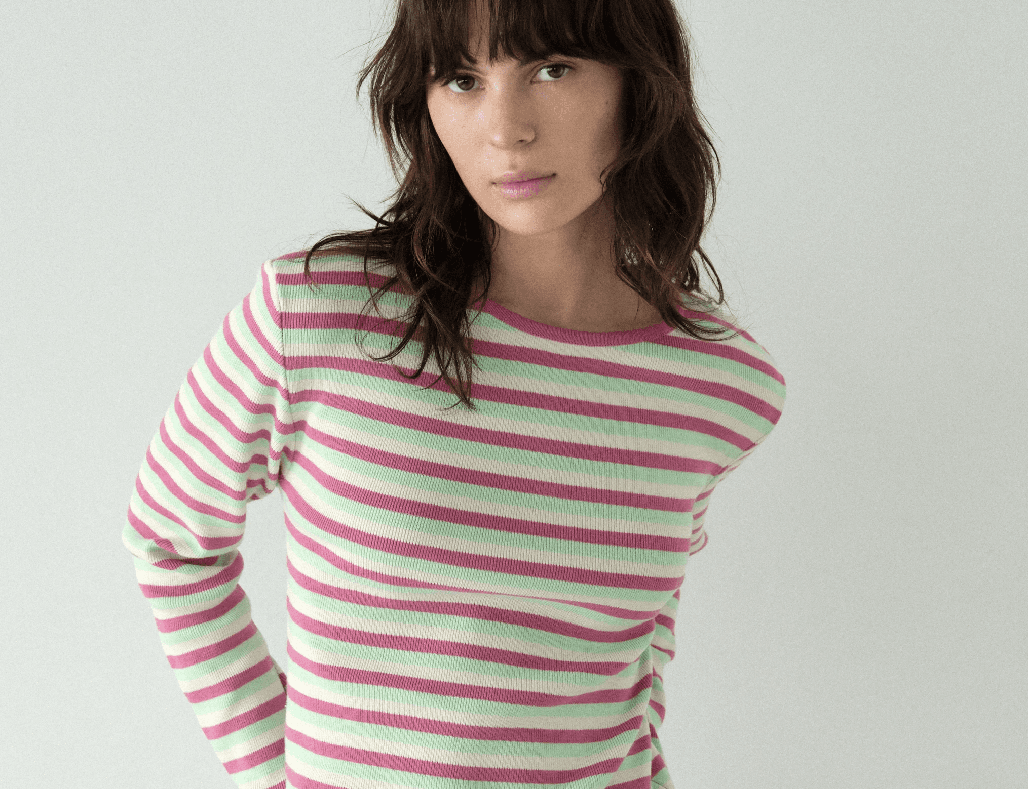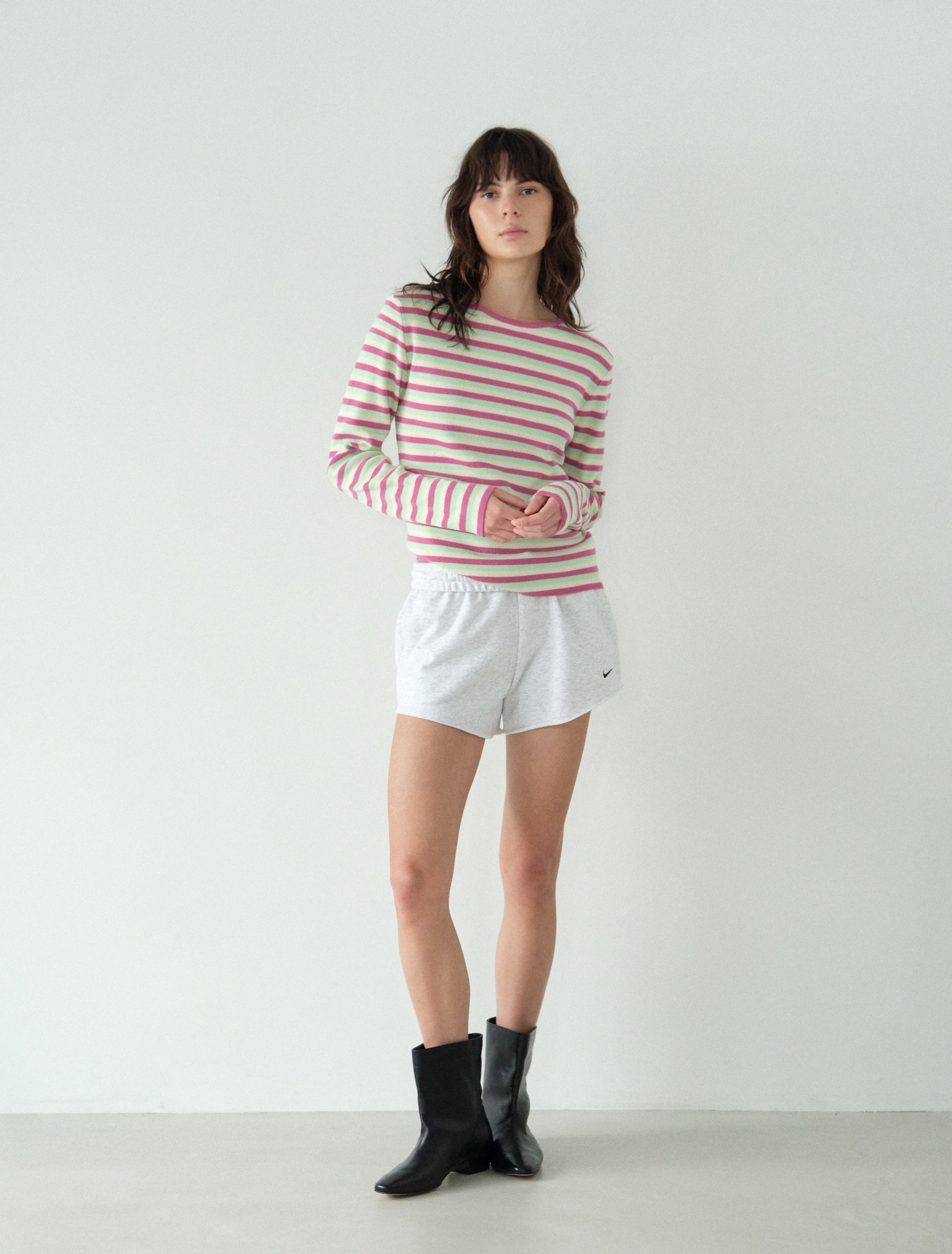 티셔츠처럼 편하게 입을 수 있는 두께감의 니트로 활용도가 높고, 얇고 부드러운 착용감으로 사계절 가볍게 입기 좋은 제품입니다. 목 옆선 라인과 긴 소매 기장, 여유 있는 암홀과 자연스럽게 떨어지는 밑단 기장으로 루즈하지만 날씬해 보이는 핏에 중점을 두었습니다.