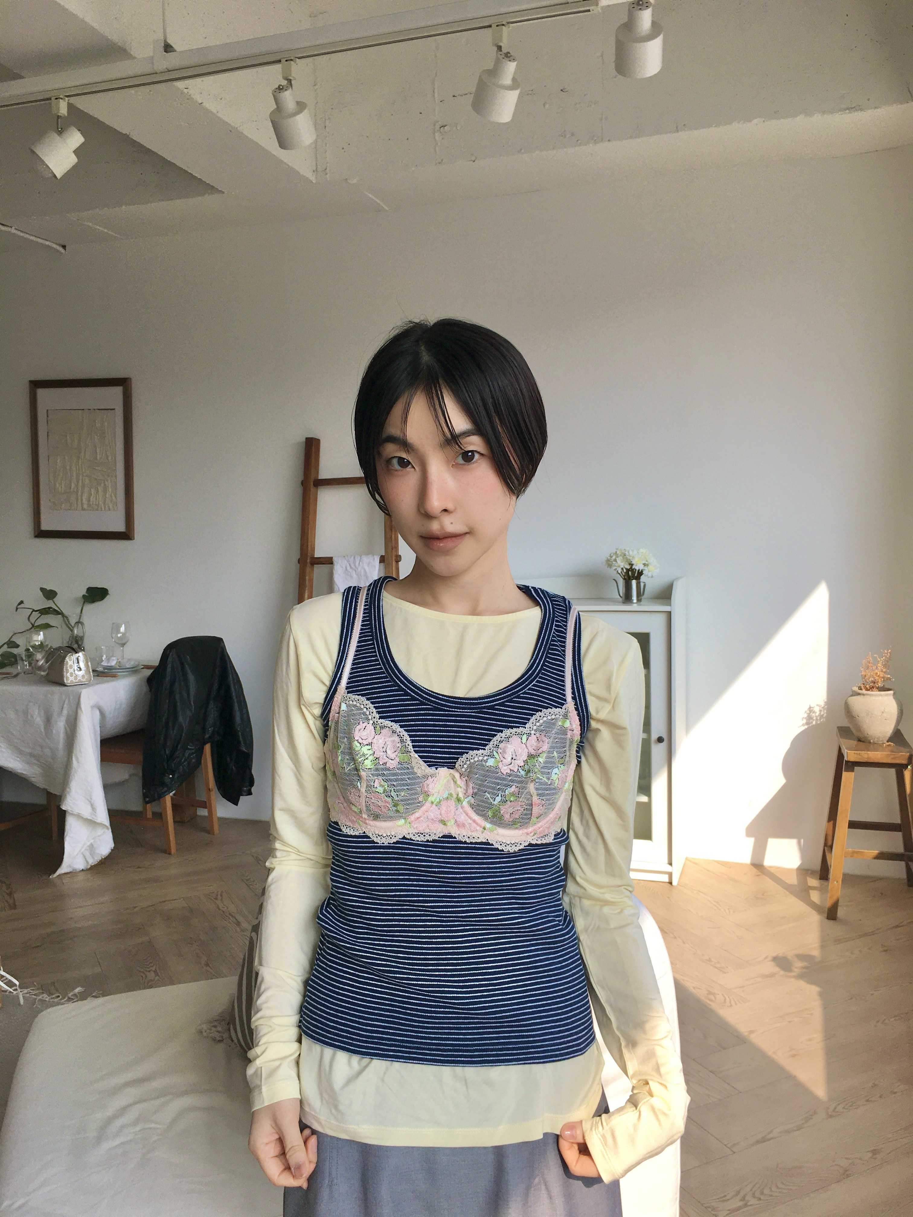 세미 보트넥 라인과 7부 슬리브로 레이어드 스타일링에 활용하기 좋은 스트라이프 티셔츠입니다.
